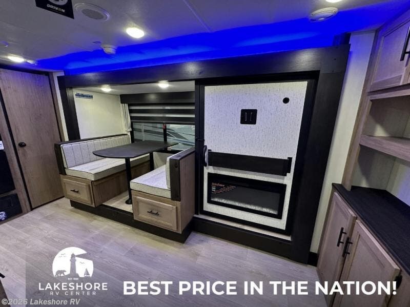 You'll love every minute spent in this single slide out travel trailer, whether you're cooking dinner on the outside kitchen or in the rear kitchen, relaxing on the sofa across from the fireplace, or sleeping on the RV king bed in the front master bedroom! There are hidden shelves behind the fireplace for convenient storage, and the booth dinette within the slide provides a place to dine together. The walk-thru bath is spacious, and includes a tub/shower, toilet, and sink with counter space.