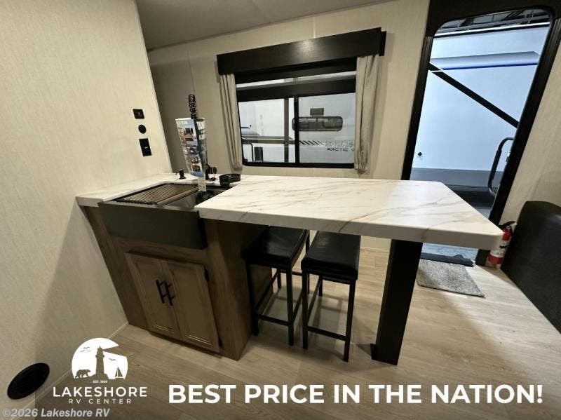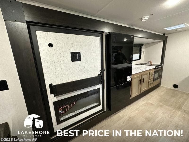 This travel trailer will feel just like home with its RV king bed in the front bedroom plus the full bath with a tub/shower, and there is a spacious living area thanks to the large slide out. Here, you'll find the air fryer and counter space, 12V refrigerator, and the fireplace with a hidden pantry behind it. Your crew can relax on the L-shaped sofa, or visit with the chef while they prep meals at the island peninsula. There are even two bar stools here for added convenience. Head outdoors to enjoy the power awning with LED lights in the evening!