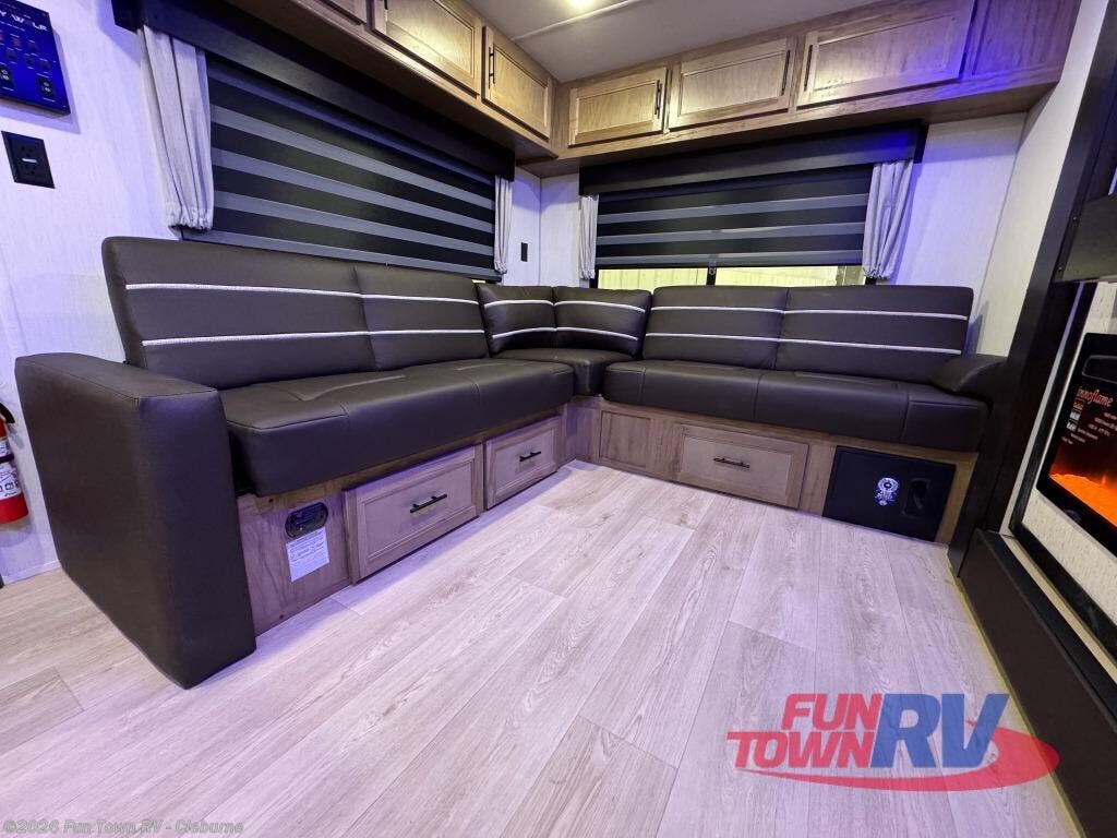 This travel trailer will feel just like home with its RV king bed in the front bedroom plus the full bath with a tub/shower, and there is a spacious living area thanks to the large slide out. Here, you'll find the air fryer and counter space, 12V refrigerator, and the fireplace with a hidden pantry behind it. Your crew can relax on the L-shaped sofa, or visit with the chef while they prep meals at the island peninsula. There are even two bar stools here for added convenience. Head outdoors to enjoy the power awning with LED lights in the evening!