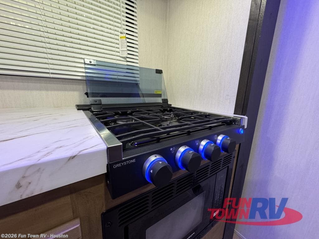 This travel trailer will feel just like home with its RV king bed in the front bedroom plus the full bath with a tub/shower, and there is a spacious living area thanks to the large slide out. Here, you'll find the air fryer and counter space, 12V refrigerator, and the fireplace with a hidden pantry behind it. Your crew can relax on the L-shaped sofa, or visit with the chef while they prep meals at the island peninsula. There are even two bar stools here for added convenience. Head outdoors to enjoy the power awning with LED lights in the evening!