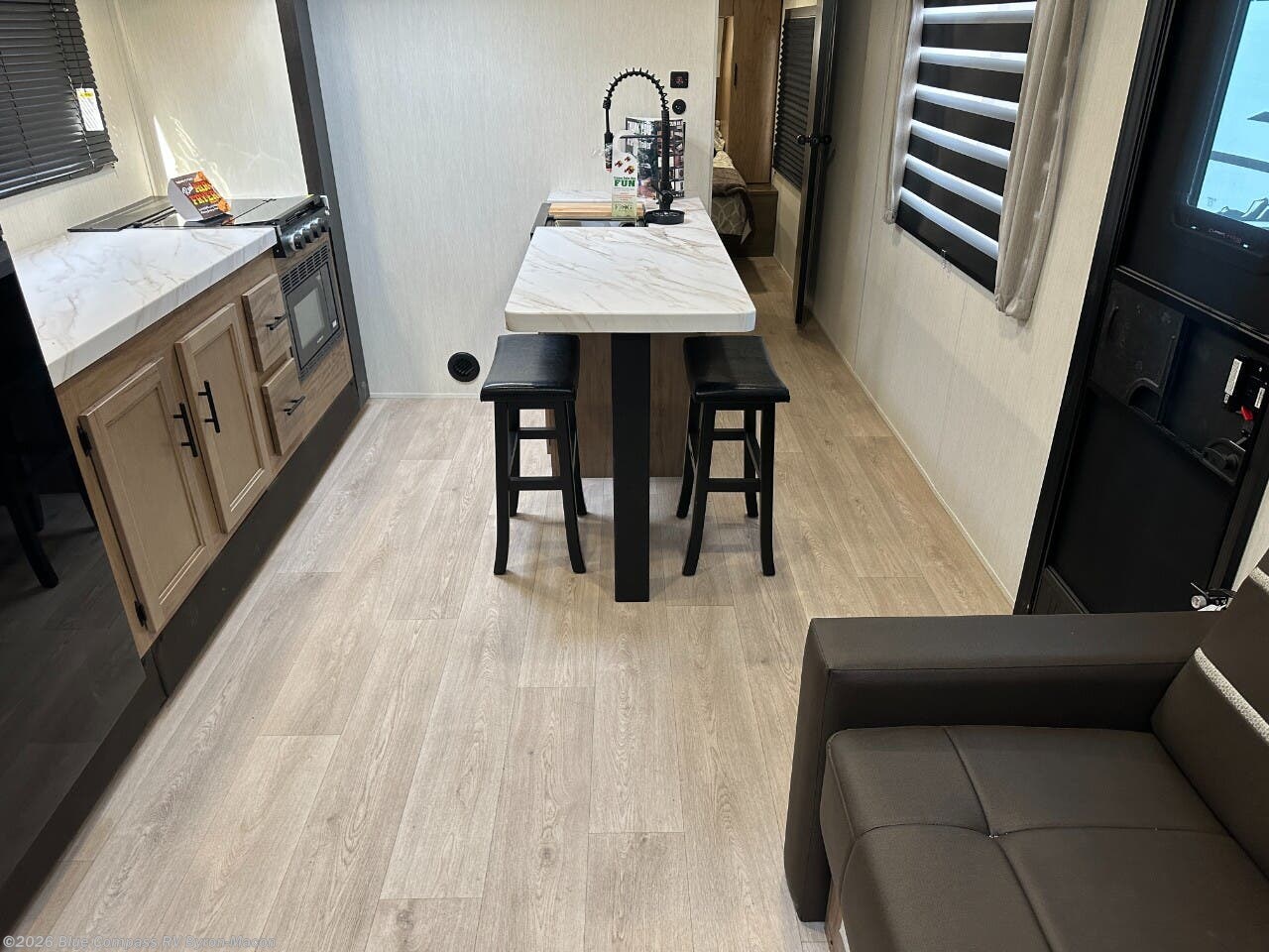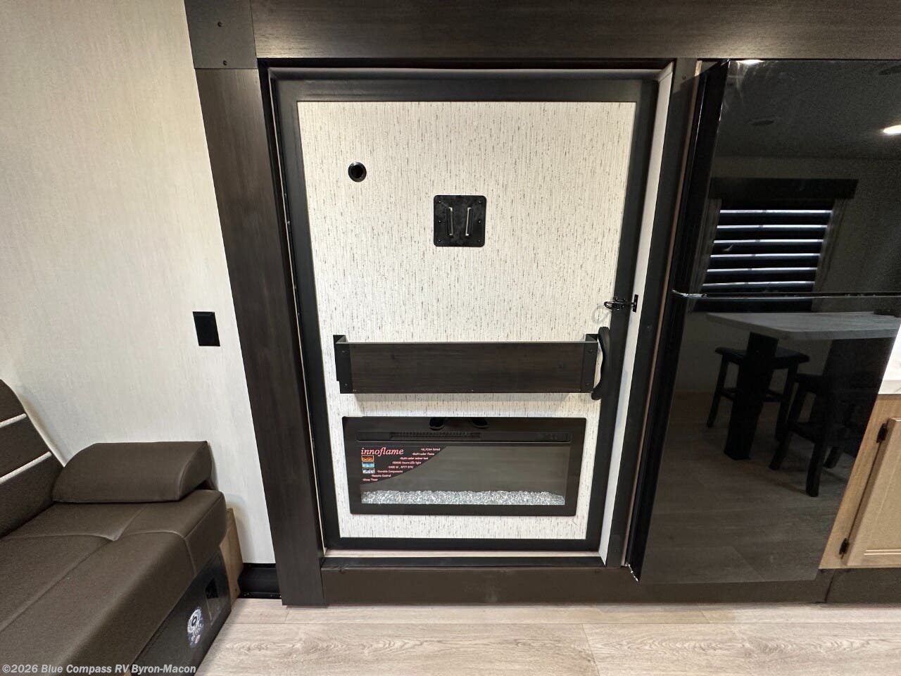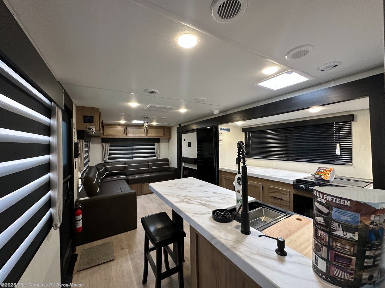 This travel trailer will feel just like home with its RV king bed in the front bedroom plus the full bath with a tub/shower, and there is a spacious living area thanks to the large slide out. Here, you'll find the air fryer and counter space, 12V refrigerator, and the fireplace with a hidden pantry behind it. Your crew can relax on the L-shaped sofa, or visit with the chef while they prep meals at the island peninsula. There are even two bar stools here for added convenience. Head outdoors to enjoy the power awning with LED lights in the evening!