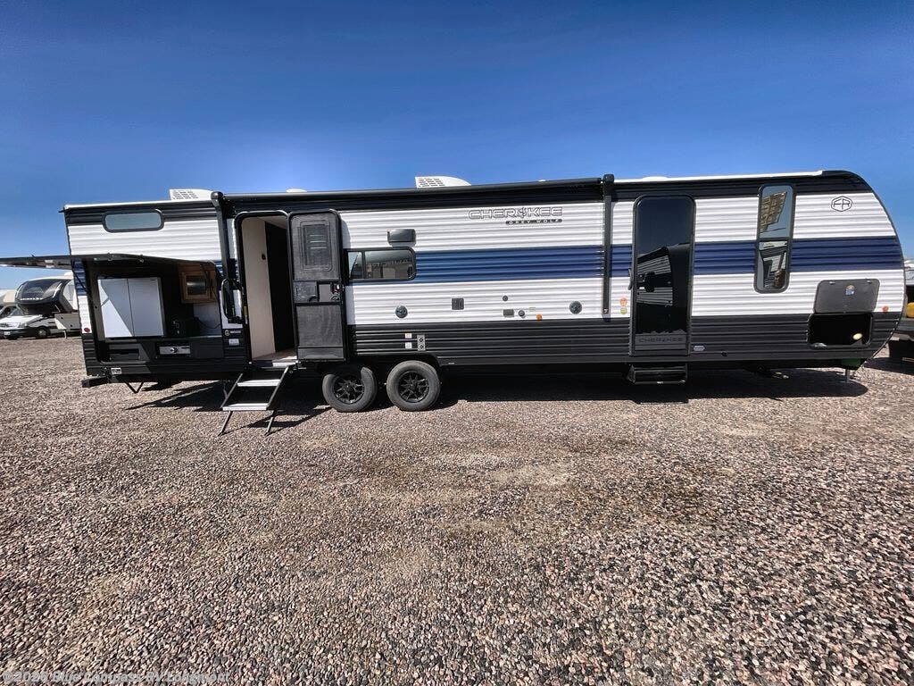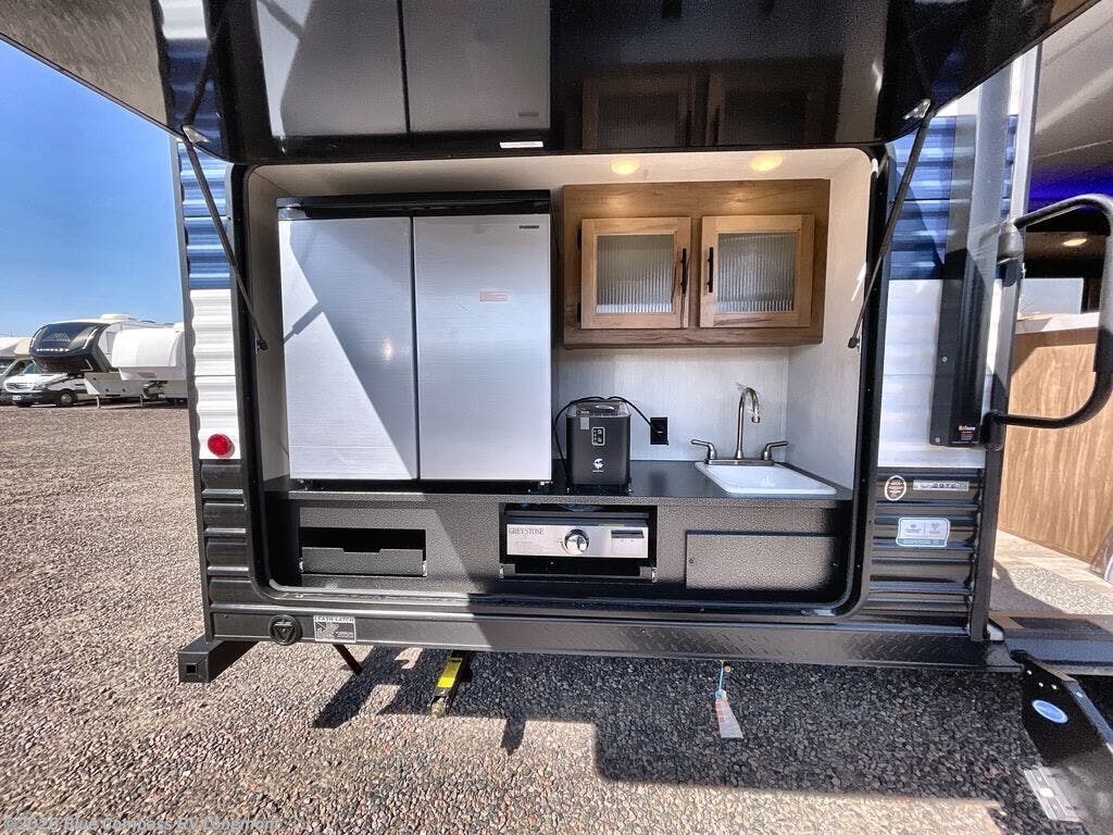 Your larger family will love spending weekends away with this Cherokee Grey Wolf travel trailer as their home away from home. This model offers lots of sleeping space with three bunk beds in the rear private bunkhouse. In the front, there is a master suite with wardrobes and nightstands on either side of the RV king bed, and it even has private access to the dual-entry bath. The two entry doors will make accessing the trailer easy for everyone, and you will appreciate the abundant storage throughout this unit including large overhead cabinets, a spacious pantry, and numerous outside storage compartments for all of your outdoor gear. There's even an outside bar & grill!
