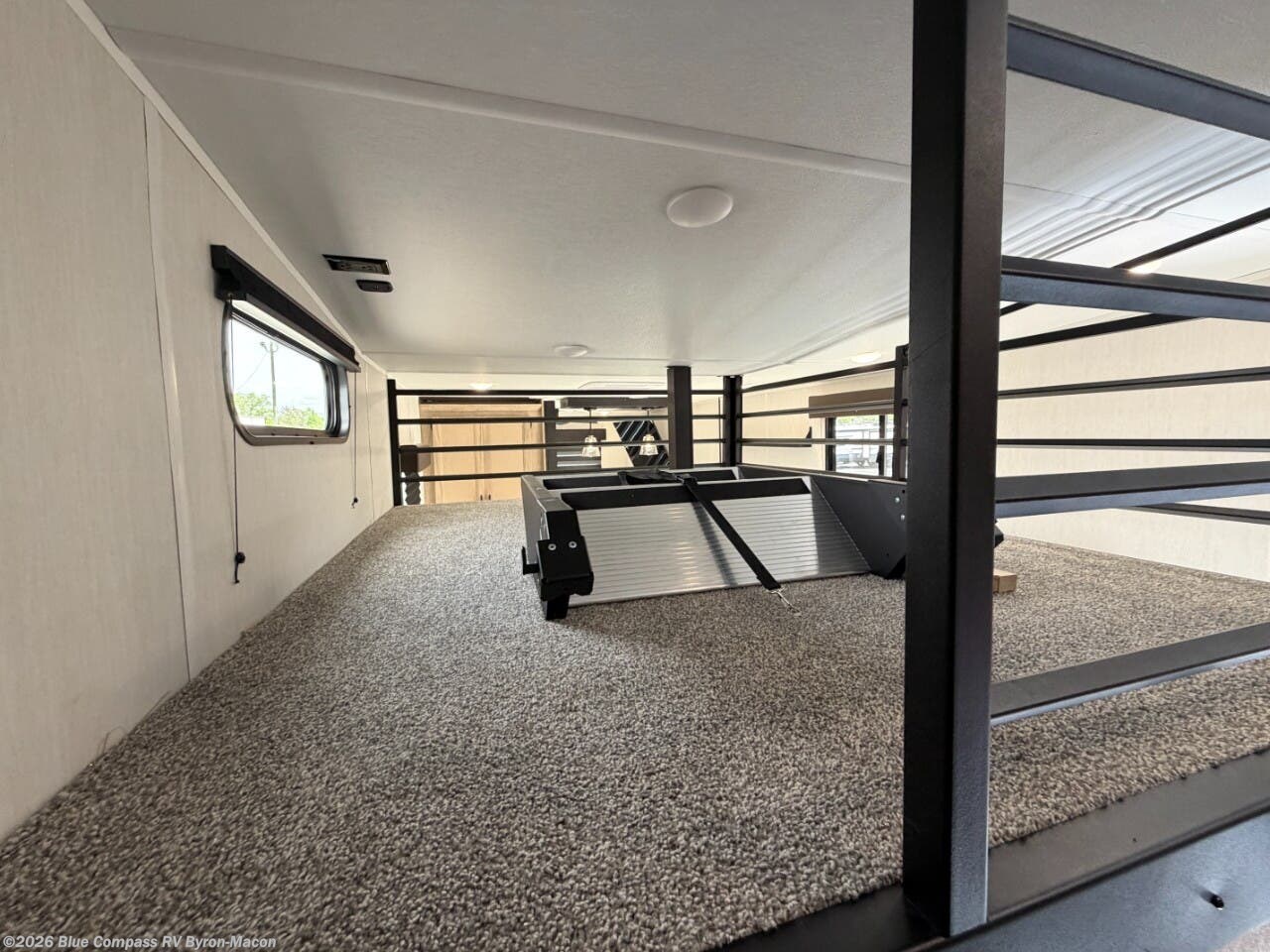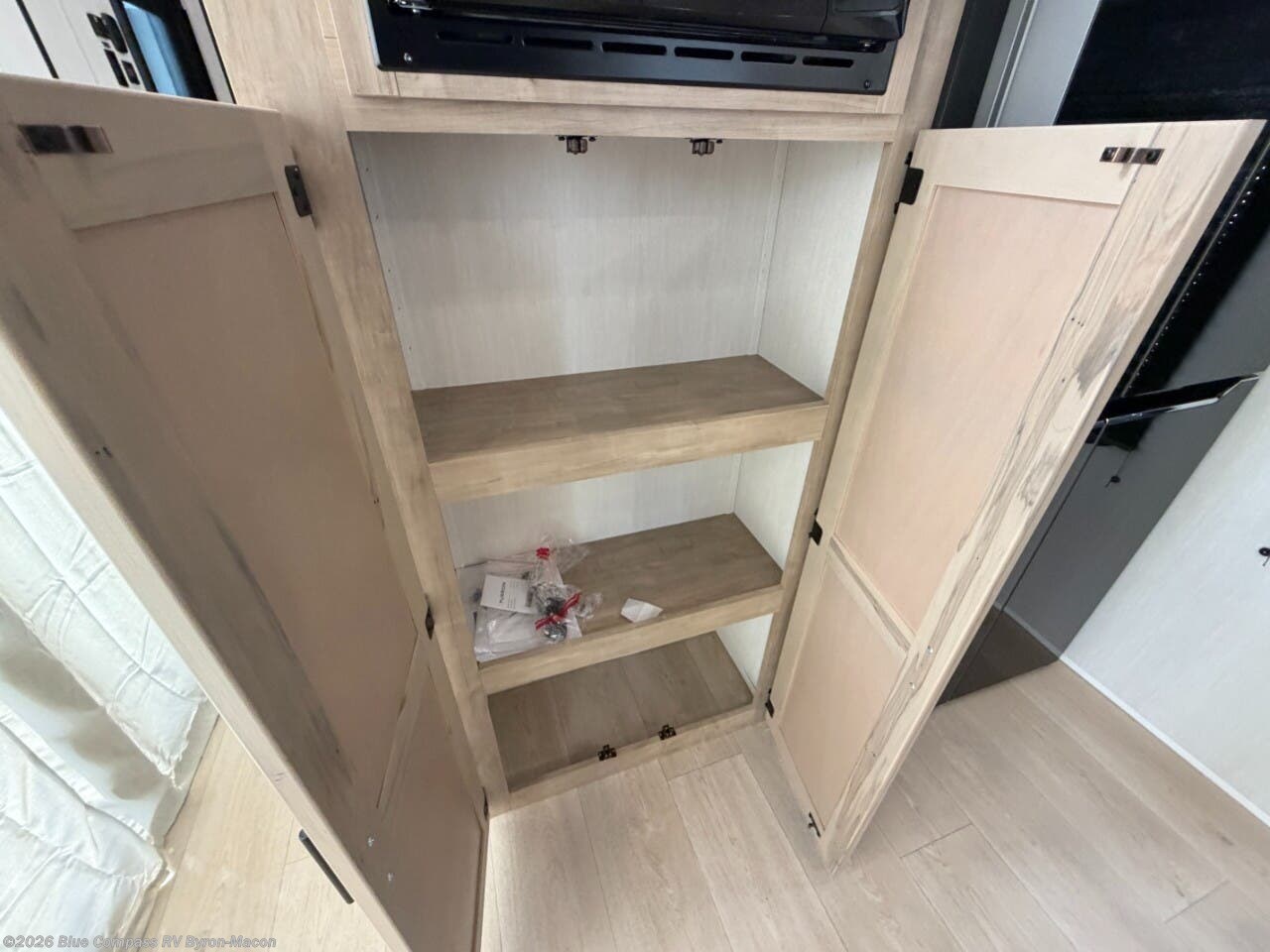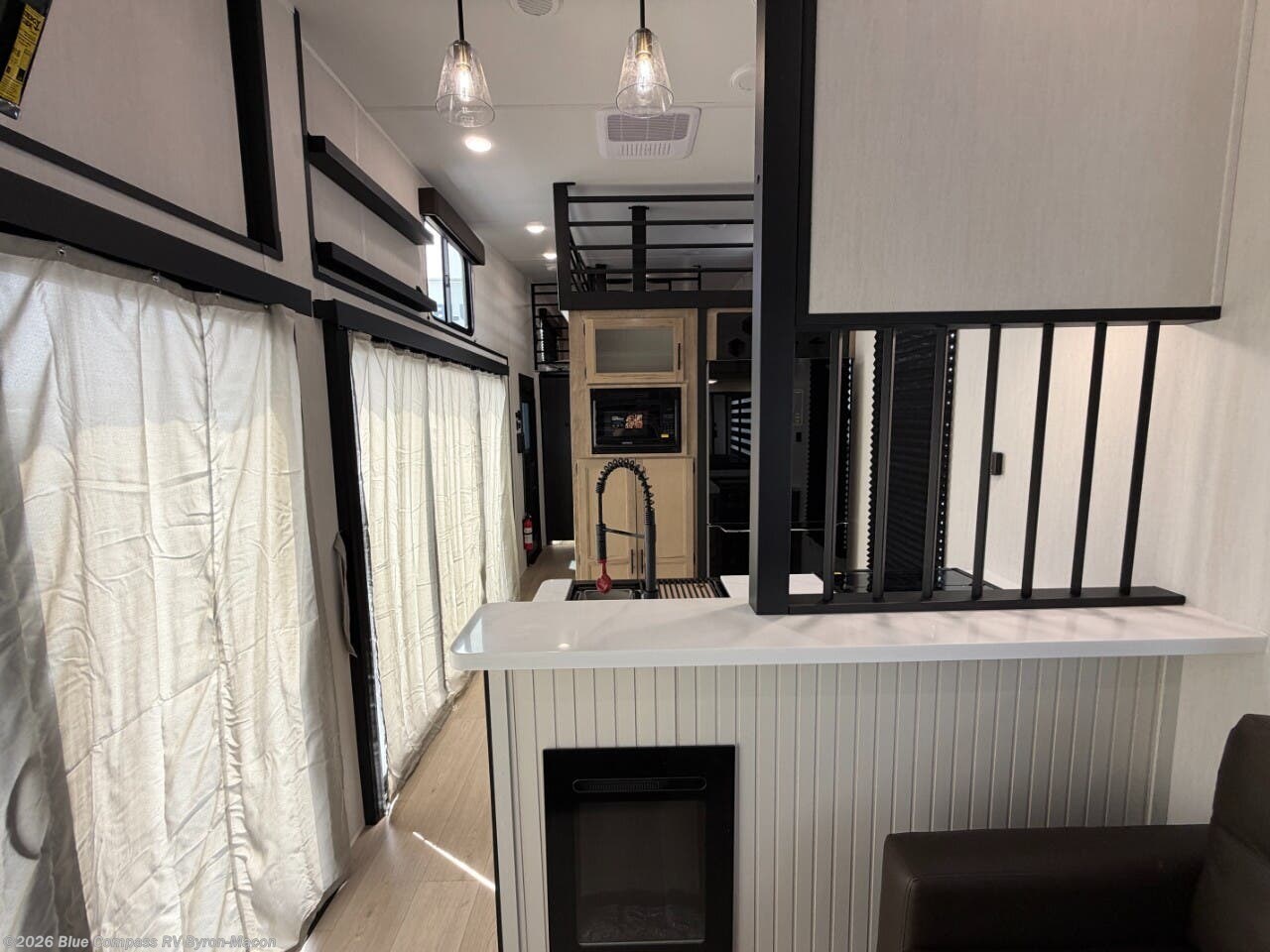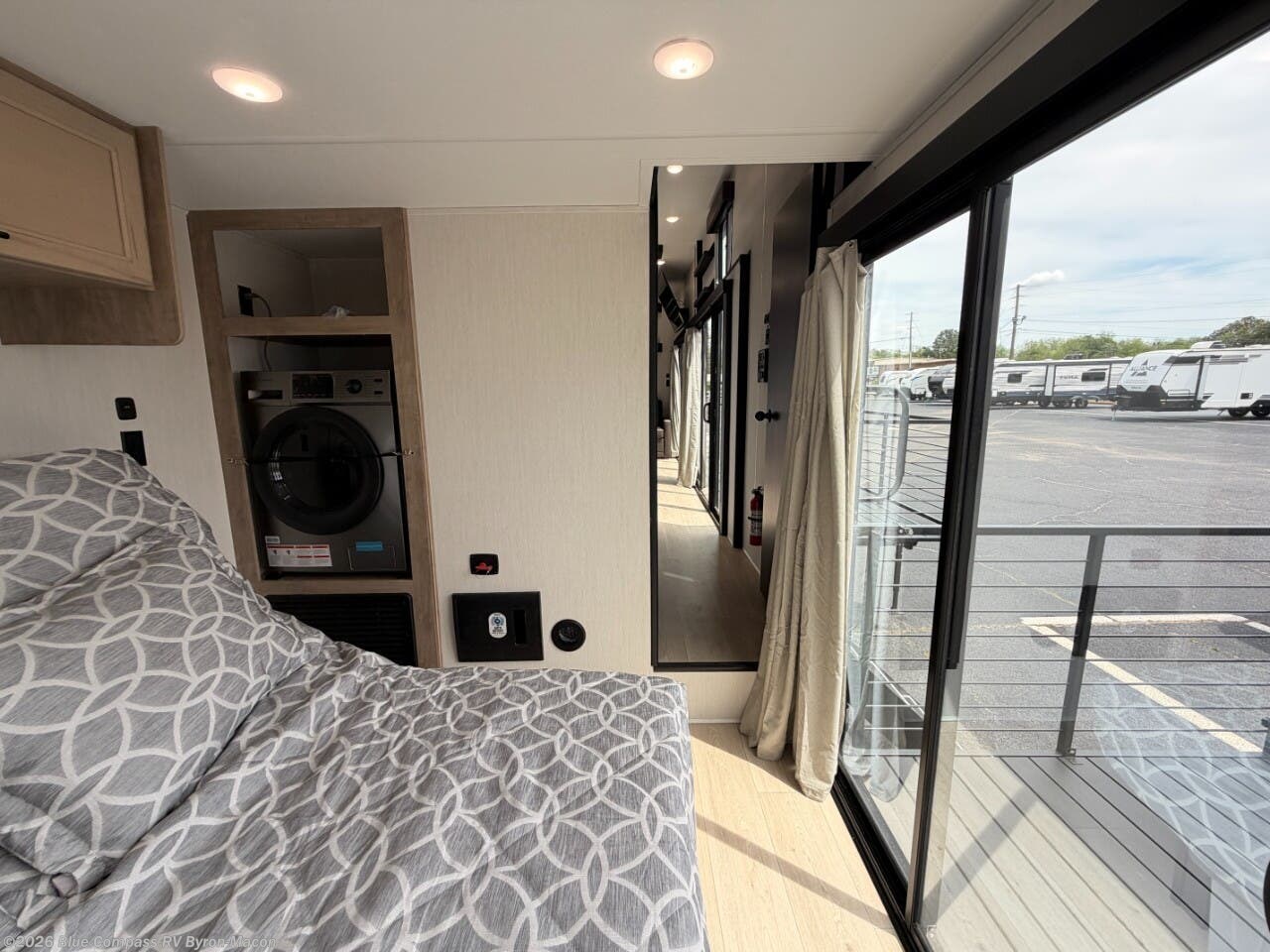You'll feel right at home in this feature-packed destination trailer! The rear private bedroom features one of the dual entry doors, an RV king bed, and a side patio for great outdoor views! There is also a wardrobe with washer/dryer prep if you want the option to add these appliances. Above the bedroom, you'll find a loft with a queen bed, a fireplace and a storage cabinet to keep the space tidy. The chef of your group can whip up their best meals in the middle kitchen, and there is a spacious pantry to keep snacks stocked. Your crew can relax on the L-shaped sofa in the front living room, enjoy the fireplace and TV, or just take in the outdoor views provided by the huge side patio!