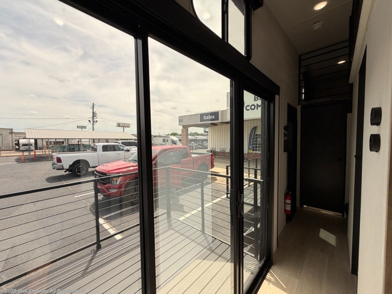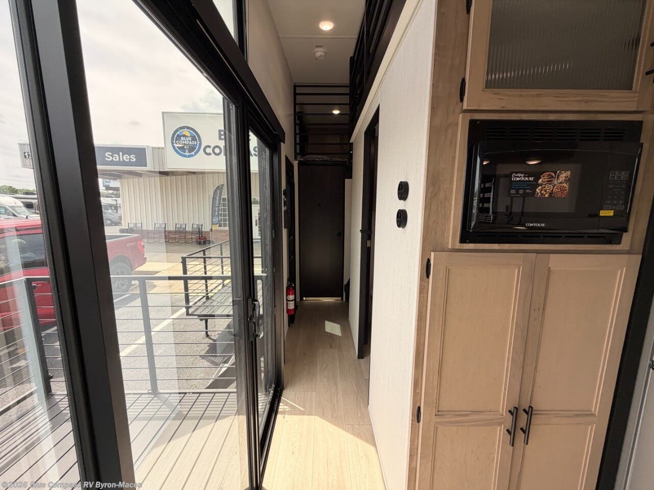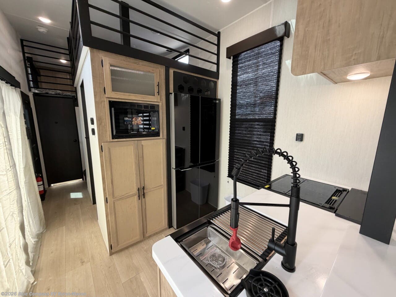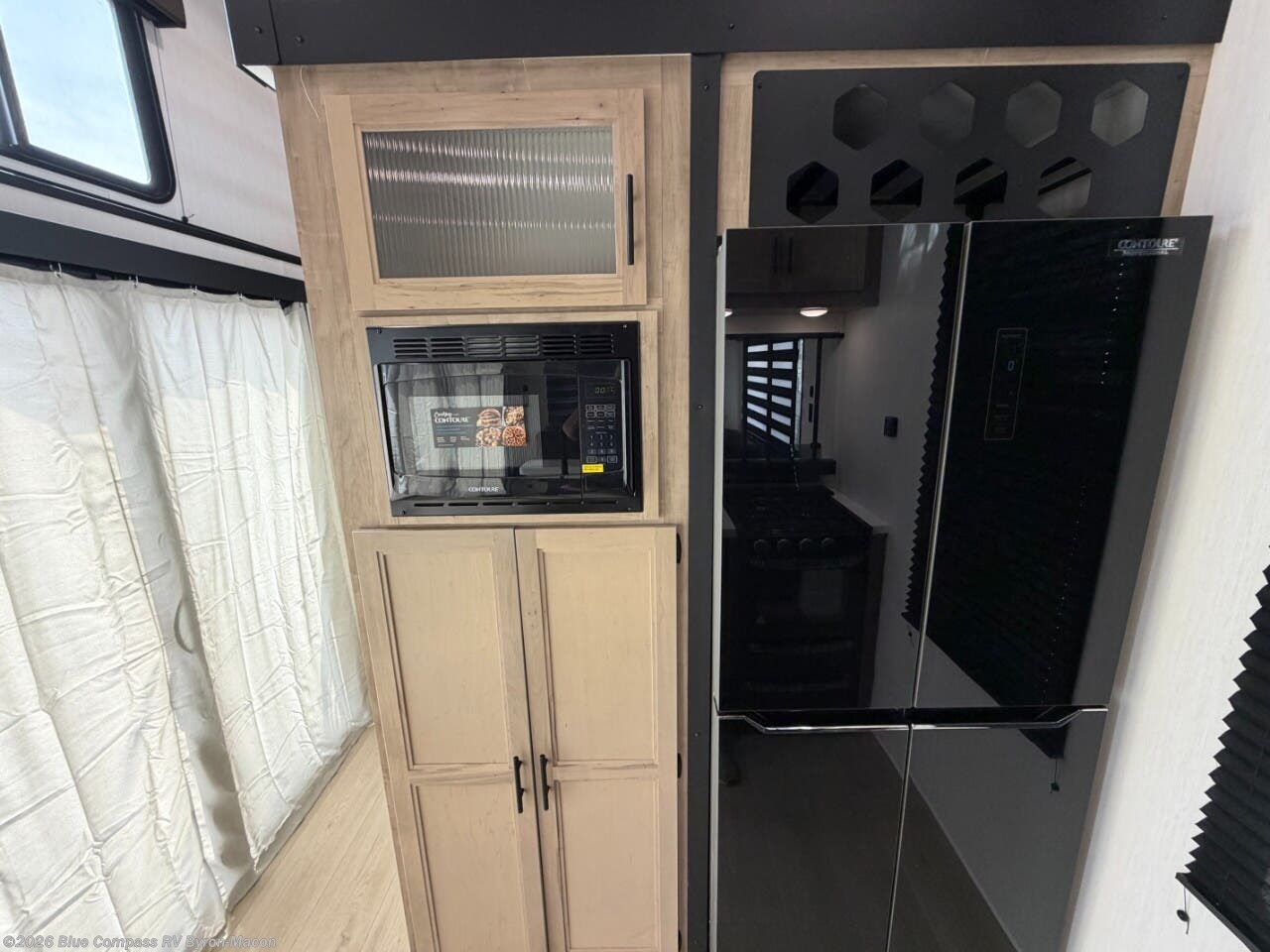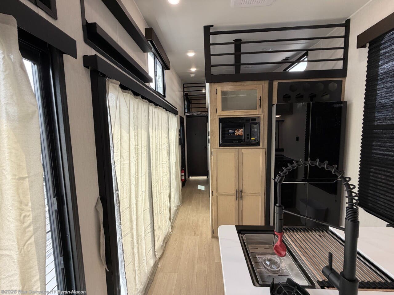 You'll feel right at home in this feature-packed destination trailer! The rear private bedroom features one of the dual entry doors, an RV king bed, and a side patio for great outdoor views! There is also a wardrobe with washer/dryer prep if you want the option to add these appliances. Above the bedroom, you'll find a loft with a queen bed, a fireplace and a storage cabinet to keep the space tidy. The chef of your group can whip up their best meals in the middle kitchen, and there is a spacious pantry to keep snacks stocked. Your crew can relax on the L-shaped sofa in the front living room, enjoy the fireplace and TV, or just take in the outdoor views provided by the huge side patio!