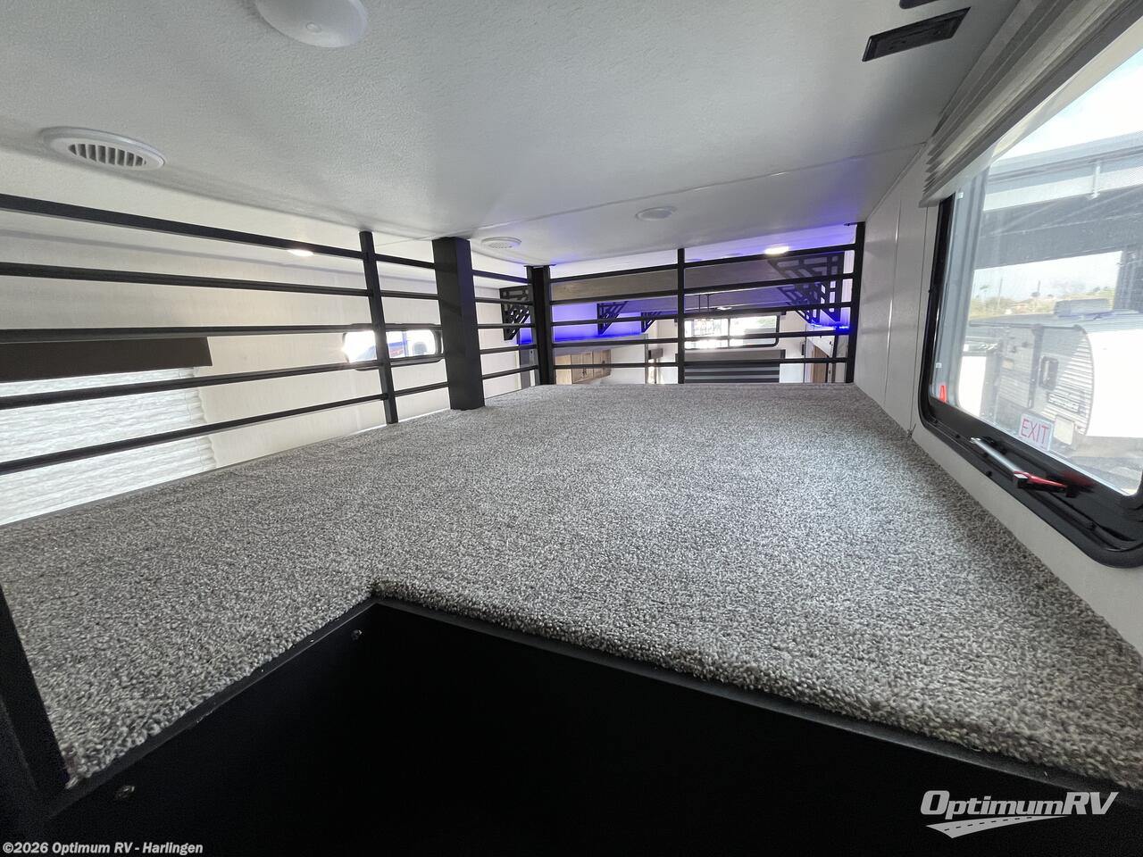 This destination trailer is an excellent and accommodating trailer that will make you feel right at home as soon as you enter through one of the two entry doors. The front private bedroom has a king bed slide and lots of storage with a wardrobe and a linen closet. There is also an entertainment center where you can add your own TV and the bedroom even has a second exterior entry door so that you can come and go as you please. Above the bedroom is where the huge loft is located. When you take the stairs up to the loft, you'll find two 36" x 74" bunk mats, cabinets, and a large open area with a railing. The main living area has a free-standing dinette with chairs, theater seats, and a hide-a-bed sofa, so you will have plenty of seating as you watch the main entertainment center.