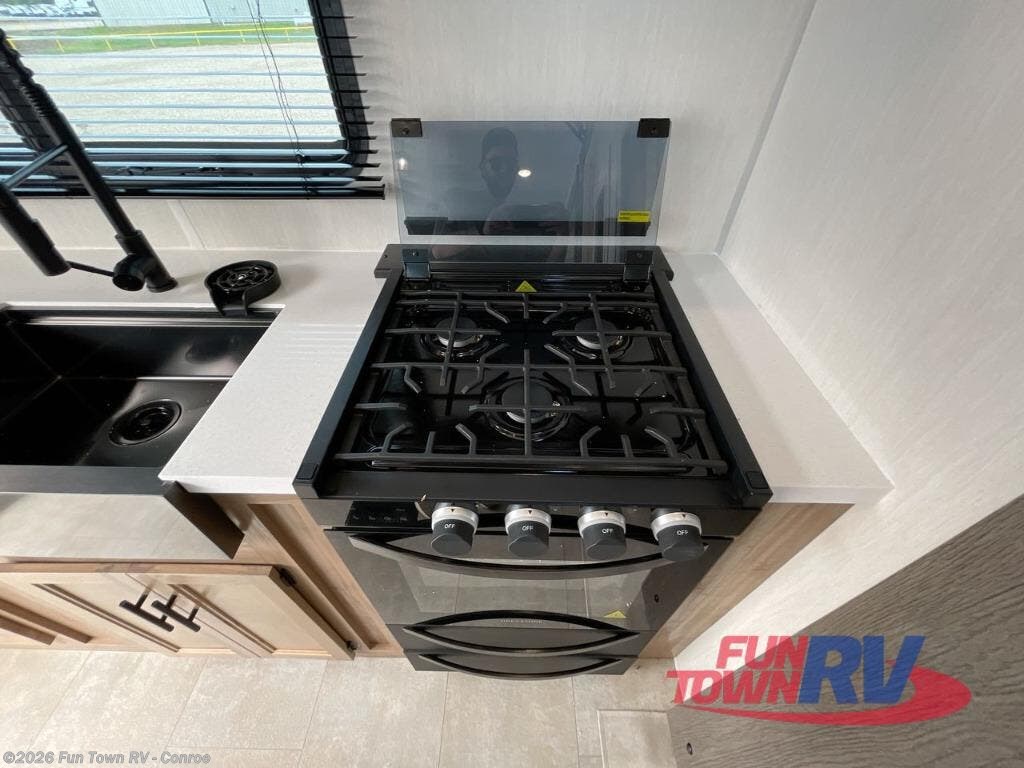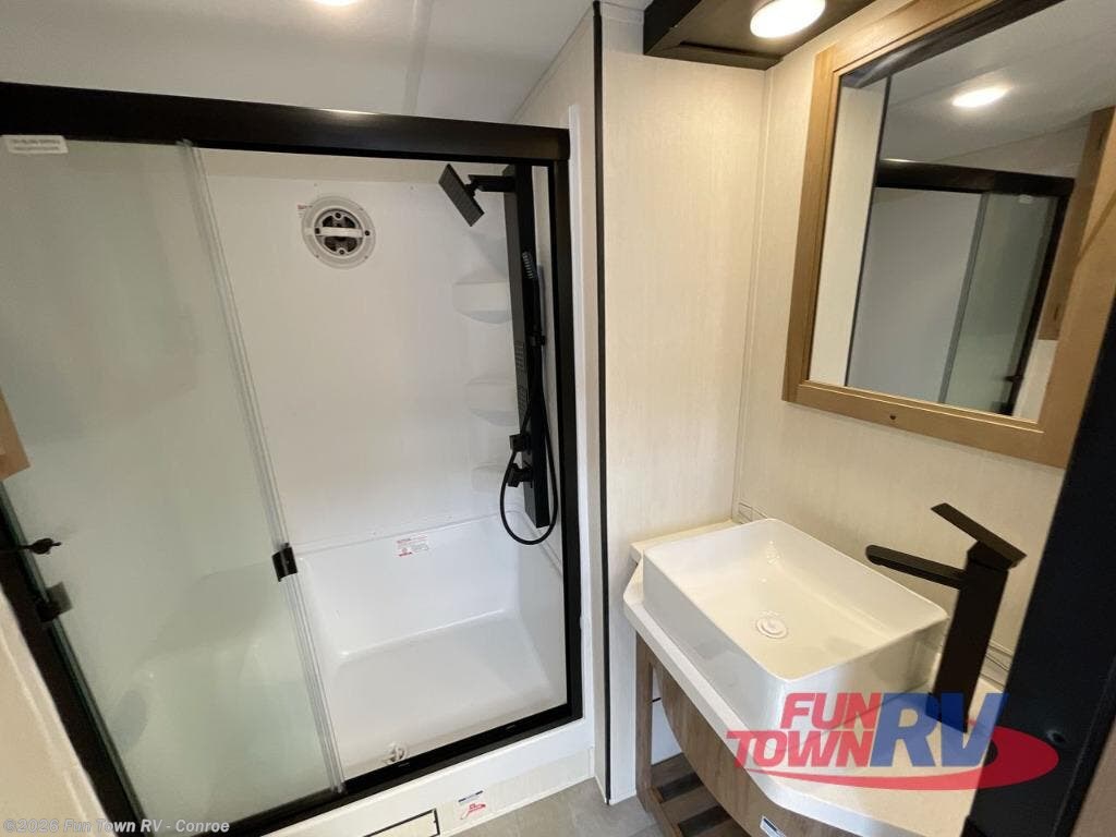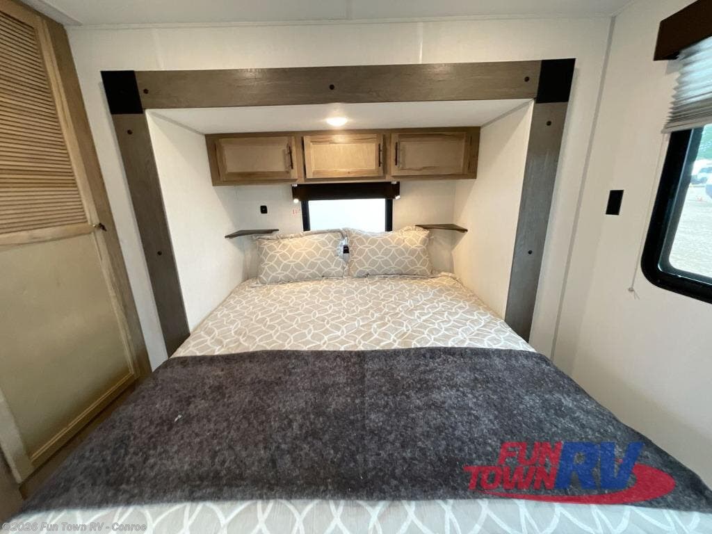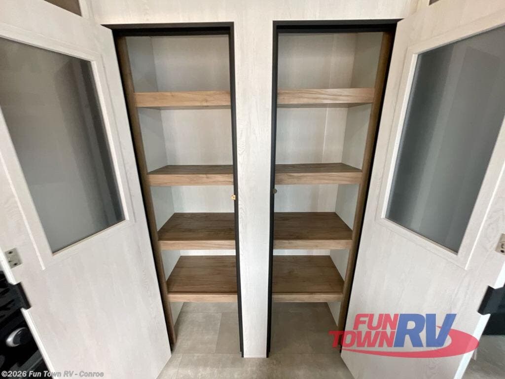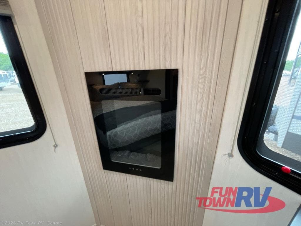 Time spent in this destination trailer will be time well spent! You will appreciate dual entry doors for maximum convenience, plus a spacious full bath that is close by the front private bedroom! Your crew can relax in the middle living area on the L-shaped hide-a-bed sofa or on the two lounge chairs. The rear kitchen will be any chef's dream with its island with six stools and all the appliances to create meals each day. This model also features triple slides so you can enjoy more space to relax. The front bedroom includes a king bed slide out, a desk with drawers, and a bedroom fireplace. And above this room is where you'll find the spacious loft with two bunk mats, storage, and space for the little ones to play!