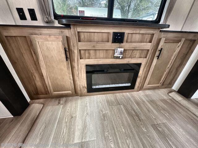 Affordable luxury and livability is what you will find in this travel trailer! The rear living area has opposing sofa slides, two recliners, a rear entertainment center with a fireplace, and a panoramic window for added natural lighting. There is even a bar top with two bar stools overlooking the living area so you can enjoy a meal and a movie. The booth dinette slide has a full door pantry next to it so you can quickly grab a snack during game night. Freshen up each morning in the full bathroom with the shower with a seat. The front private bedroom has a walk around RV king bed for a good night's rest and a linen closet with optional washer and dryer prep. You even have an outside kitchen, a rear storage rack, outside storage areas, and an outside TV mount!