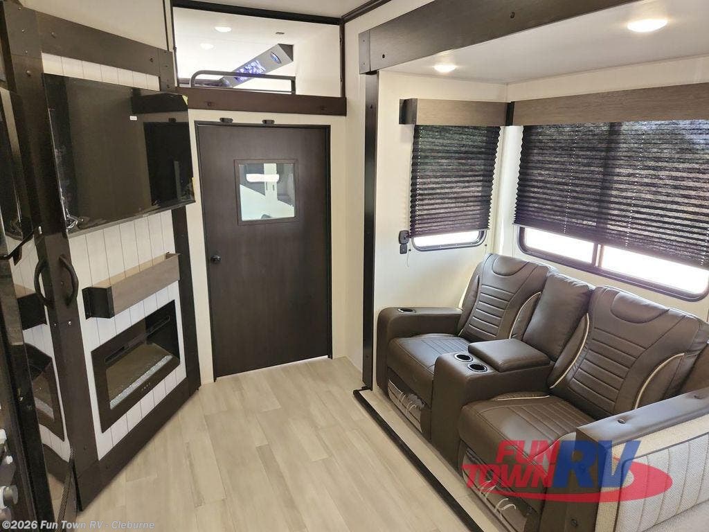 Fun at the campground begins with this dual entry toy hauler in tow! There is a 15' separate garage with glass patio doors, a loft above for guests, plus a patio deck to entertain guests. Your crew can get comfy on the theater seating or booth dinette, and there is an entertainment center with a fireplace and a hidden pantry for snacks. The chef of your group will love the full interior kitchen, along with an outdoor kitchen when the weather is nice. A full bath lets you freshen up after a trail ride, and the front private bedroom gives you your own space at night. This unit also features washer and dryer prep in the bedroom so you can add those appliances if you wish!