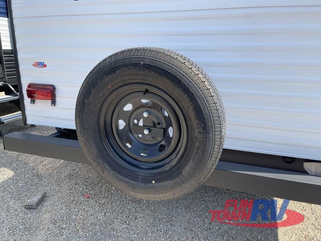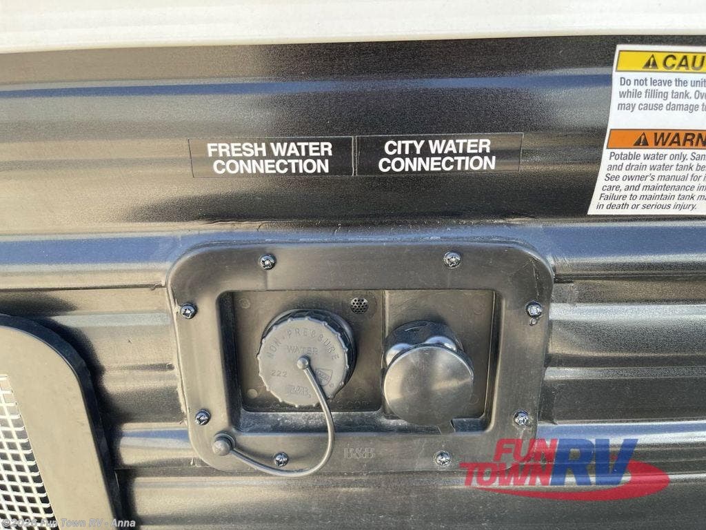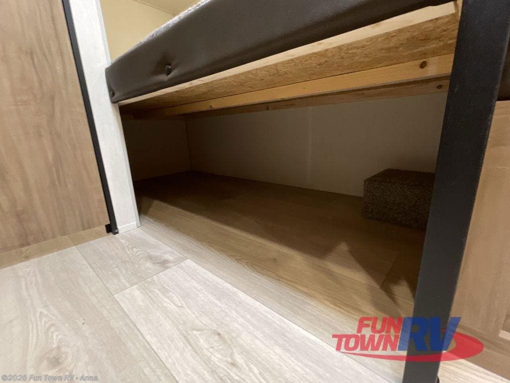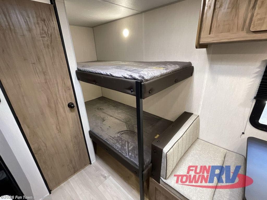 The whole family can sleep comfortably in this travel trailer! It has a set of bunk beds for the kids to sleep on, and you can sleep comfortably on the front queen bed with overhead cabinets and a shelf. The chef will enjoy preparing their best home cooked meals with the high output cooktop, and you can dine at the booth dinette. And the private bath onboard means you won't have to leave your camper in the middle of the night!