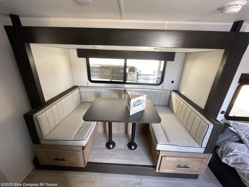 This family travel trailer is ready to head to the campground whenever you are! The kiddos can sleep on the set of double-size bed bunks and you can sleep on the front queen bed, plus the U-shaped dinette slide can also transform into an extra sleeping space when you aren't using it to enjoy a meal prepared with the high output cooktop. You can also prepare your delicious meals at the outside mini kitchen and stay protected by the power awning. The exterior not only has outside storage and an outside TV mount, but also features an outside storage plus door for access to the storage space underneath the bottom bunk bed. The rear corner bath allows everyone to stay clean and refreshed while you camp.