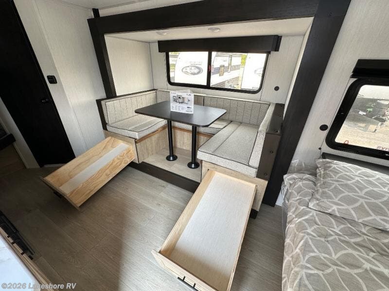 This family travel trailer is ready to head to the campground whenever you are! The kiddos can sleep on the set of double-size bed bunks and you can sleep on the front queen bed, plus the U-shaped dinette slide can also transform into an extra sleeping space when you aren't using it to enjoy a meal prepared with the high output cooktop. You can also prepare your delicious meals at the outside mini kitchen and stay protected by the power awning. The exterior not only has outside storage and an outside TV mount, but also features an outside storage plus door for access to the storage space underneath the bottom bunk bed. The rear corner bath allows everyone to stay clean and refreshed while you camp.