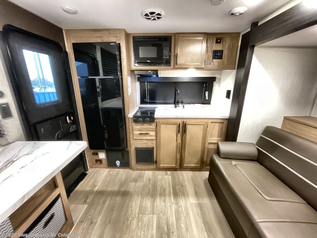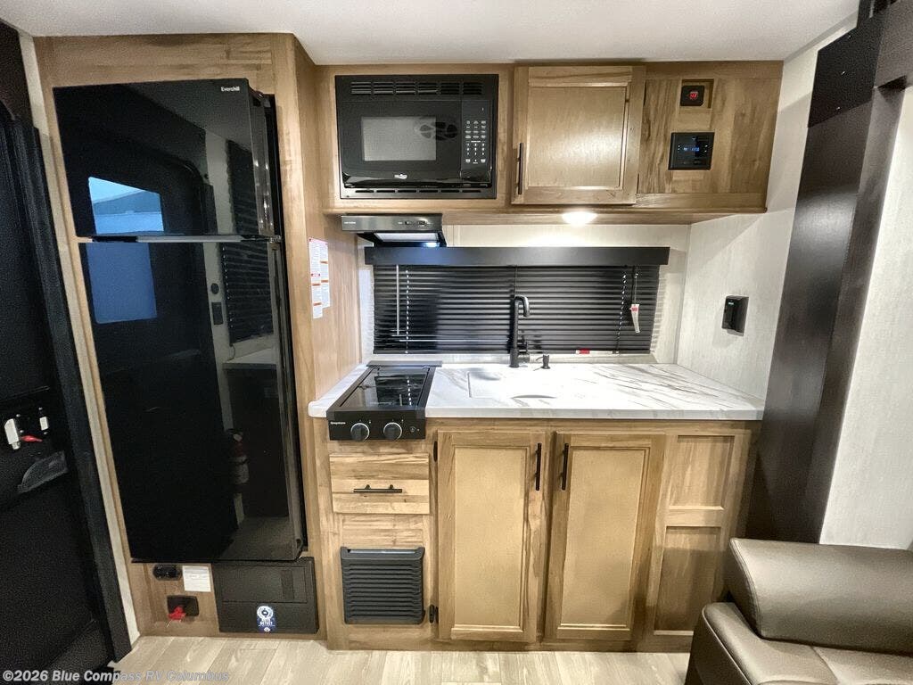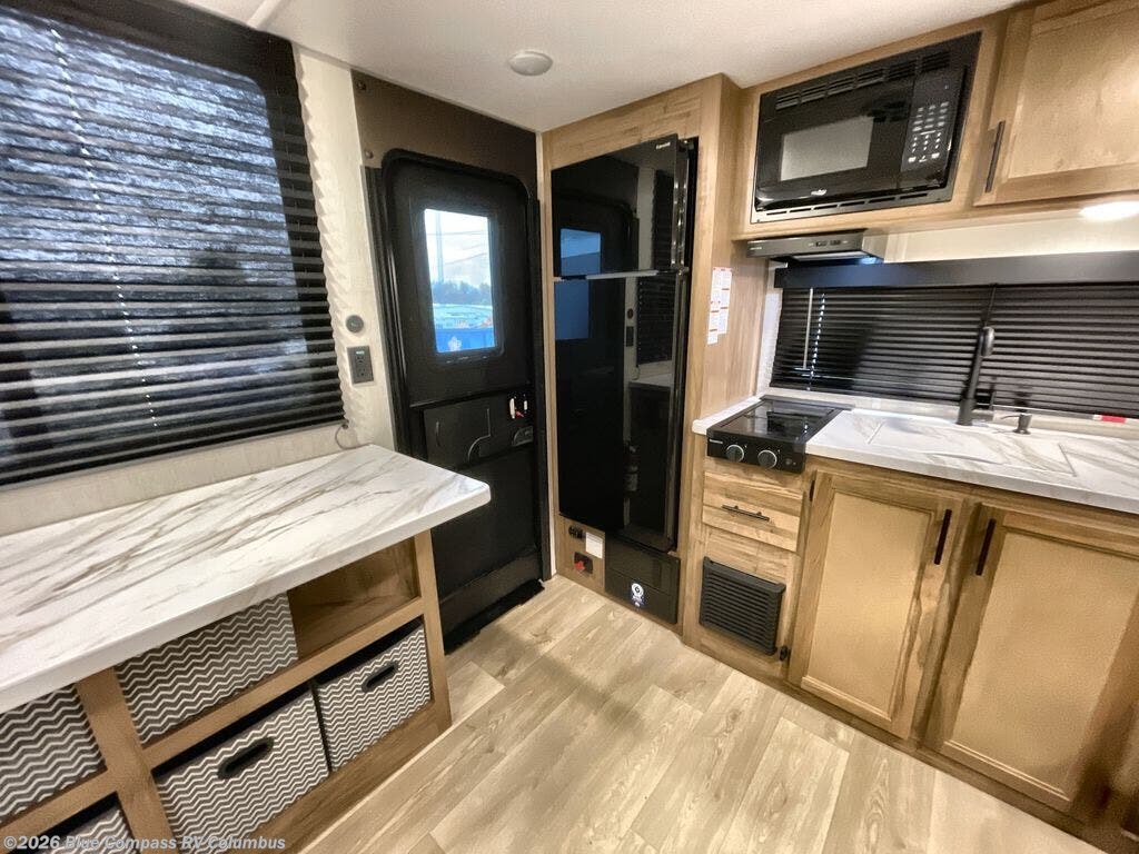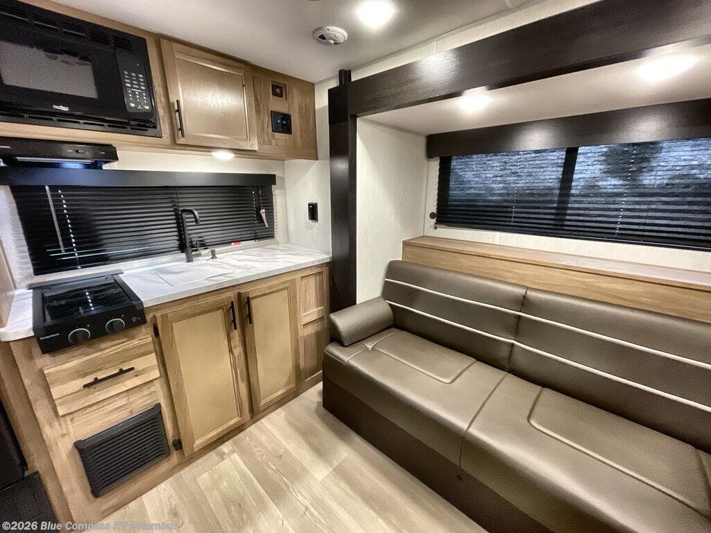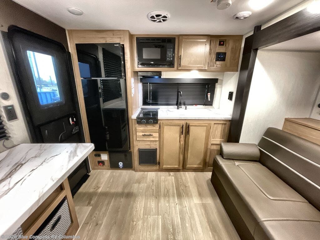 Convenient camping is found with this lightweight travel trailer! Once you arrive at your destination, put out the power awning, then make lunch on the exterior mini kitchen. Inside, you can dine at the bar top with stools, freshen up in the tub/shower, and sleep soundly on the queen bed in the master bedroom. There is also a sofa slide out to provide additional seating, sleeping, and interior space! And you're sure to find plenty of storage spaces both inside and outside, including a rear storage rack!