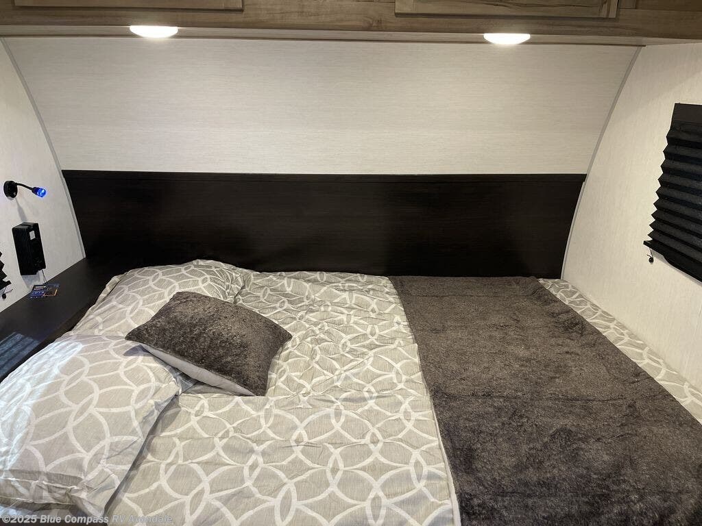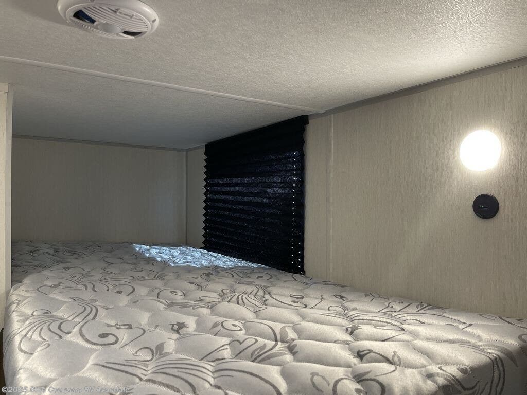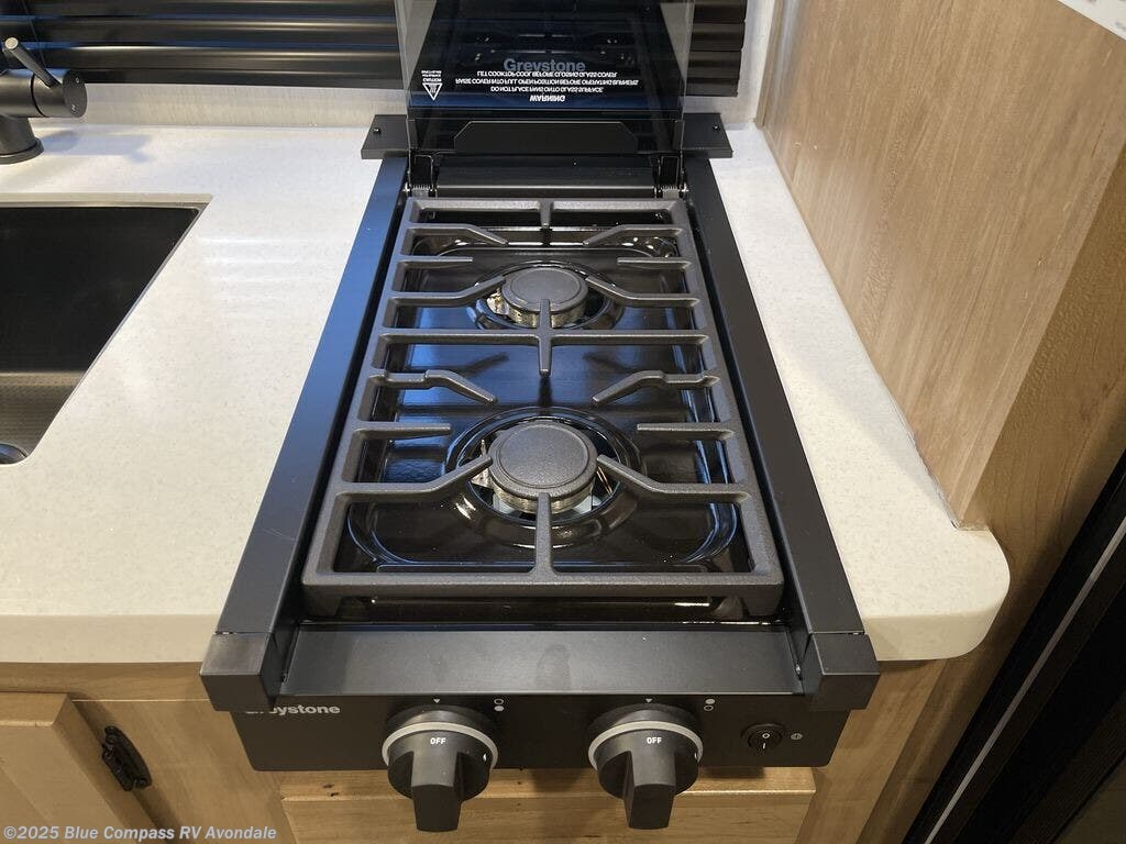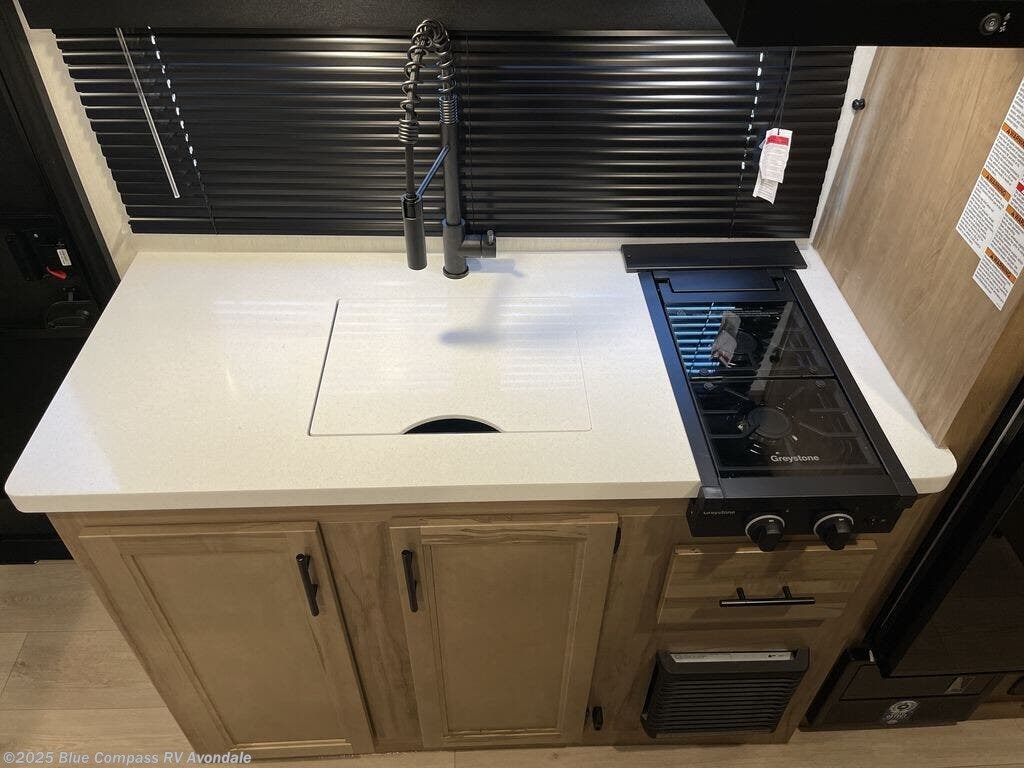 The whole family can sleep comfortably in this travel trailer! It has a set of bunk beds for the kids or guests to sleep on, and you can sleep comfortably on the front queen bed with overhead cabinets and a shelf. There is even an exterior storage plus door that accesses the storage space under the bottom bunk. The chef will enjoy preparing their best home cooked meals either indoors with the high output cooktop or at the outside mini kitchen while staying protected by the 12' power awning!