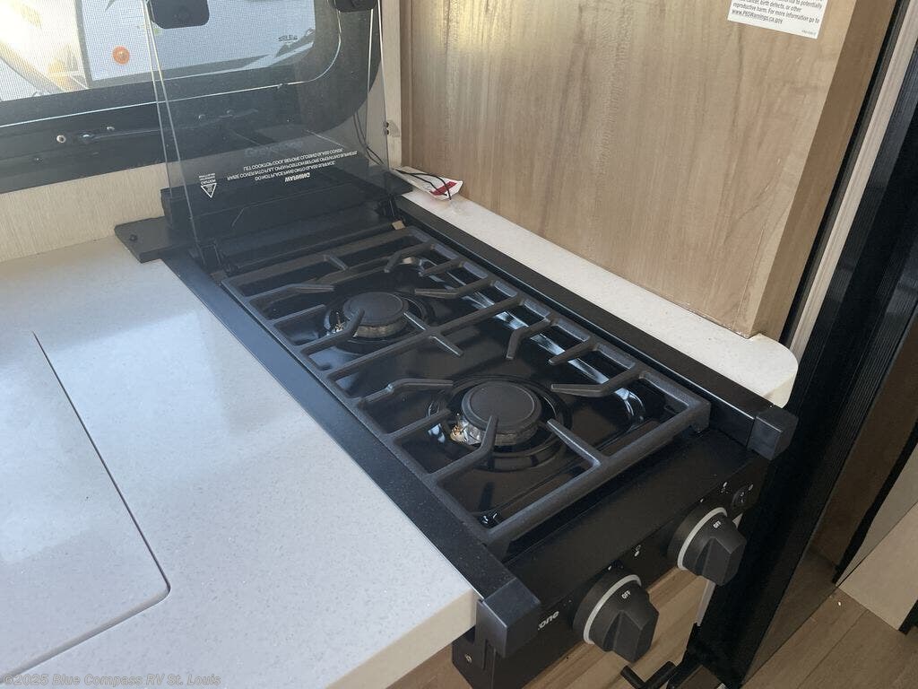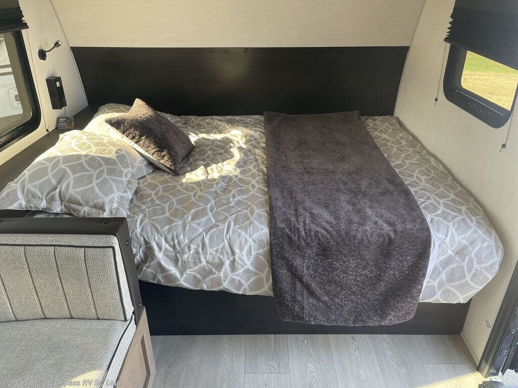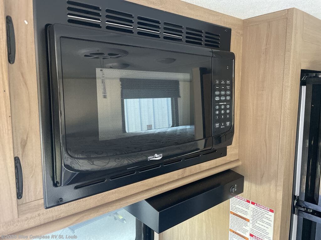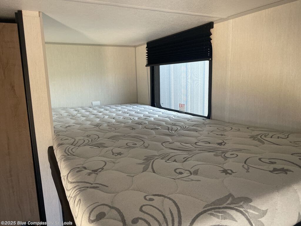 The whole family can sleep comfortably in this travel trailer! It has a set of bunk beds for the kids or guests to sleep on, and you can sleep comfortably on the front queen bed with overhead cabinets and a shelf. There is even an exterior storage plus door that accesses the storage space under the bottom bunk. The chef will enjoy preparing their best home cooked meals either indoors with the high output cooktop or at the outside mini kitchen while staying protected by the 12' power awning!