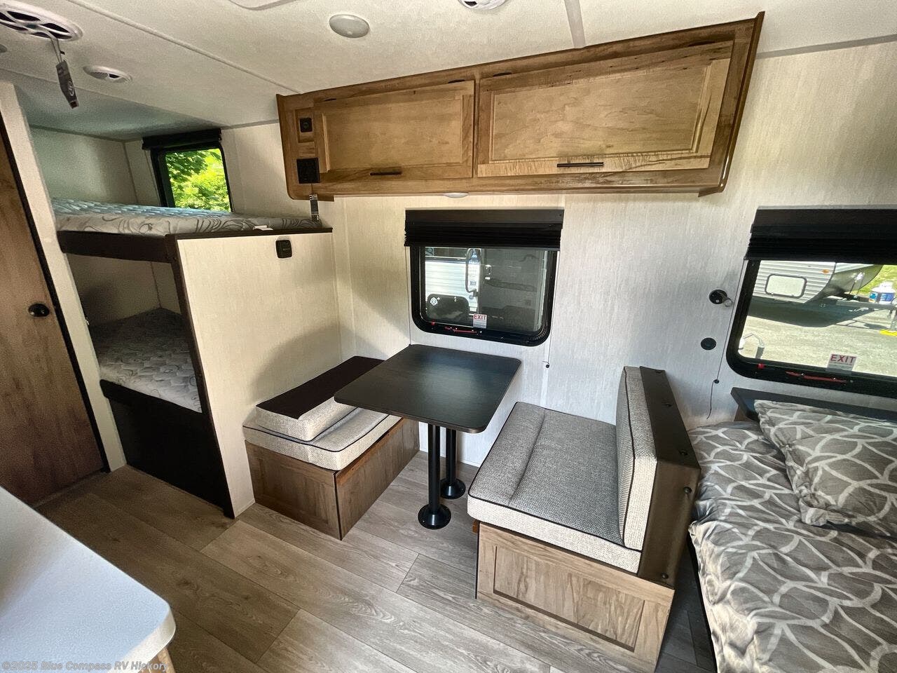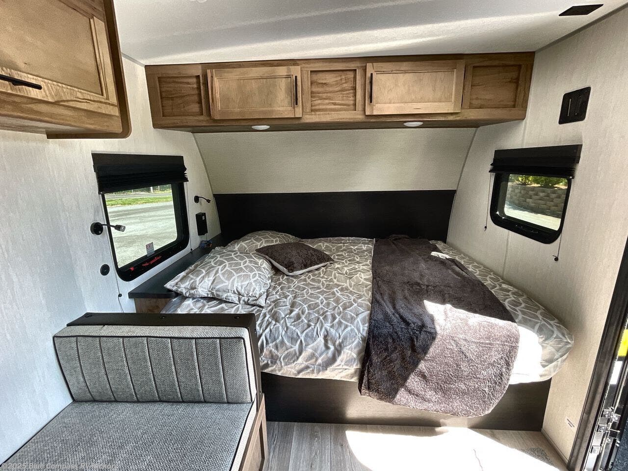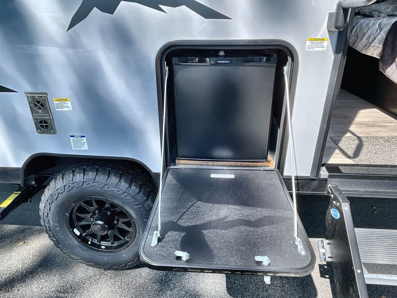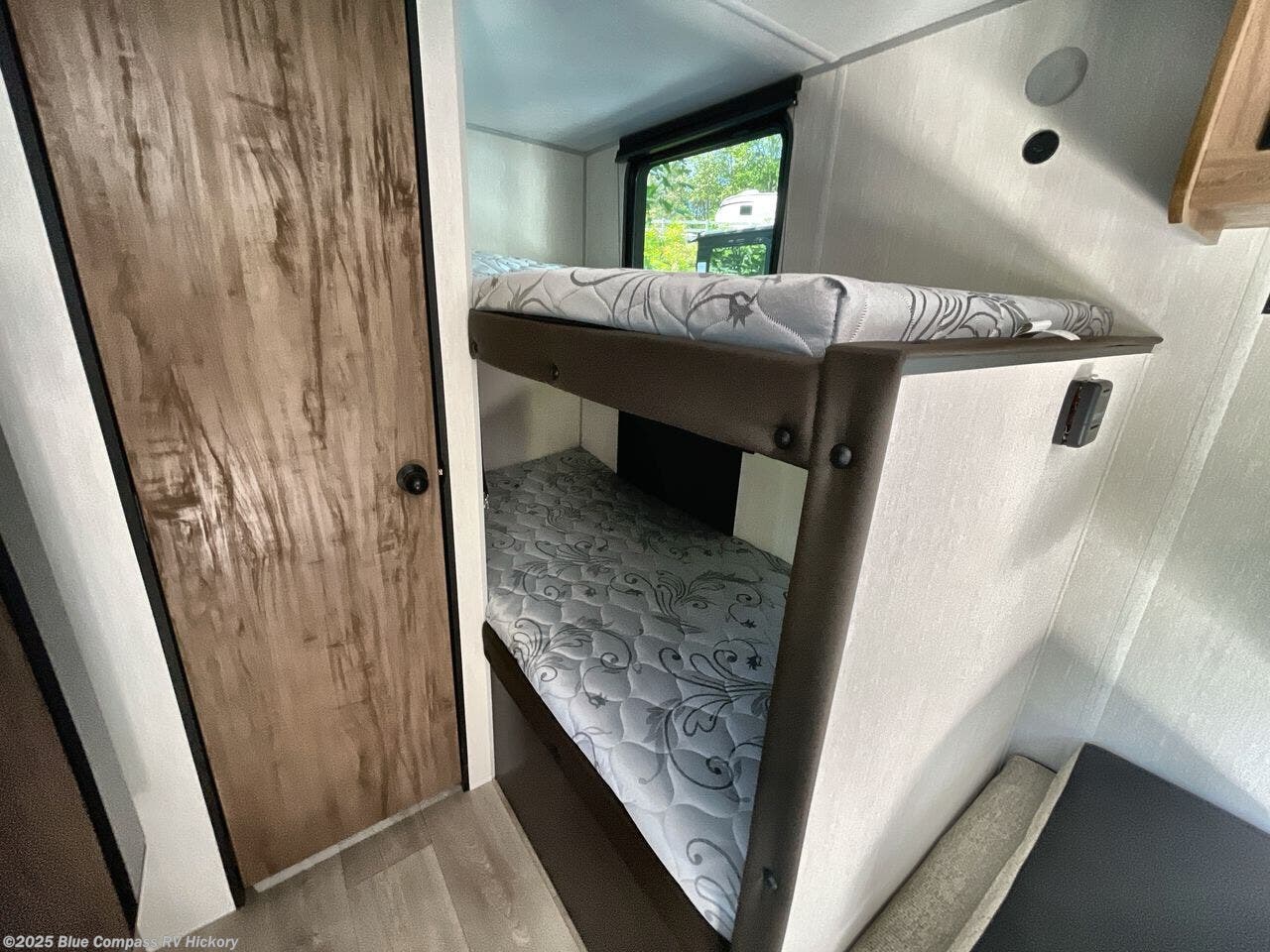 The whole family can sleep comfortably in this travel trailer! It has a set of bunk beds for the kids or guests to sleep on, and you can sleep comfortably on the front queen bed with overhead cabinets and a shelf. There is even an exterior storage plus door that accesses the storage space under the bottom bunk. The chef will enjoy preparing their best home cooked meals either indoors with the high output cooktop or at the outside mini kitchen while staying protected by the 12' power awning!
