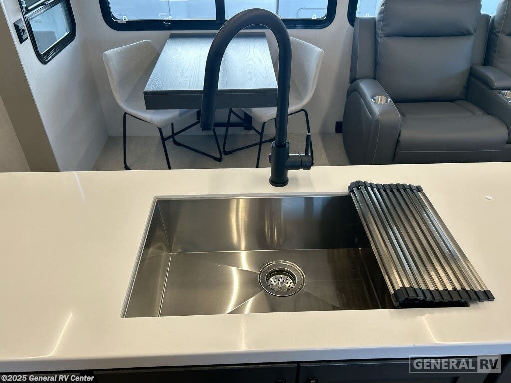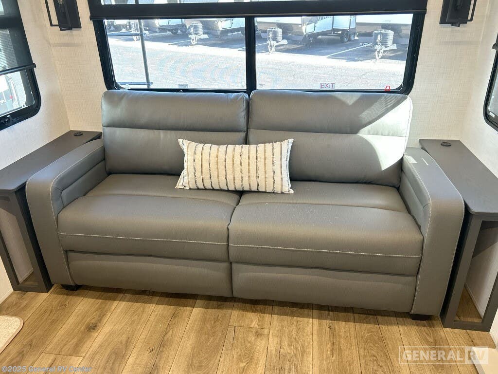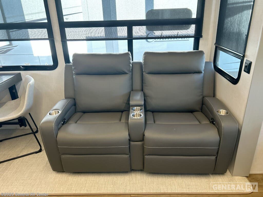 Palomino Columbus fifth wheel 383RLH highlights: Dual Sink Vanity Kitchen Island Bath and a Half King Bed Slide Two Power Awnings Everyone will stay clean with a bath and a half in this fifth wheel! The kitchen has a pantry big enough for everyone's favorite snacks, a four burner gas cooktop, and a kitchen island to prepare your best meals. You can have game night indoors at the table and chairs or set up a table and chairs underneath the two power awnings. The rear living area offers a comfortable place to watch the big game too with an sofa/sleeper and theater seating directly across from the entertainment center with a 50" Smart TV and fireplace. Two can get ready at once in the front bathroom featuring a vanity with dual sinks. Experience a different camping life with residential furnishings and high end features in each one of these Palomino Columbus fifth wheels! The 101" wide body lets you walk around more throughout and the all-welded aluminum-frame superstructure has a snap-in ceiling molding to hold up through every adventure. Don't leave any of your gear behind either when you can easily store it in the climate controlled drop frame storage area. On the exterior, you'll find a heated utility convenience center, an outside sprayer to keep the dirt outside where it belongs, and magnetic compartment door holds to keep them from falling on you as you grab your items. Plus, there are some modern features that will really seal the deal like the Wi-Fi Booster with 4G LTE capability prep, upgraded true solid-surface countertops, power theater seating with USB charging, and a 260W solar panel for off-grid camping!
