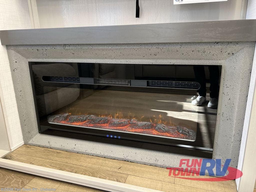 Everyone will stay clean with a bath and a half in this fifth wheel! The kitchen has a pantry big enough for everyone's favorite snacks, a four burner gas cooktop, and a kitchen island to prepare your best meals. You can have game night indoors at the table and chairs or set up a table and chairs underneath the two power awnings. The rear living area offers a comfortable place to watch the big game too with an sofa/sleeper and theater seating directly across from the entertainment center with a 50" Smart TV and fireplace. Two can get ready at once in the front bathroom featuring a vanity with dual sinks, and since there is washer and dryer prep, you have the option to make wash day easier!
