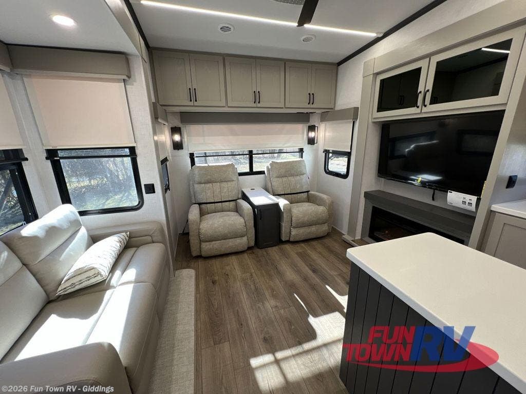 Everyone will stay clean with a bath and a half in this fifth wheel! The kitchen has a pantry big enough for everyone's favorite snacks, a four burner gas cooktop, and a kitchen island to prepare your best meals. You can have game night indoors at the table and chairs or set up a table and chairs underneath the two power awnings. The rear living area offers a comfortable place to watch the big game too with an sofa/sleeper and theater seating directly across from the entertainment center with a 50" Smart TV and fireplace. Two can get ready at once in the front bathroom featuring a vanity with dual sinks, and since there is washer and dryer prep, you have the option to make wash day easier!