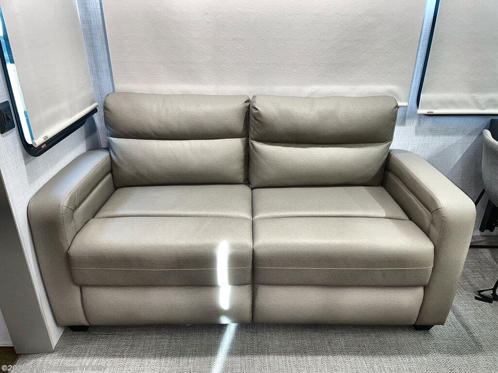 You won't believe all that this fifth wheel has to offer! Starting with the rear kitchen which has plenty of countertop space to prepare your delicious meals, a four burner cooktop with a stainless steel 24" oven to cook them, and a large single bowl stainless steel sink for easy clean up. The living area has opposing sofas and a theater seat with USB charging and storage across from an entertainment center with 50" Smart TV. The half bathroom is close to the living area so you can get back to watching your movie faster. You will feel right at home sleeping in the master suite on a slide out king bed across from a dresser and hamper to keep your space tidy, plus entrance into the front full bathroom. Inside the bathroom, you will find a vanity with dual sinks for two to get ready at once, a spacious shower with a seat, and a walk-in closet for clothes, shoes, and more!