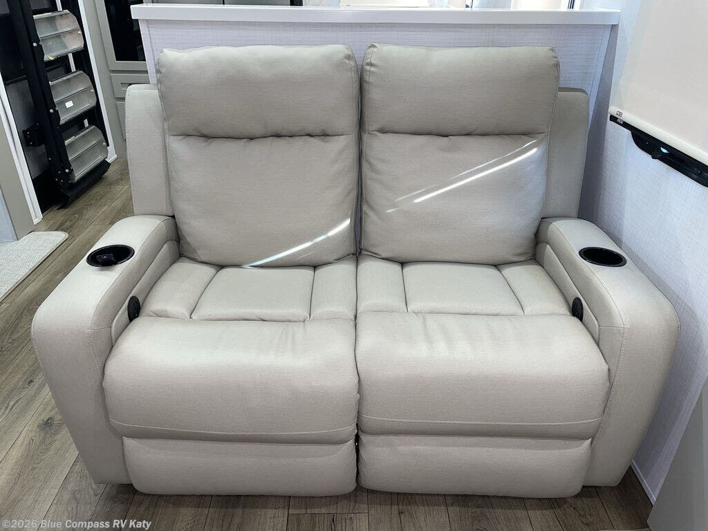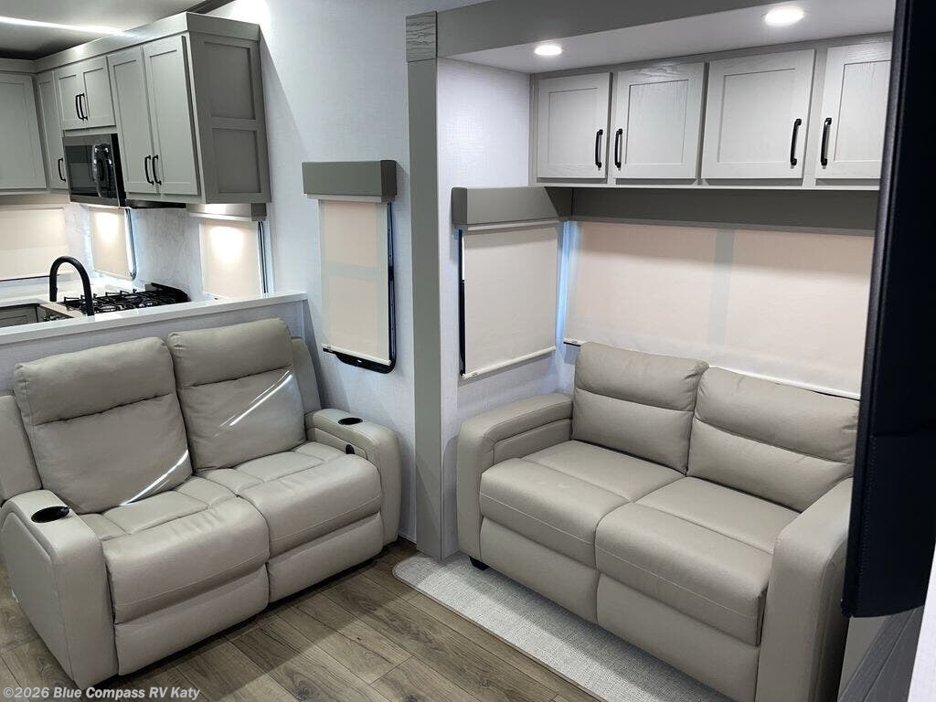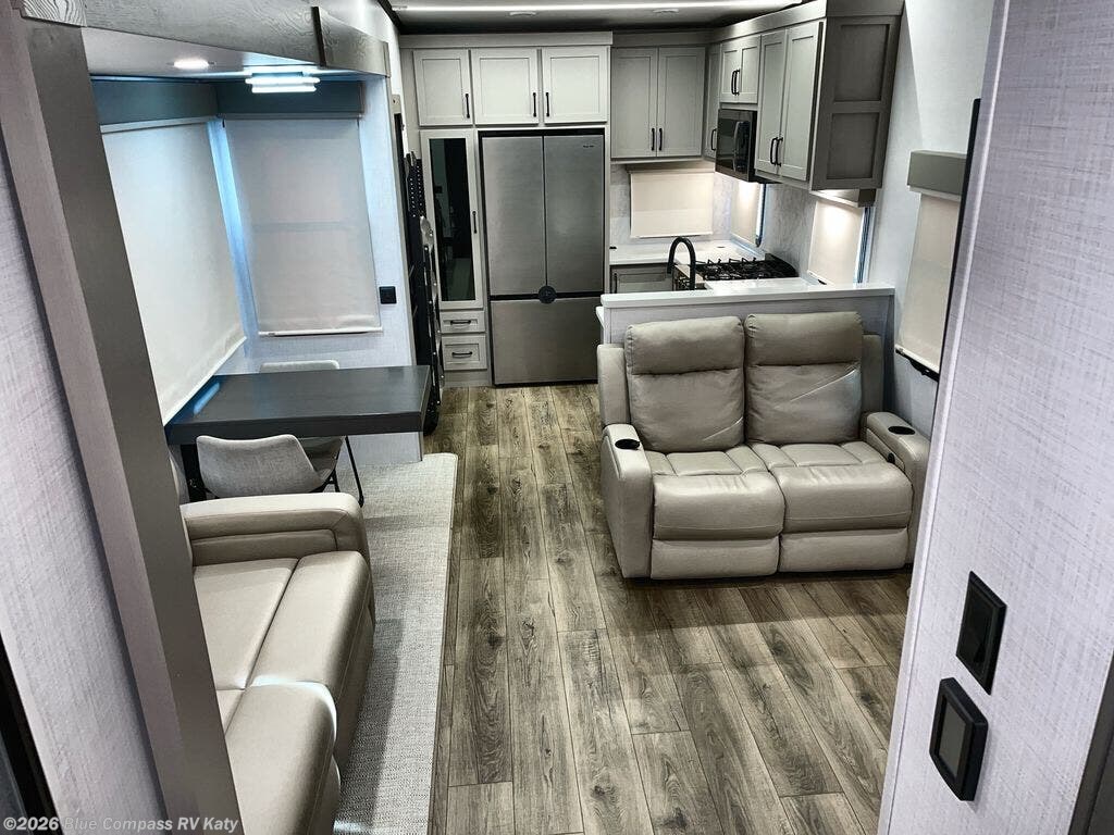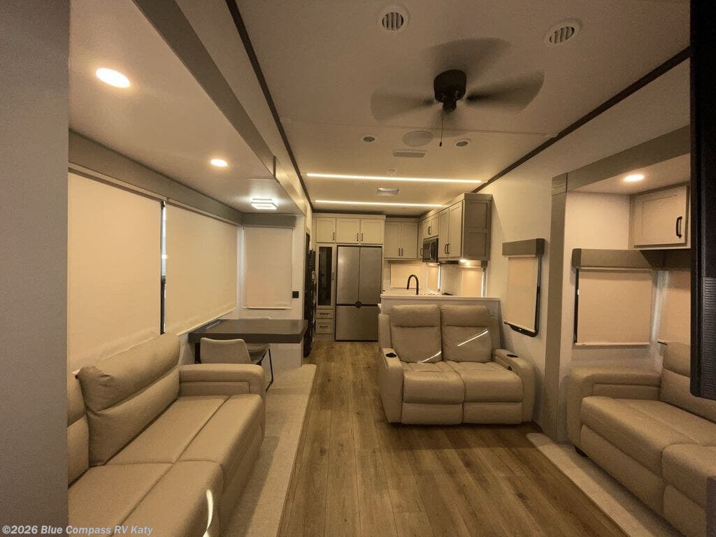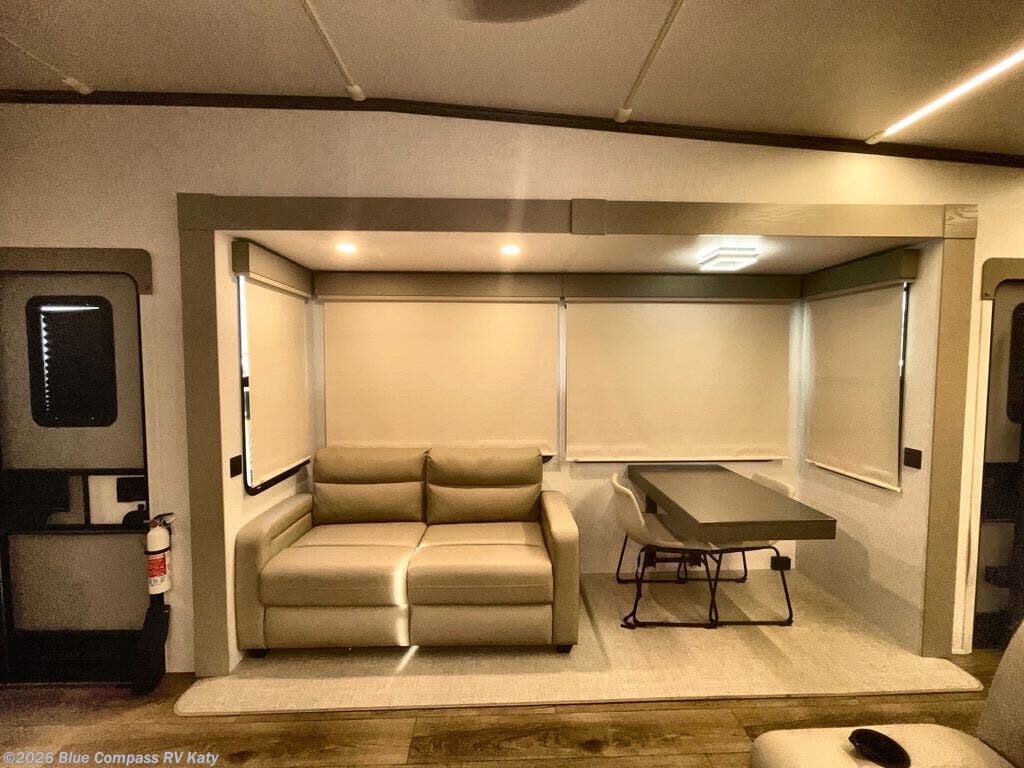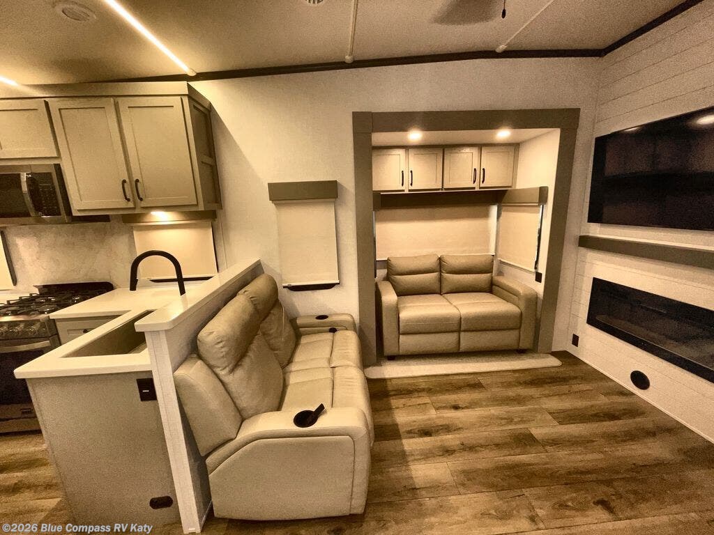 You won't believe all that this fifth wheel has to offer! Starting with the rear kitchen which has plenty of countertop space to prepare your delicious meals, a four burner cooktop with a stainless steel 24" oven to cook them, and a large single bowl stainless steel sink for easy clean up. The living area has opposing sofas and a theater seat with USB charging and storage across from an entertainment center with 50" Smart TV. The half bathroom is close to the living area so you can get back to watching your movie faster. You will feel right at home sleeping in the master suite on a slide out king bed across from a dresser and hamper to keep your space tidy, plus entrance into the front full bathroom. Inside the bathroom, you will find a vanity with dual sinks for two to get ready at once, a spacious shower with a seat, and a walk-in closet for clothes, shoes, and more!