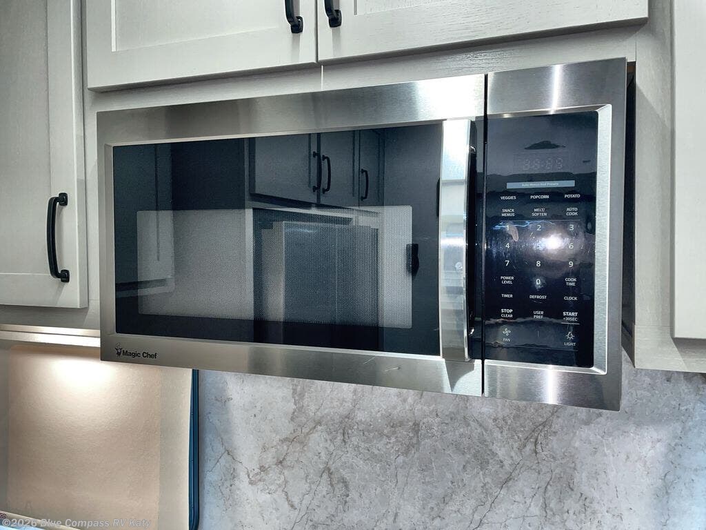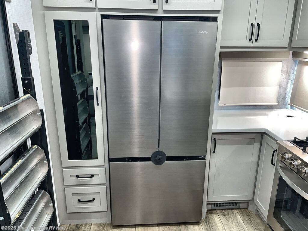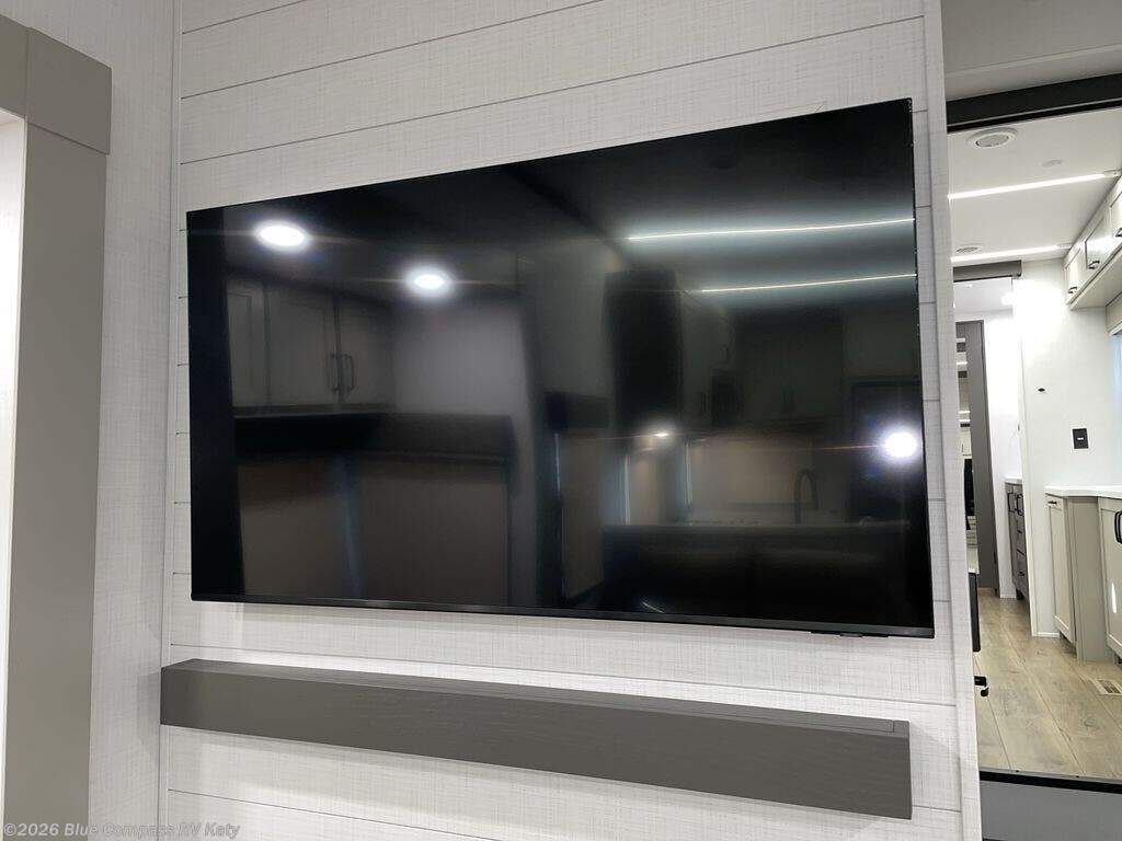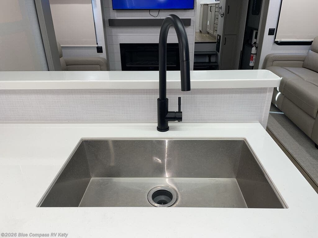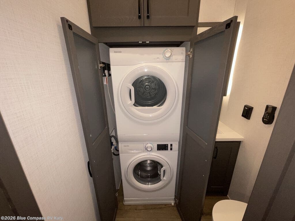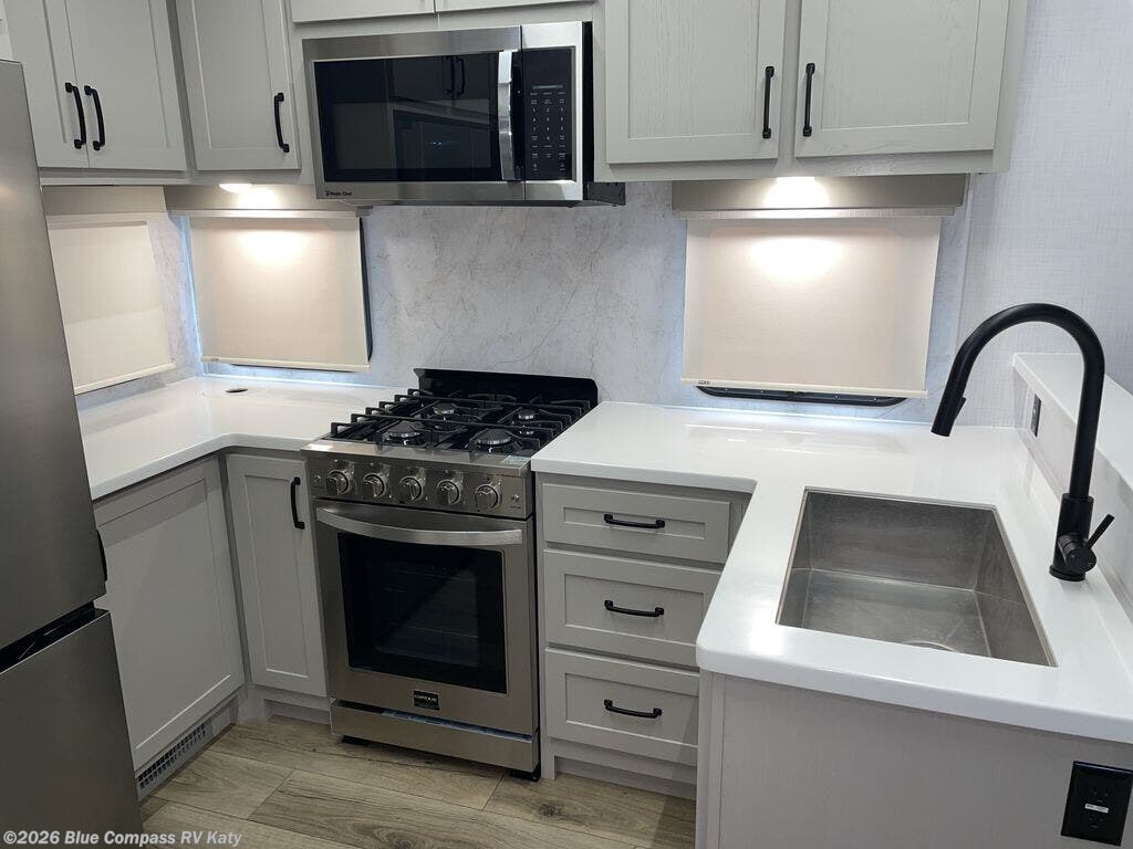 You won't believe all that this fifth wheel has to offer! Starting with the rear kitchen which has plenty of countertop space to prepare your delicious meals, a four burner cooktop with a stainless steel 24" oven to cook them, and a large single bowl stainless steel sink for easy clean up. The living area has opposing sofas and a theater seat with USB charging and storage across from an entertainment center with 50" Smart TV. The half bathroom is close to the living area so you can get back to watching your movie faster. You will feel right at home sleeping in the master suite on a slide out king bed across from a dresser and hamper to keep your space tidy, plus entrance into the front full bathroom. Inside the bathroom, you will find a vanity with dual sinks for two to get ready at once, a spacious shower with a seat, and a walk-in closet for clothes, shoes, and more!