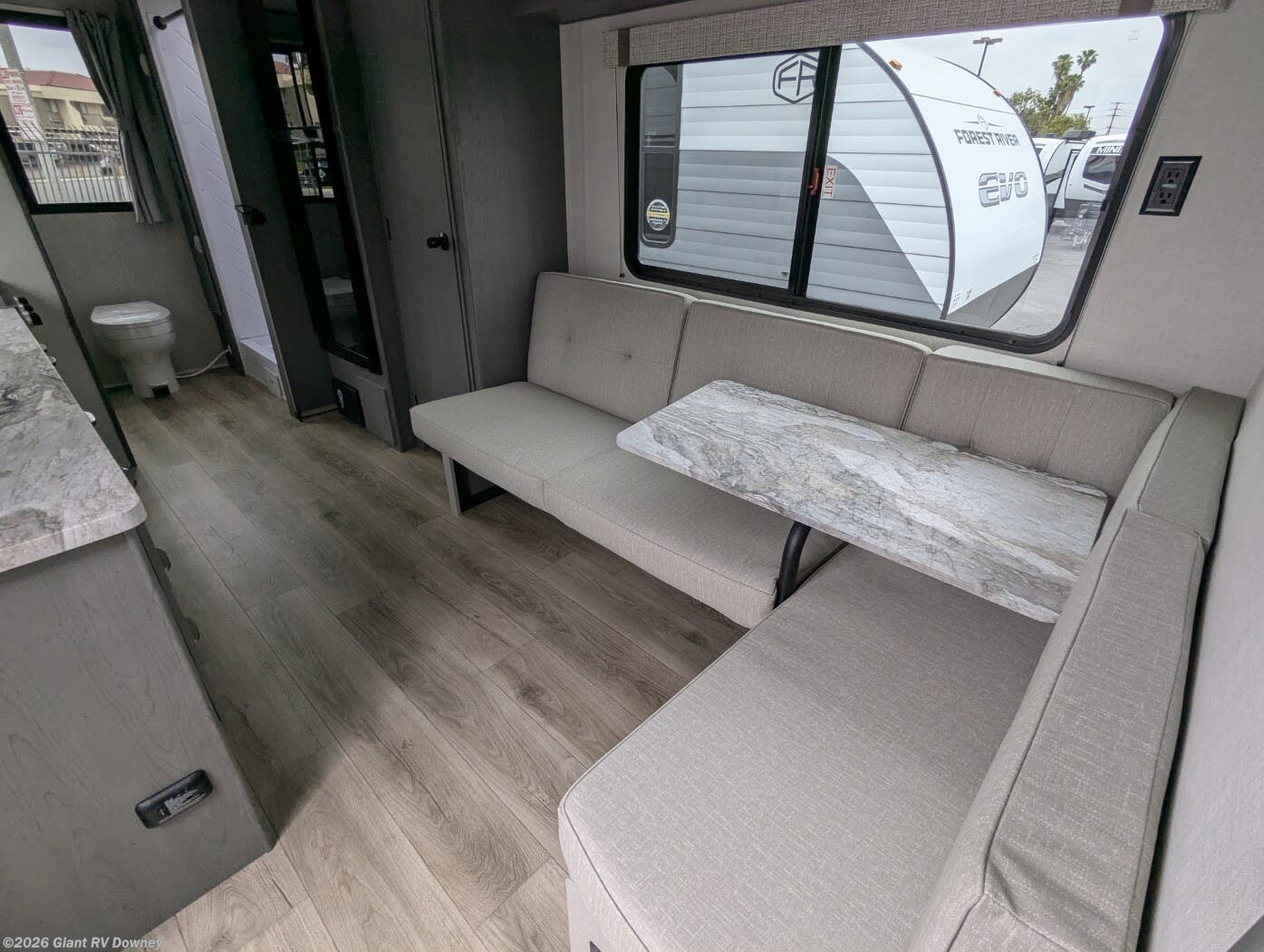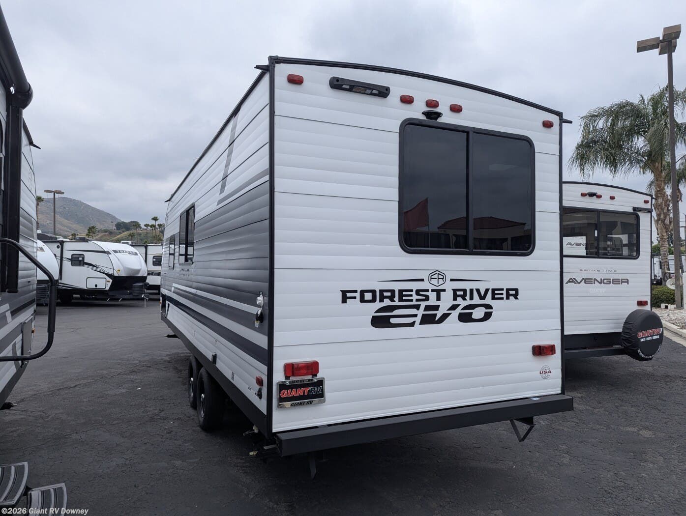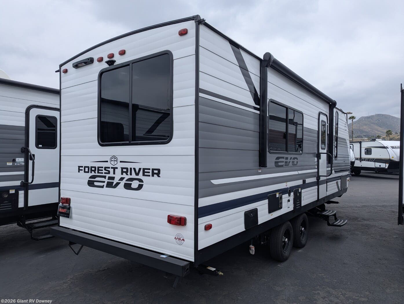 Embark on cozy adventures with the 2025 Forest River EVO 23RB Travel Trailer at Giant RV in California, a 28’7” lightweight RV sleeping up to 4, featuring a rear bathroom, a front queen bed, a U-shaped dinette for gatherings, and a kitchen with bar seating. With a seamless roof and 54-gal freshwater tank, it’s built for epic California RV camping!