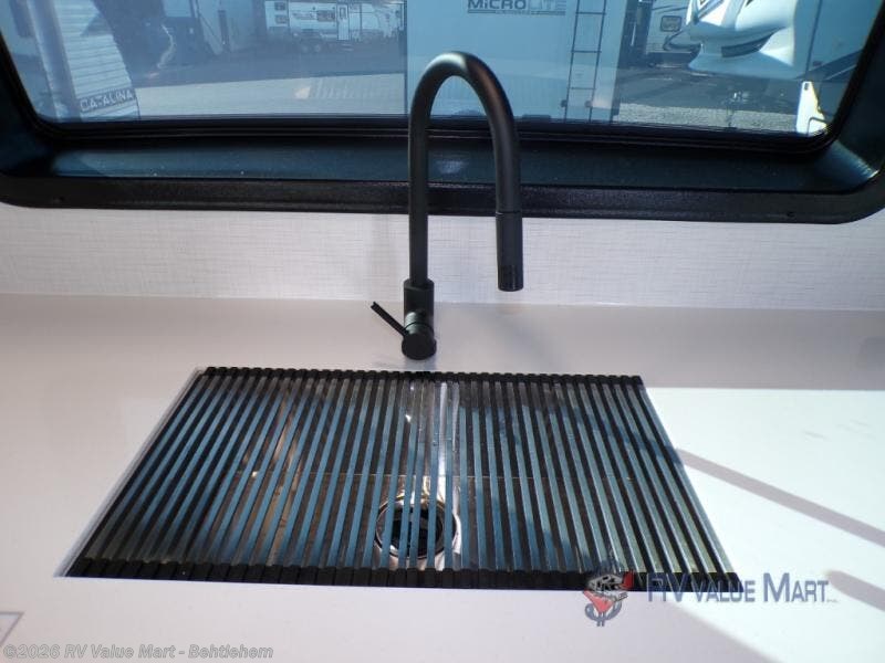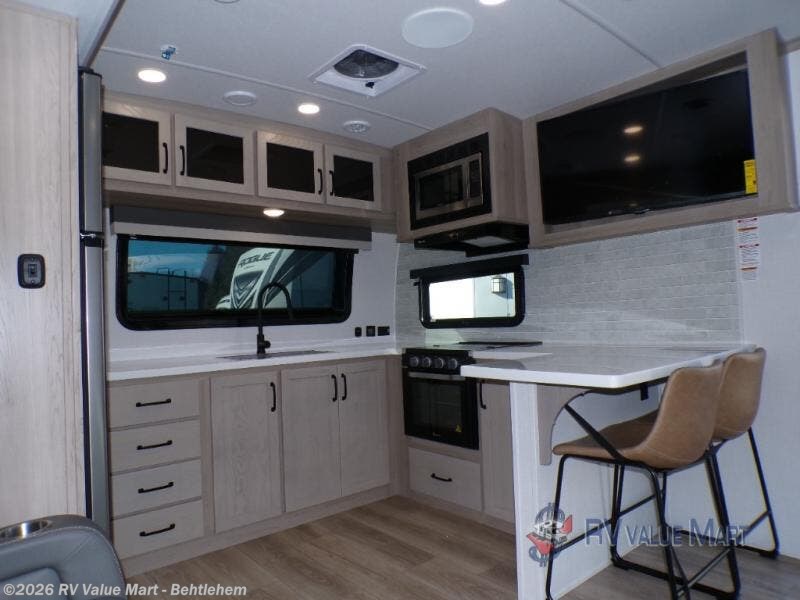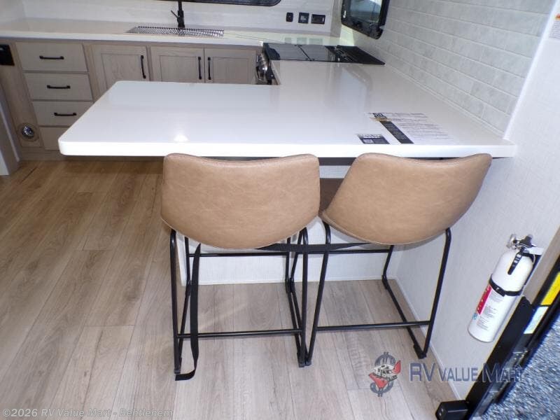 You will love how open this travel trailer will feel with the large front window that you can look out from the two-person bar top seating! The front kitchen has plenty of countertop space for you to prepare your best meals. Your nights will be spent in true relaxation with a 67" theater seating and king bed slide in the bedroom for a great night's rest. The full rear bathroom has a shower with a seat to take a nice, hot shower before bed, and a dual-sink vanity for two to get ready at once in the mornings!