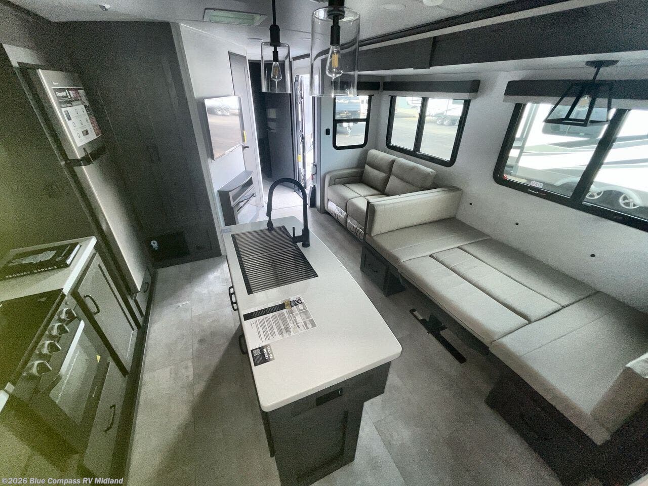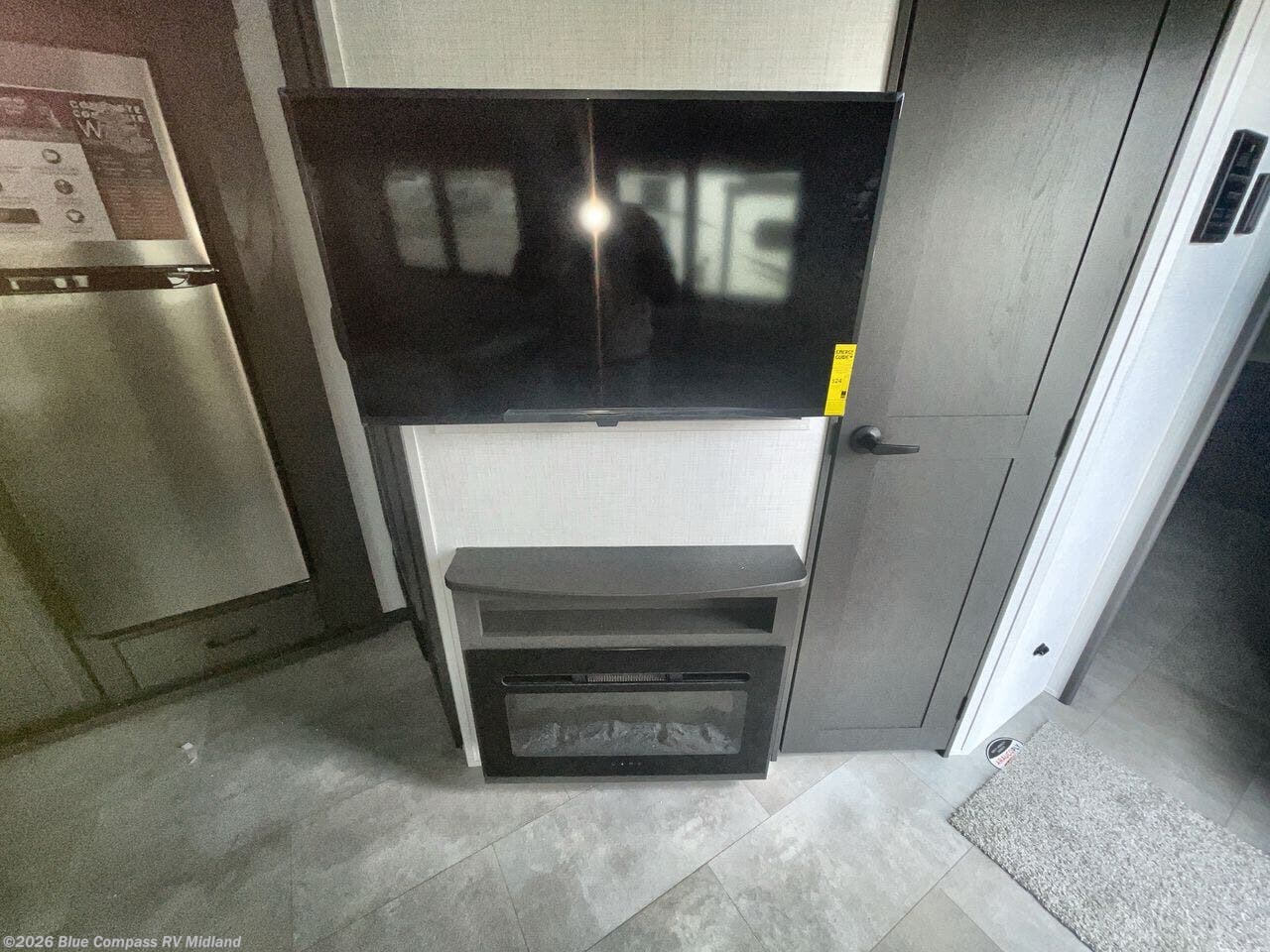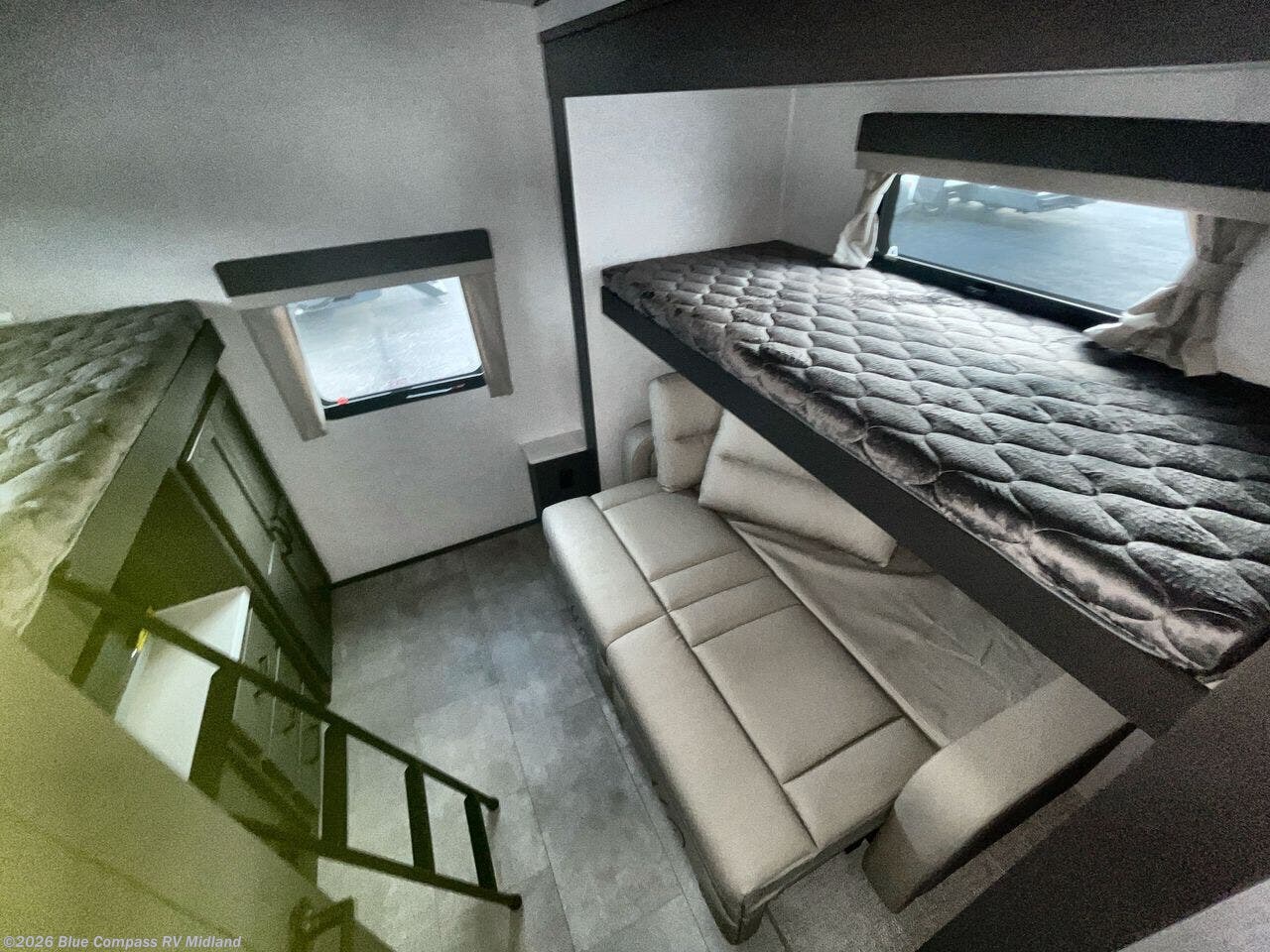 The whole family will love camping in this travel trailer! The kids have their own privacy within the rear bunkhouse that features a 42" x 72" upper bunk with a TV option below it along the curbside, and a flip-up bunk with a 68" pull-out sofa below it along the roadside. After you have prepared a delicious home-cooked meal with the three-burner cooktop and kitchen island, you can head to the 44" x 81" U-shaped dinette where everyone can gather around. You could even prepare dinner at the outside kitchen, set up a table and chairs, and eat underneath the 11' power awning. The 60" hide-a-bed sofa is the perfect place to sit while enjoying the fireplace or watching your favorite movie on the LED TV. A dual-entry bathroom makes it easy for everyone to access especially those staying in the front private bedroom!