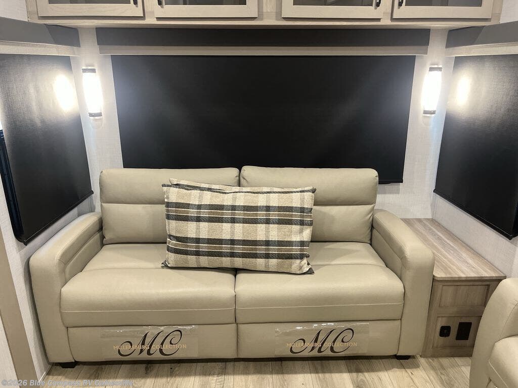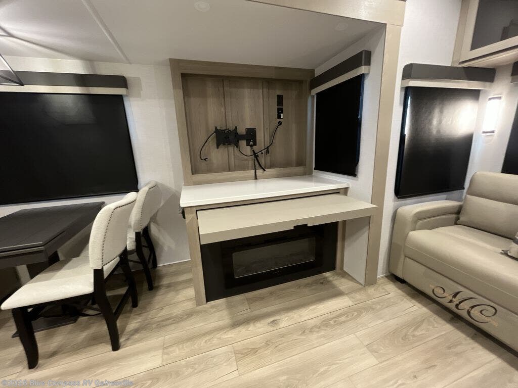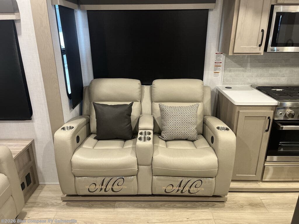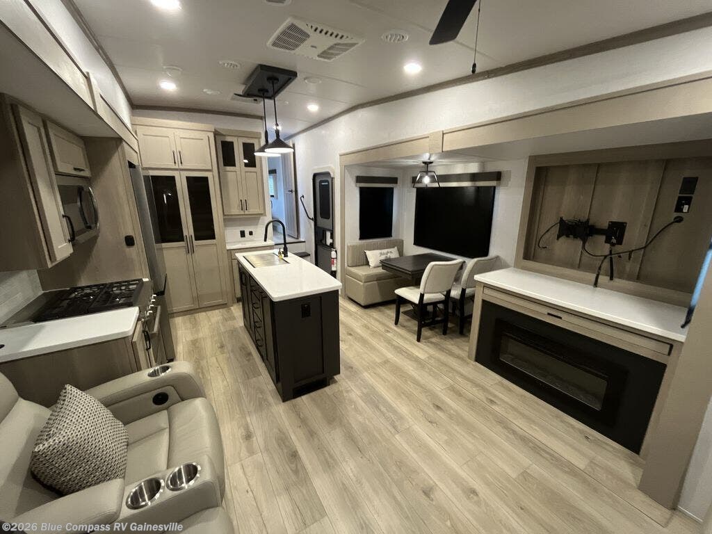 This fifth wheel will feel just like home wherever you decide to roam! The rear living area includes a hide-a-bed sofa with optional recliners, a 60" theater seat across from the TV and fireplace, plus a table and chairs with a bench. There is also a pull-out desk if you need to get some work done in the morning. The spacious full bath with a shower skylight will give you more light as you get ready each morning, and the front private bedroom with a queen bed will provide a great escape each night.