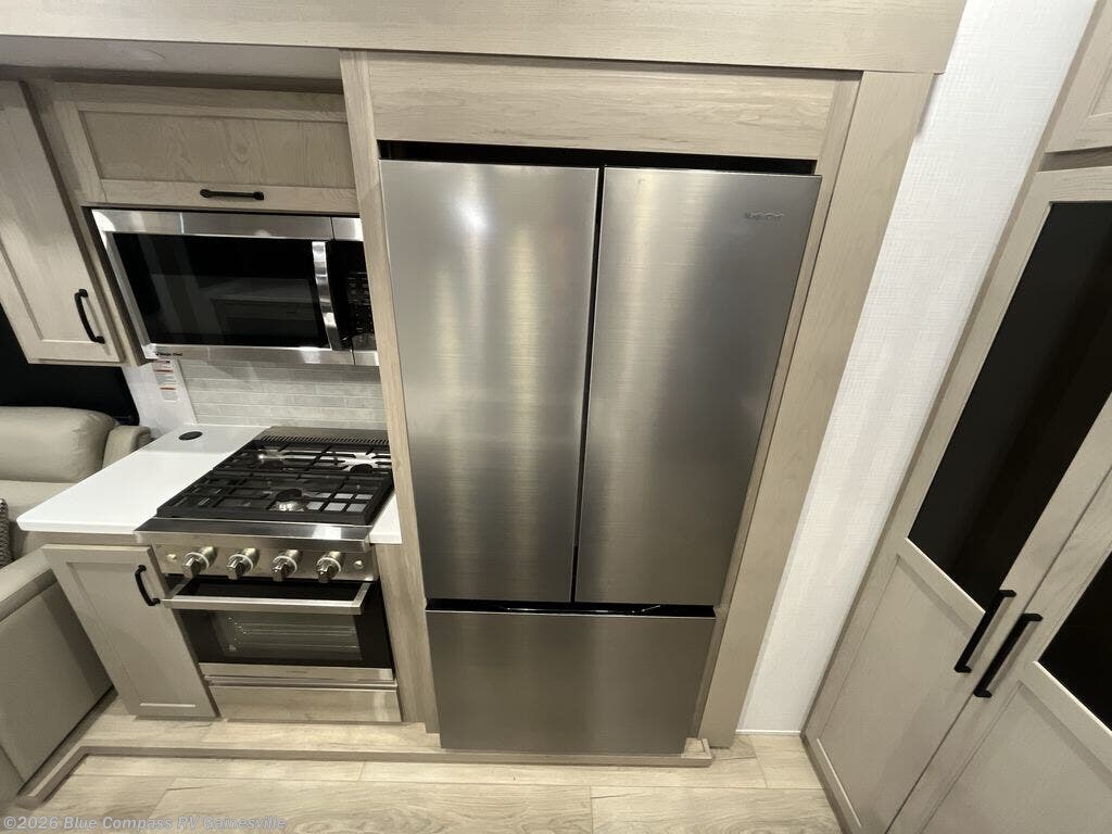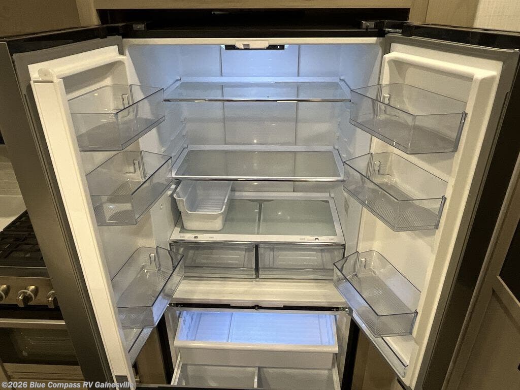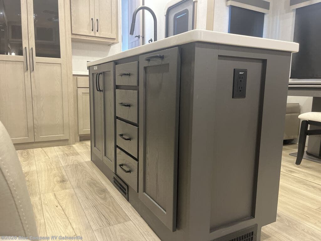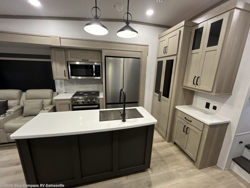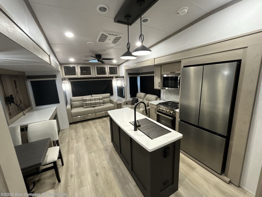 This fifth wheel will feel just like home wherever you decide to roam! The rear living area includes a hide-a-bed sofa with optional recliners, a 60" theater seat across from the TV and fireplace, plus a table and chairs with a bench. There is also a pull-out desk if you need to get some work done in the morning. The spacious full bath with a shower skylight will give you more light as you get ready each morning, and the front private bedroom with a queen bed will provide a great escape each night.