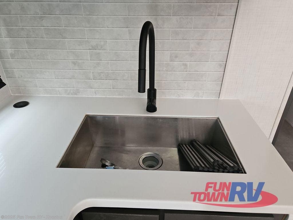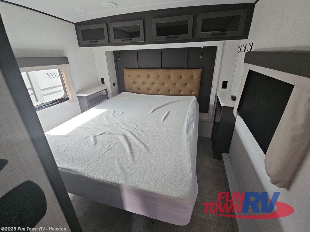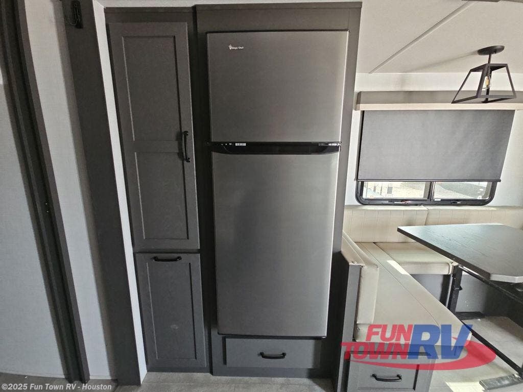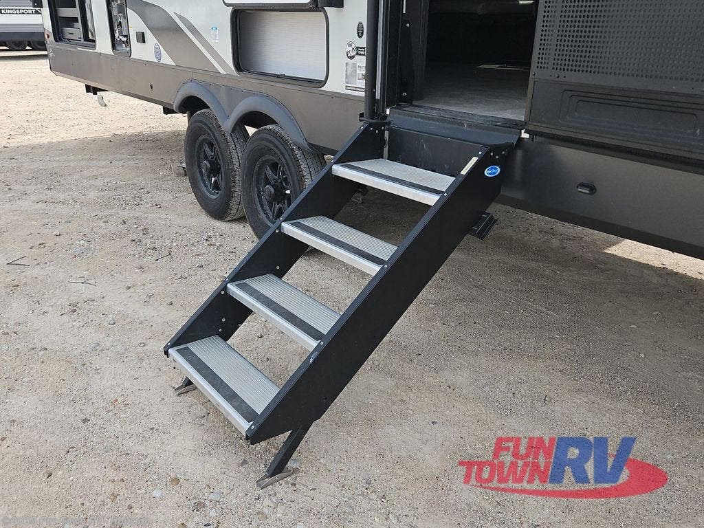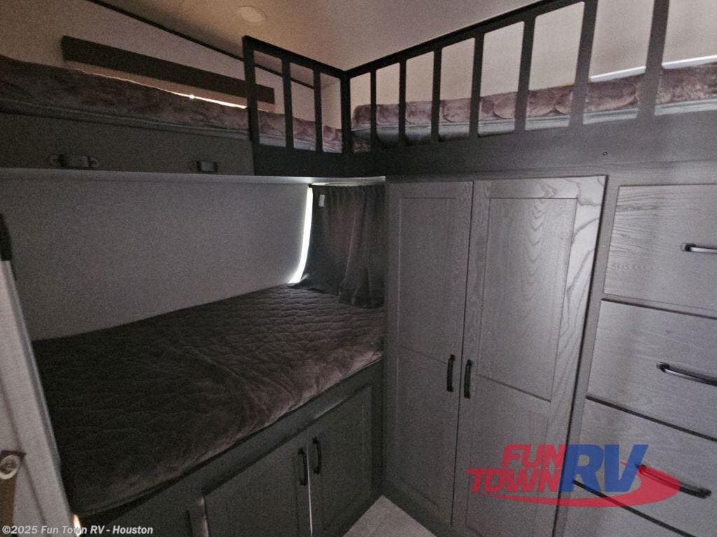 If you have a larger family or friend group this fifth wheel will allow you to bring everyone with sleeping space for eight campers. The kids or your guests will have privacy in the rear bunkhouse which offers a single 32" top bunk, and a 42" x 72" bunk over a 47" x 72" lower bunk, plus washer and dryer prep if you want to add those appliances. You will have privacy on the opposite side of the RV in the front bedroom which offers a queen bed with a king bed option, a wardrobe and an optional TV if you like to watch movies in bed. And don't forget about all the kitchen amenities and the living area furniture which includes a theater seat and a king U-shaped dinette, Smart TV and fireplace. Outside, you will find pass-through storage, two power awnings, an outside kitchen, and additional outside storage for even more camp gear!