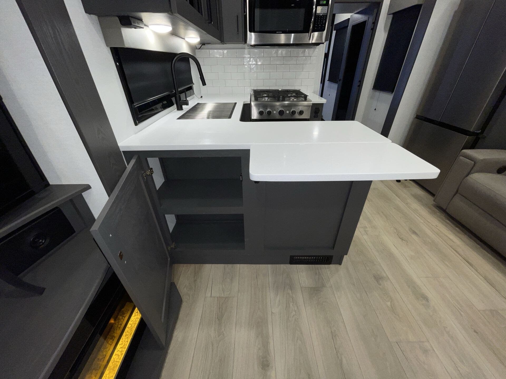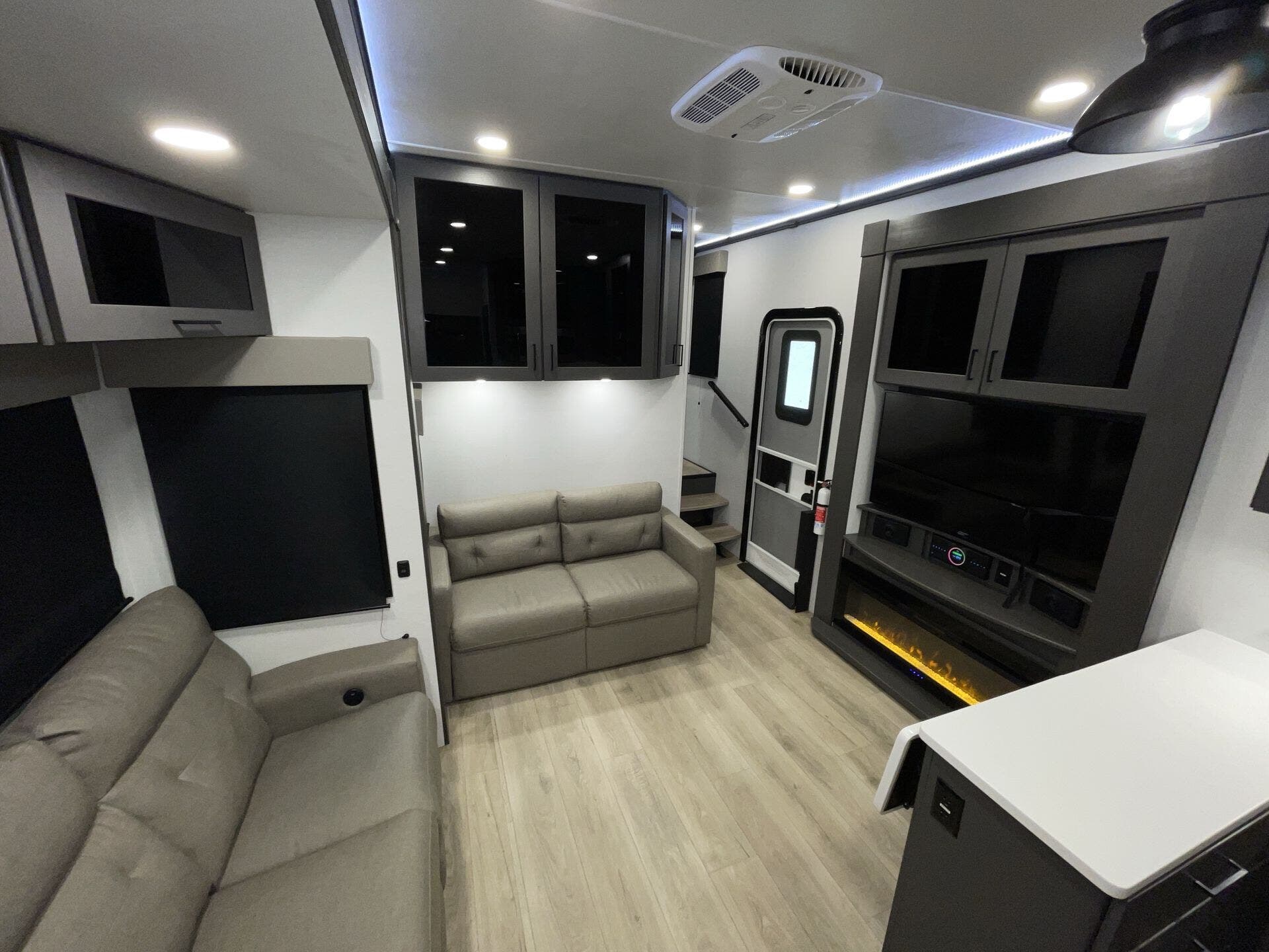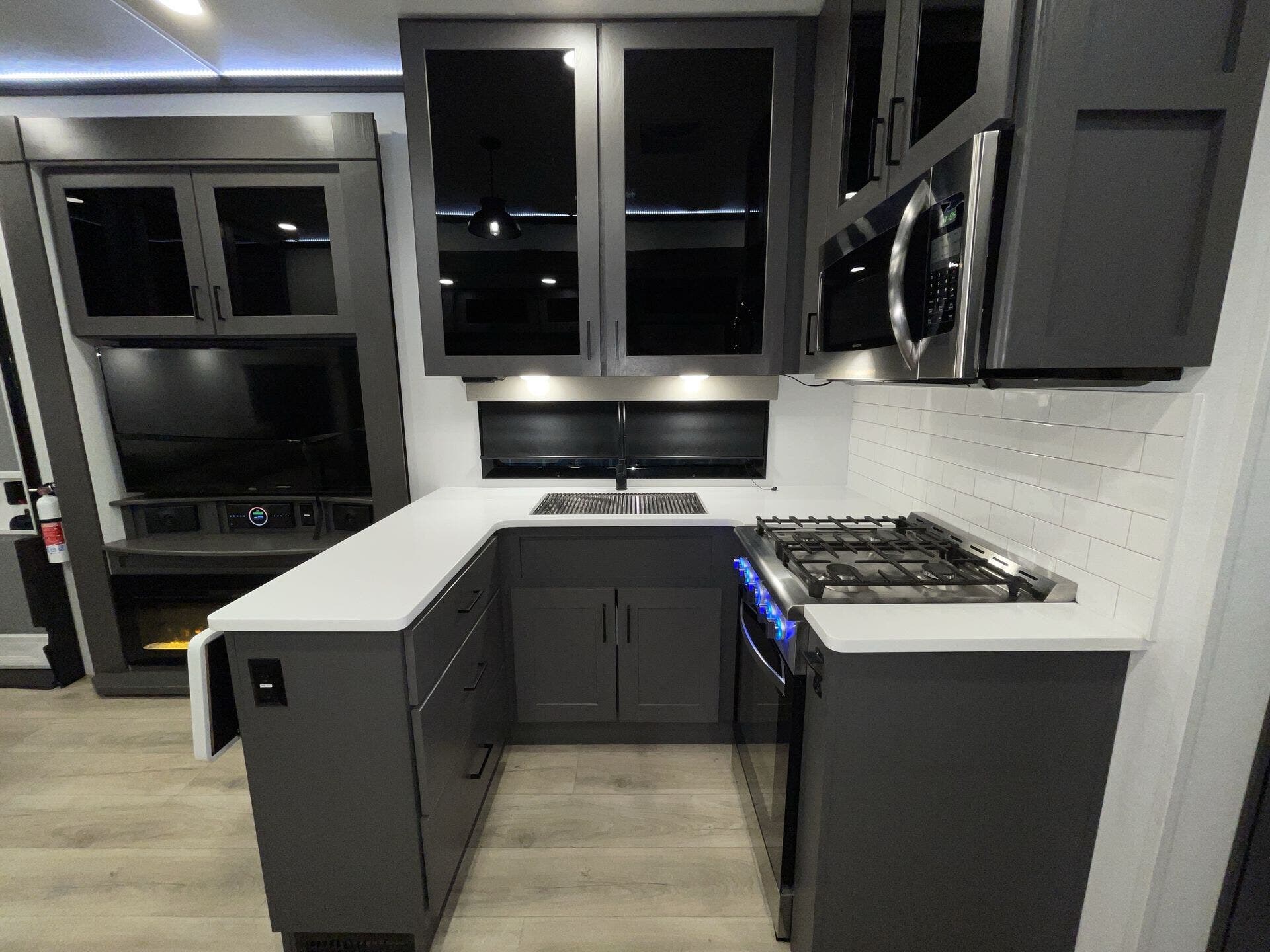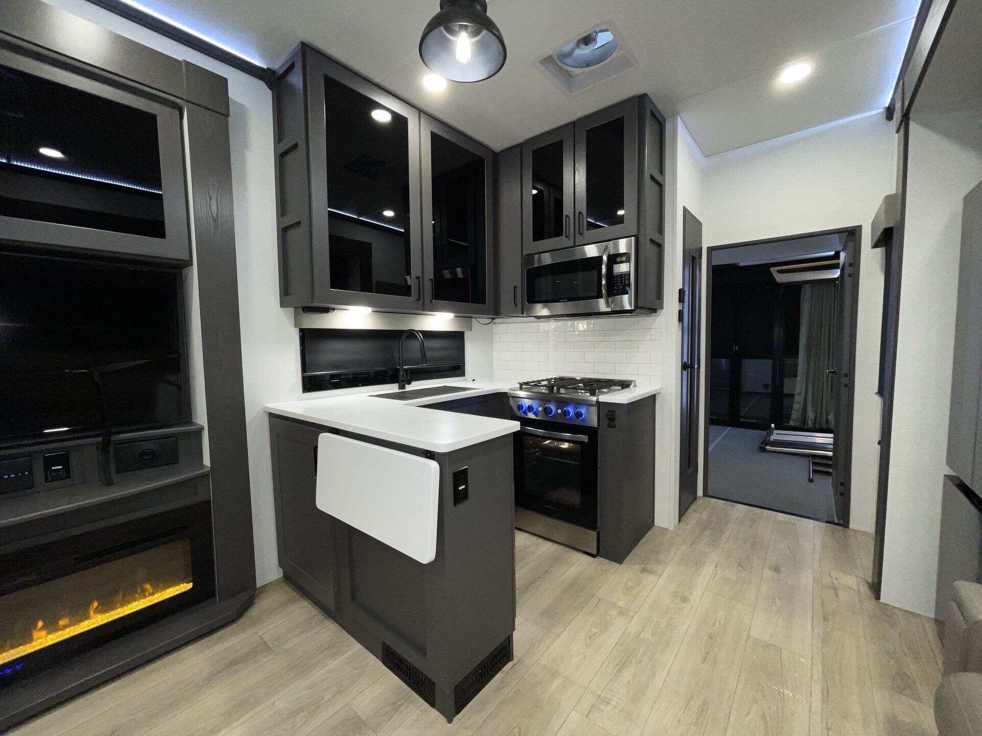 Inside, the open-concept layout features a large living area with comfortable seating, a fireplace, and entertainment center, creating a true home-like feel. The kitchen is equally impressive, offering solid-surface countertops, a residential refrigerator, and plenty of storage—ideal for extended stays or full-time living.