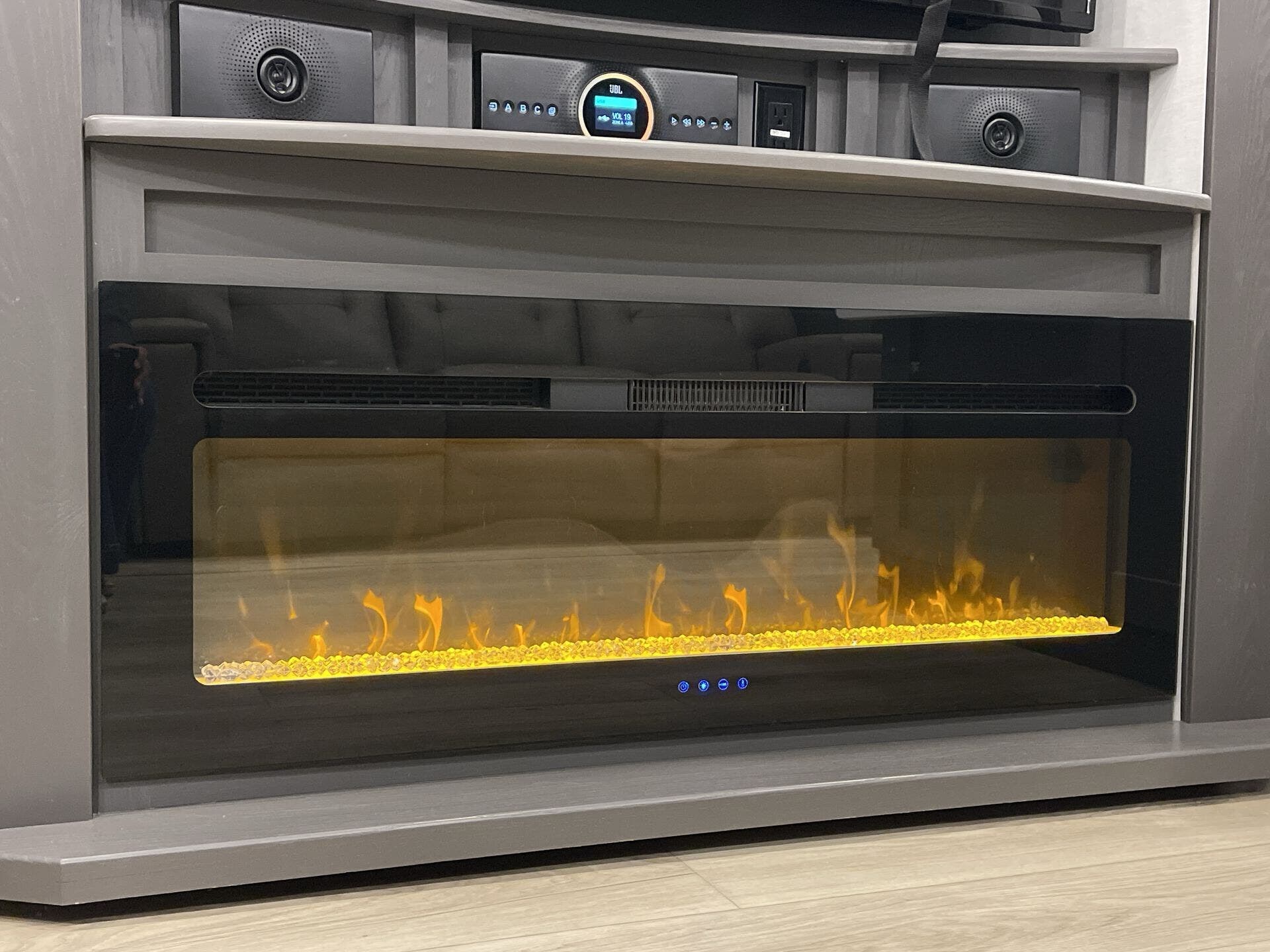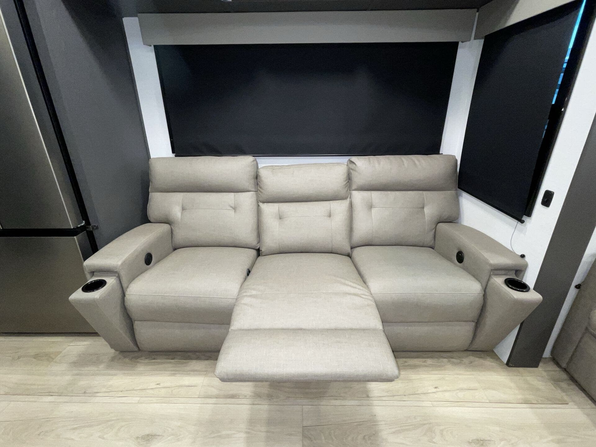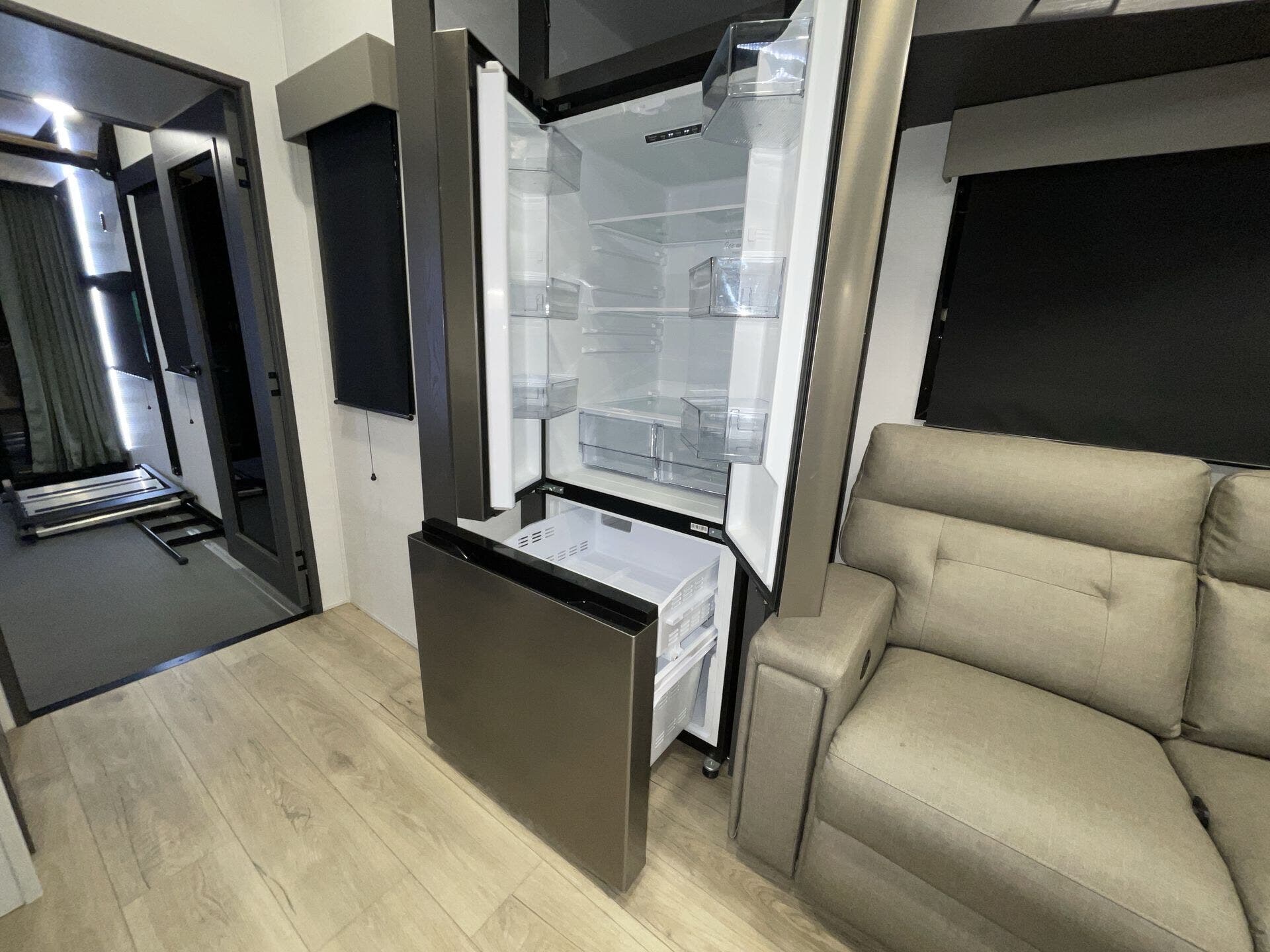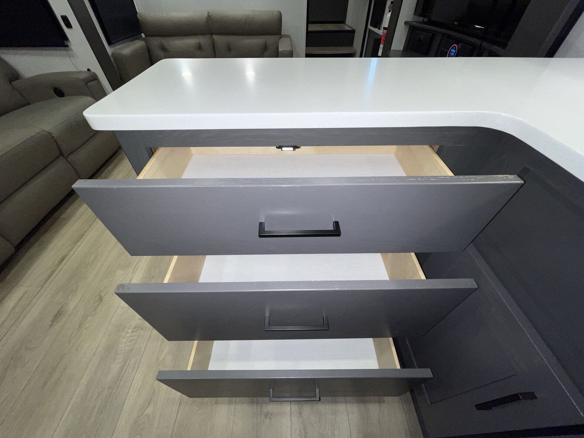 Inside, the open-concept layout features a large living area with comfortable seating, a fireplace, and entertainment center, creating a true home-like feel. The kitchen is equally impressive, offering solid-surface countertops, a residential refrigerator, and plenty of storage—ideal for extended stays or full-time living.