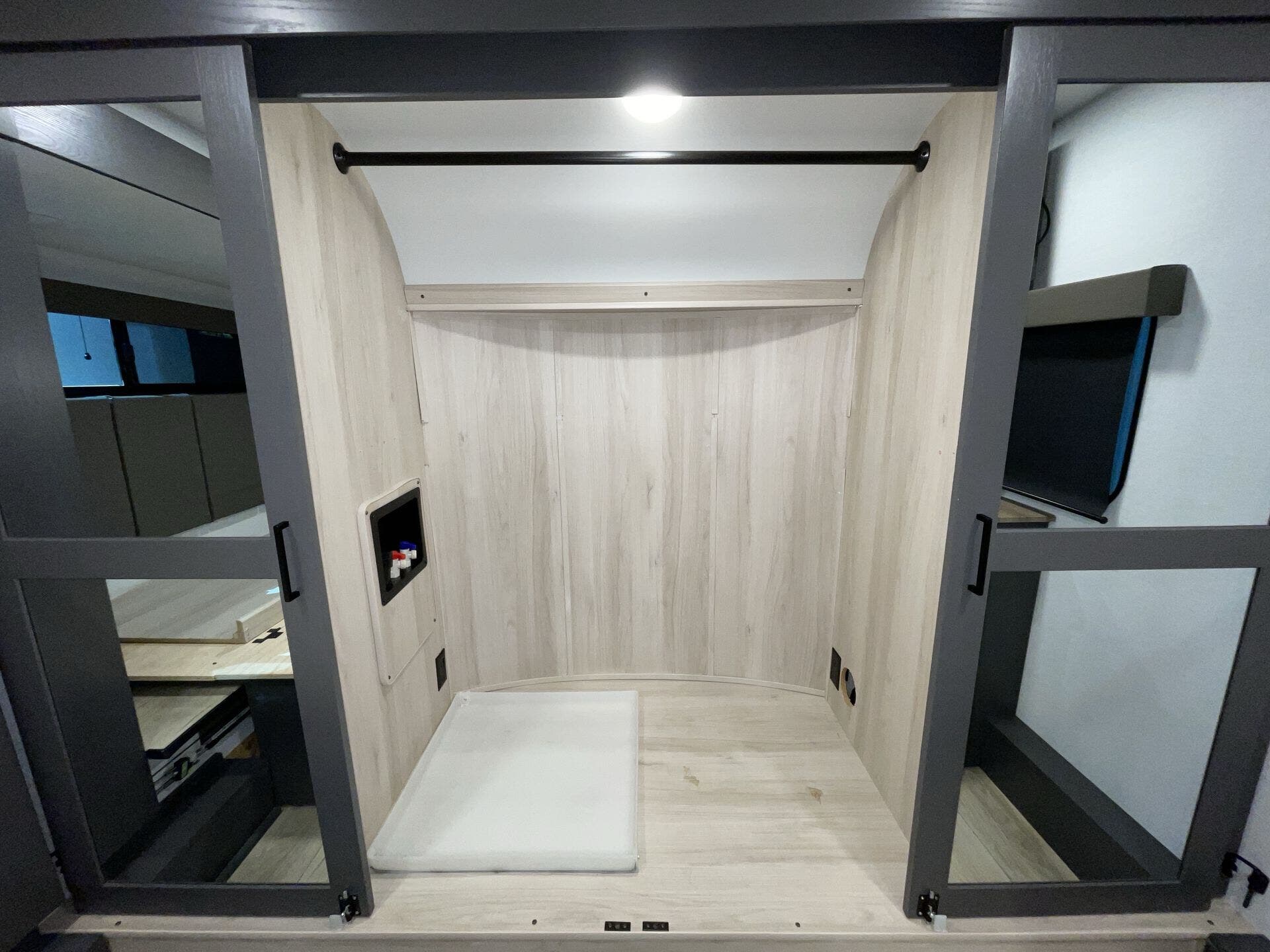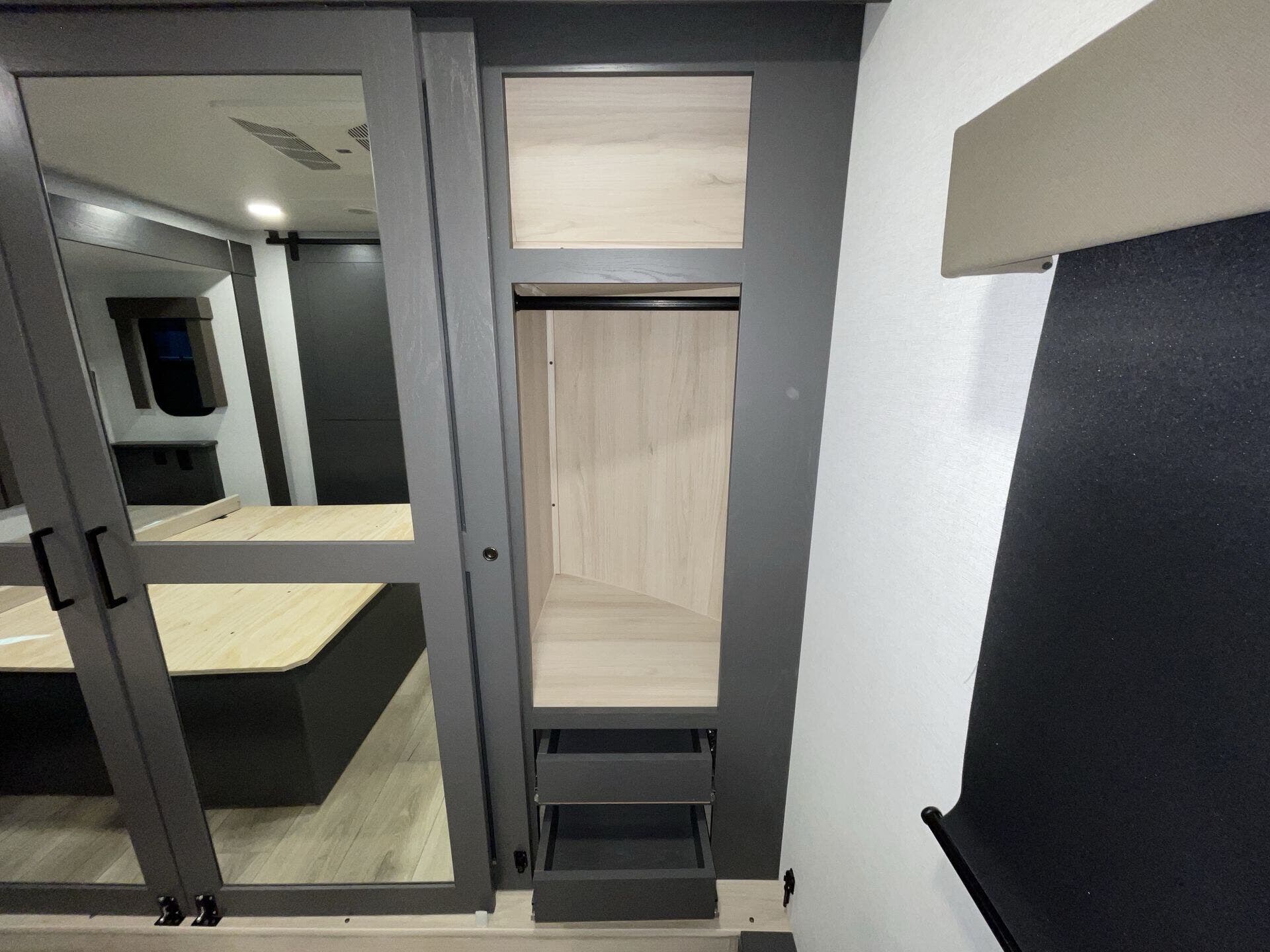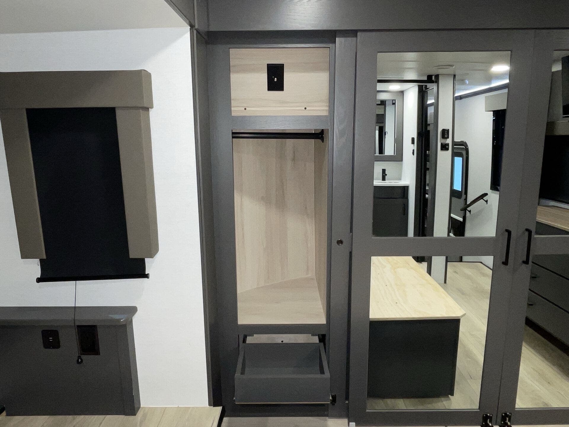The rear garage doubles as a versatile living or sleeping space with a drop-down bed, while a loft adds even more flexibility. Up front, the private master suite includes a generous wardrobe storage, paired with a spacious main bathroom and an additional half bath for convenience.