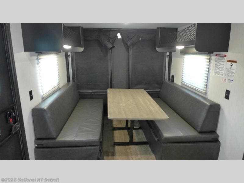 It's time to hit the road in this small, yet walkable travel trailer that is versatile to your needs and offers everything you will want to stay comfortable at a campground or off-grid. You can make meals using the cooktop and microwave up front, and store your cold items in the 12V refrigerator. Take turns getting cleaned up in the wet bath so you can skip the public facilities, and store your clothing in the overhead cabinets. You can watch the 32" TV while dining or sleeping on the twin beds that offer a table top to help you convert this area into a king bed. And the 10' power awning will give you a place to hang out while you use the outdoor griddle.