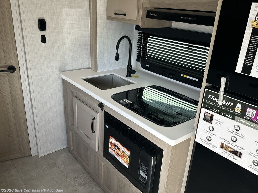 With any Flagstaff E-Pro travel trailer by Forest River, you will experience lightweight towing, style and features that will meet your needs, plus amenities that give you more than you expected! Built with interior and exterior composite sidewall construction, tongue and grove plywood flooring, and a vacuum laminated roof and walls, plus torsion axle, Rubber-Ryde suspension, and a tire pressure monitoring system for safety while traveling. And the 200 watt roof mount solar panel with 1,800-watt inverter will allow you to stay off-grid if you like. The interior offers a comfortable environment with the choice to use the air conditioner or furnace, and a 12V entertainment TV with a stereo to stay up to date on your favorite movies. Make your selection today!