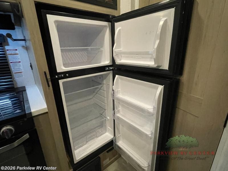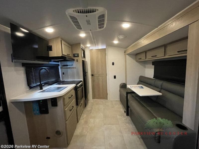 Get ready for a spacious and comfortable trip in this trailer, plus you will have a convenient rear full bathroom with an oversized shower and linen storage to utilize instead of using the campground's facilities. The walk-around full bed gives you two sides with wardrobes to claim as your own. And the kitchen offers full amenities to make meals, and the outside griddle gives you even more choices when cooking. You can relax, dine, or even work from the slide out sofa with a 30" x 15" table and watch the 32" TV. You will find storage along the exterior for your outdoor gear, plus a 14' power awning.
