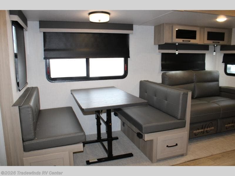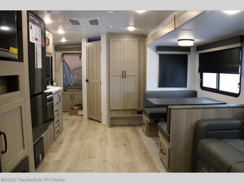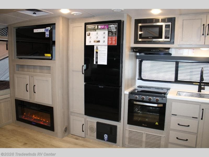 You will feel right at home in this spacious expandable thanks to the large slide out and the fireplace with a TV. Within the slide you'll find a booth dinette and hide-a-bed sofa, or you can choose the optional theater seat in place of the sofa. There is a full kitchen with a three burner cooktop, a 12V refrigerator, plus a microwave oven, and if you enjoy cooking outdoors, you're going to love the outside kitchen! You'll also find an 18' power awning outdoors, along with three exterior storage compartments and Solid Step entry steps.