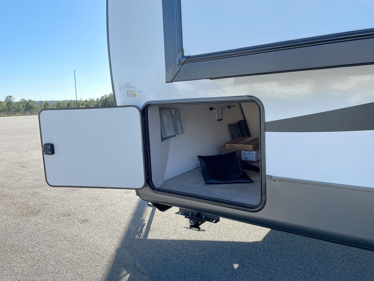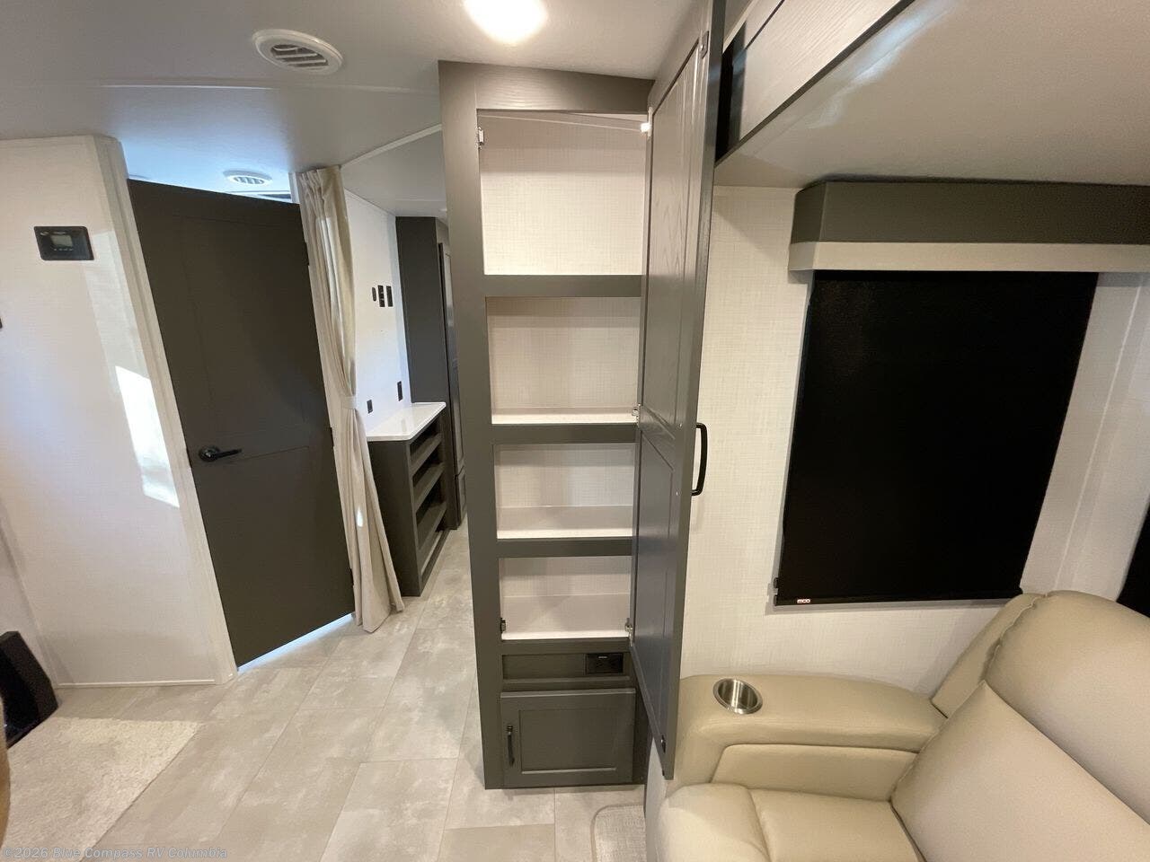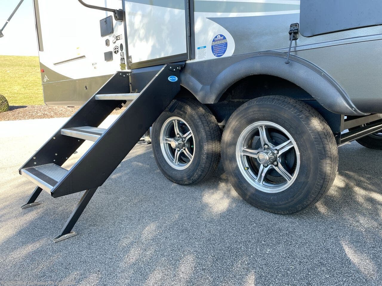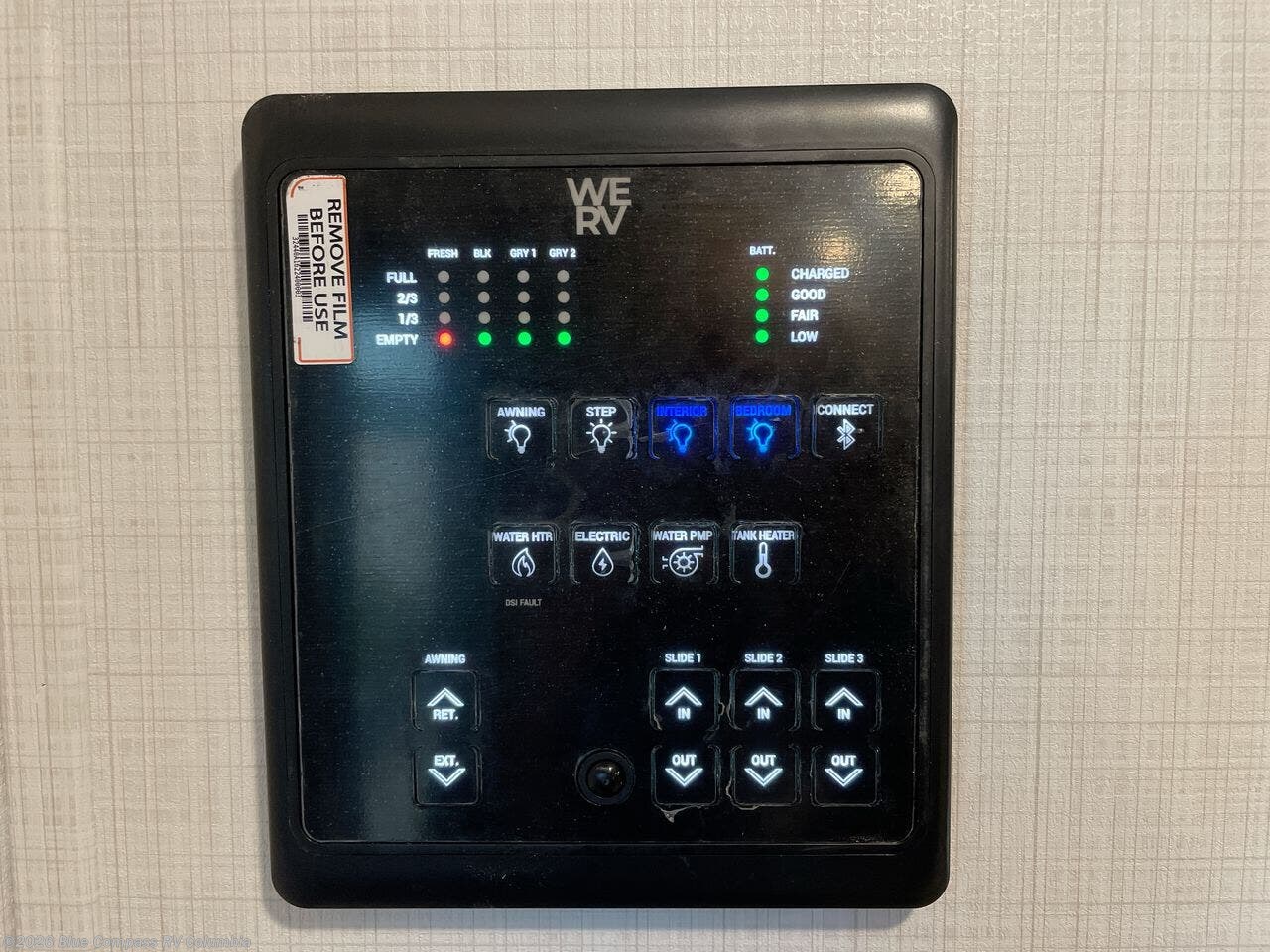 Camping with friends and family has never been easier than with this lightweight travel trailer! There is a semi-private bunkhouse in the rear corner with a privacy curtain, a sofa slide out, and a flip-up bunk. The full bath with its own exterior entry door is close by to make nighttime restroom breaks easy for the little ones, and you'll enjoy the front private bedroom all to yourselves. Here, you can sleep soundly on the queen bed, store your clothes in the wardrobe slide, and sneak out early to fish through the second entry door; how convenient! The middle living area and kitchen includes a third slide out, a theater seat across from the TV, and a countertop with stools where campers can visit with the chef as they cook dinner. Head outside to enjoy the 21' power awning with LED lights, exterior griddle, and pass-thru storage with a steel sliding tray!