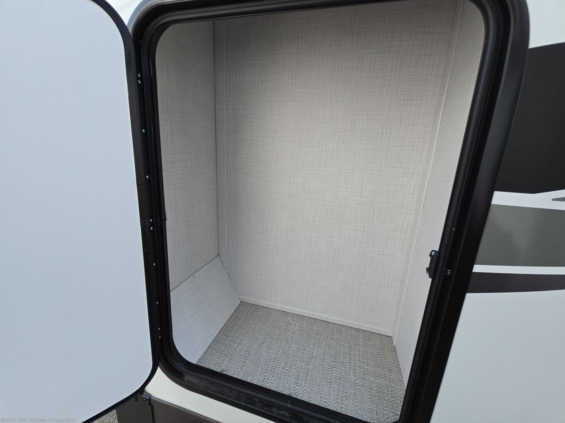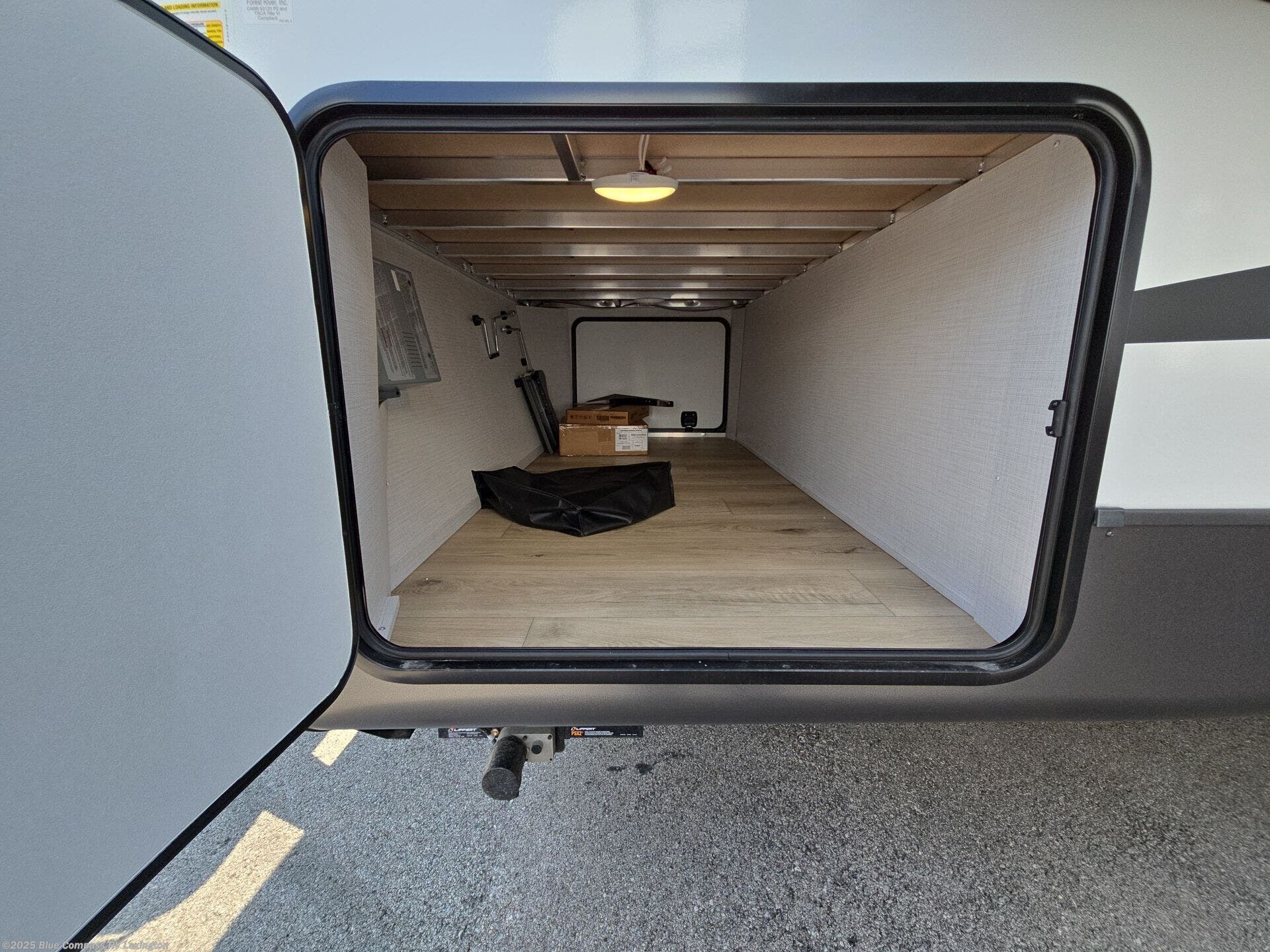 Camping with friends and family has never been easier than with this lightweight travel trailer! There is a semi-private bunkhouse in the rear corner with a privacy curtain, a sofa slide out, and a flip-up bunk. The full bath with its own exterior entry door is close by to make nighttime restroom breaks easy for the little ones, and you'll enjoy the front private bedroom all to yourselves. Here, you can sleep soundly on the queen bed, store your clothes in the wardrobe slide, and sneak out early to fish through the second entry door; how convenient! The middle living area and kitchen includes a third slide out, a theater seat across from the TV, and a countertop with stools where campers can visit with the chef as they cook dinner. Head outside to enjoy the 21' power awning with LED lights, exterior griddle, and pass-thru storage with a steel sliding tray!