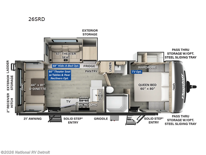 It will be so easy to enjoy time at the campground in this cozy travel trailer. The full kitchen includes a three burner gas oven, a microwave oven, and a 12V refrigerator to cook and store food, and the pantry will let you stock up on snacks. Your crew can get comfortable on the theater seat or around the rear U-shaped dinette, and there is a 12V smart entertainment TV here to make it a movie night. The walk-thru bath will let you freshen up each day, and the queen bed in the front bedroom is sure to bring comfort. You will also find one of the dual entry doors here for convenience plus a wardrobe slide out for more storage and floor space. The exterior is just as accommodating with its pass-thru storage, exterior griddle, and 21' awning!