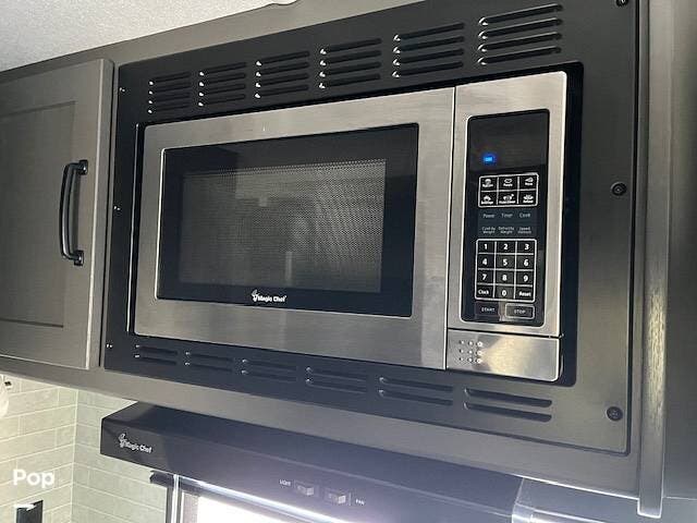 The living area flows into a well-equipped kitchen with solid-surface counters, a 3-burner range, an oven, and a microwave.