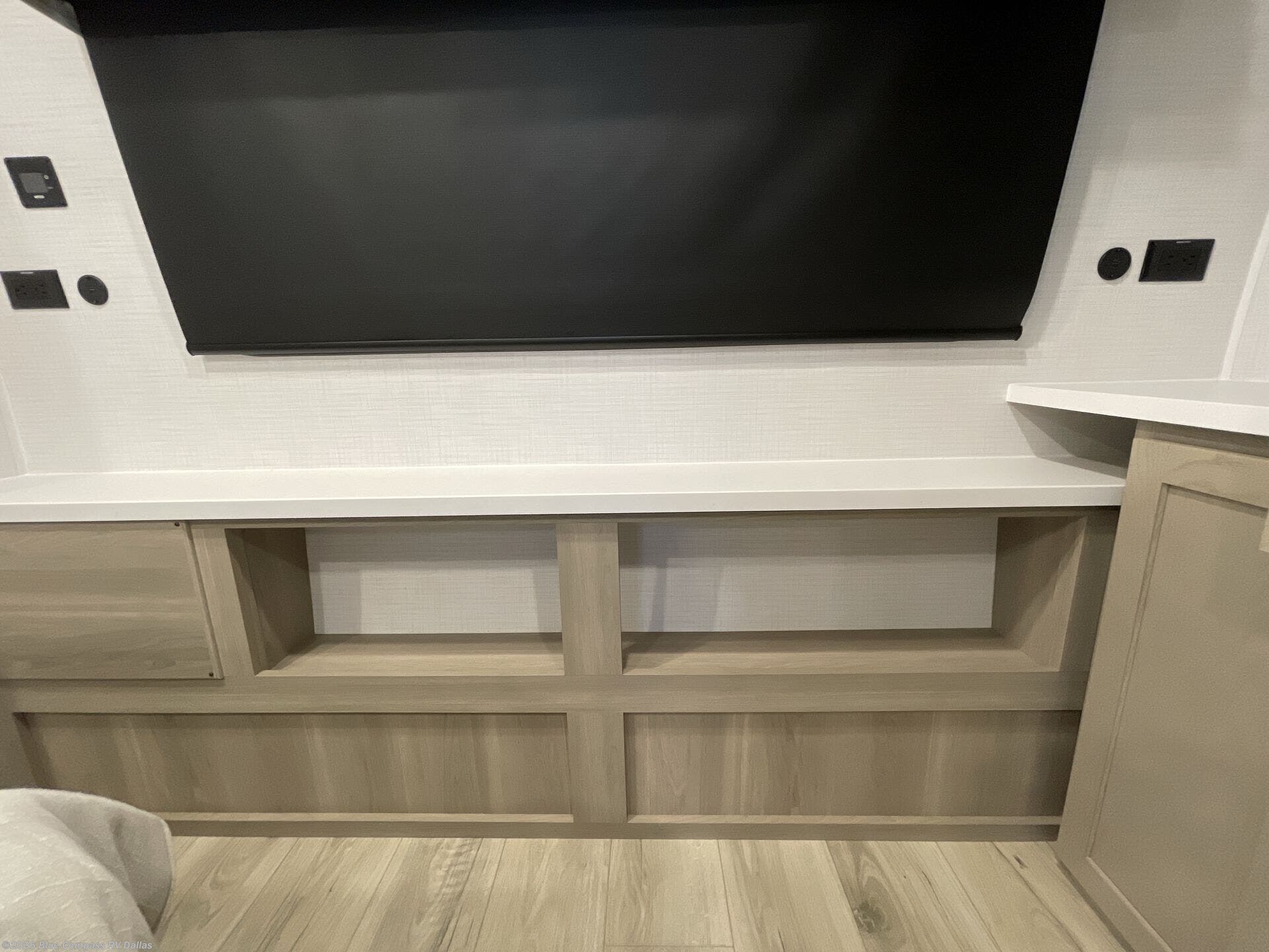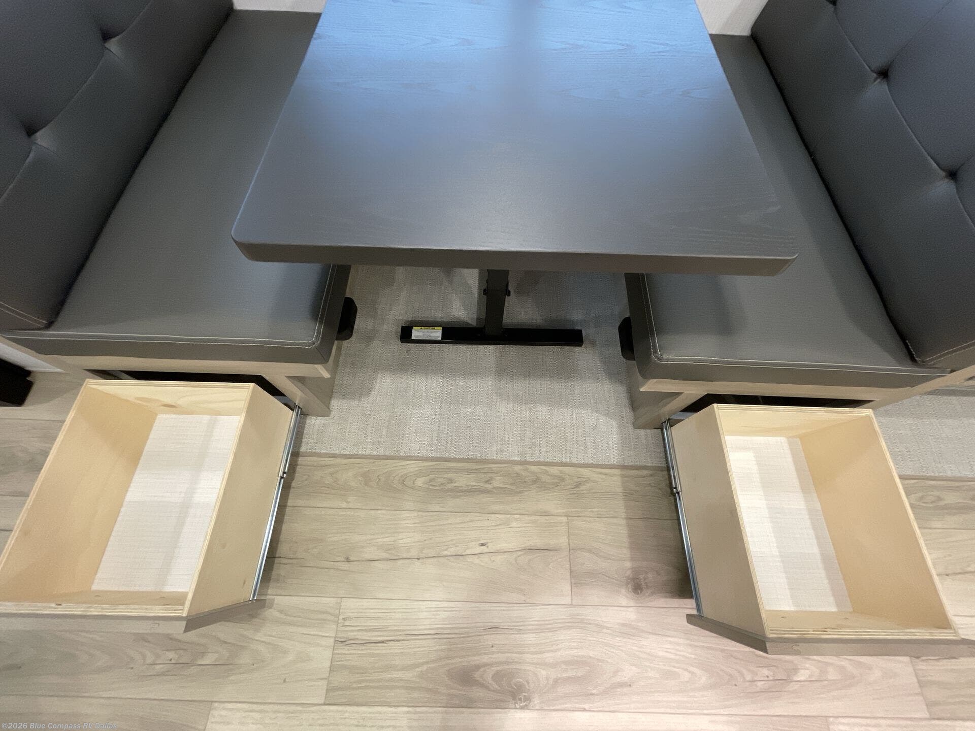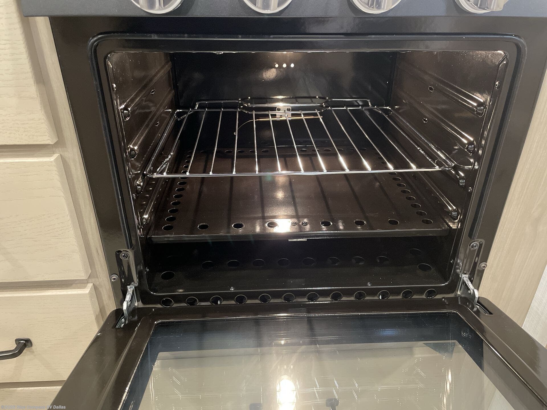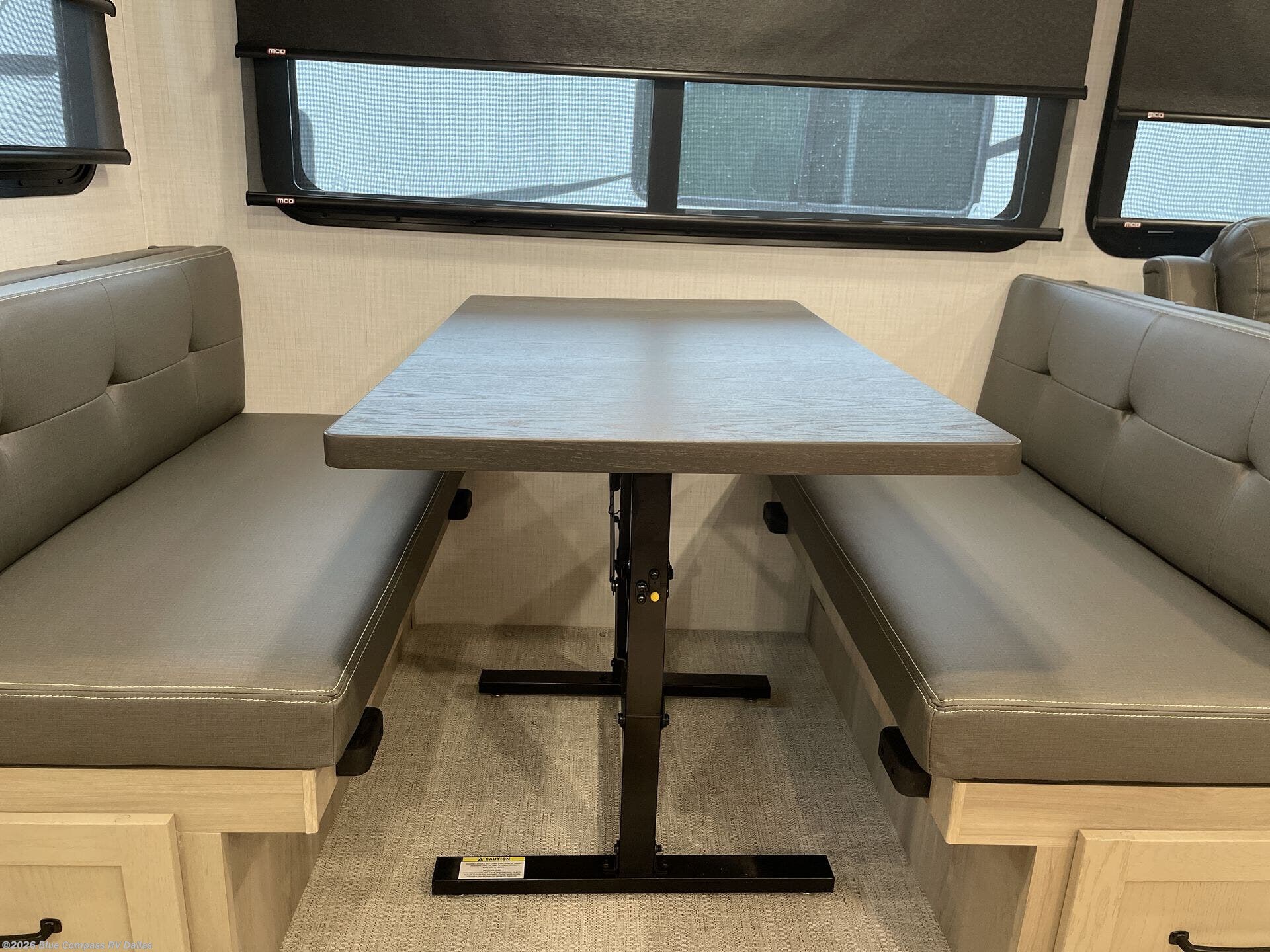 If you enjoy entertaining friends while camping, this trailer offers seating for nine in the combined living and kitchen area on the hide-a-bed sofa, the theater seats and the booth dinette. Everyone can visit, watch the Smart TV and enjoy the fireplace all while the cook is preparing snacks in the kitchen with full amenities. The full bathroom has two entries for convenience, and the front bedroom offers a queen bed slide with a king bed option, plus plenty of storage. And the two 11' awnings offer an outdoor living area after you add your camping chairs.