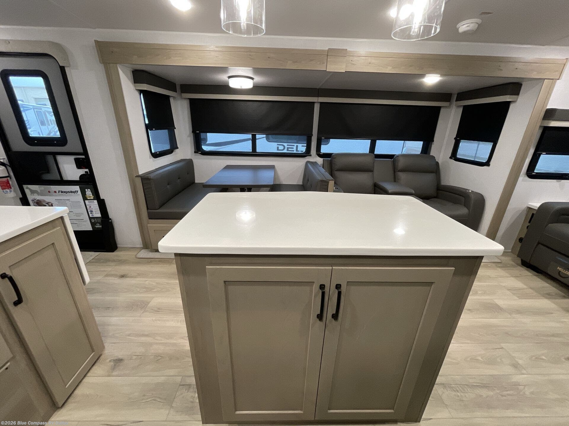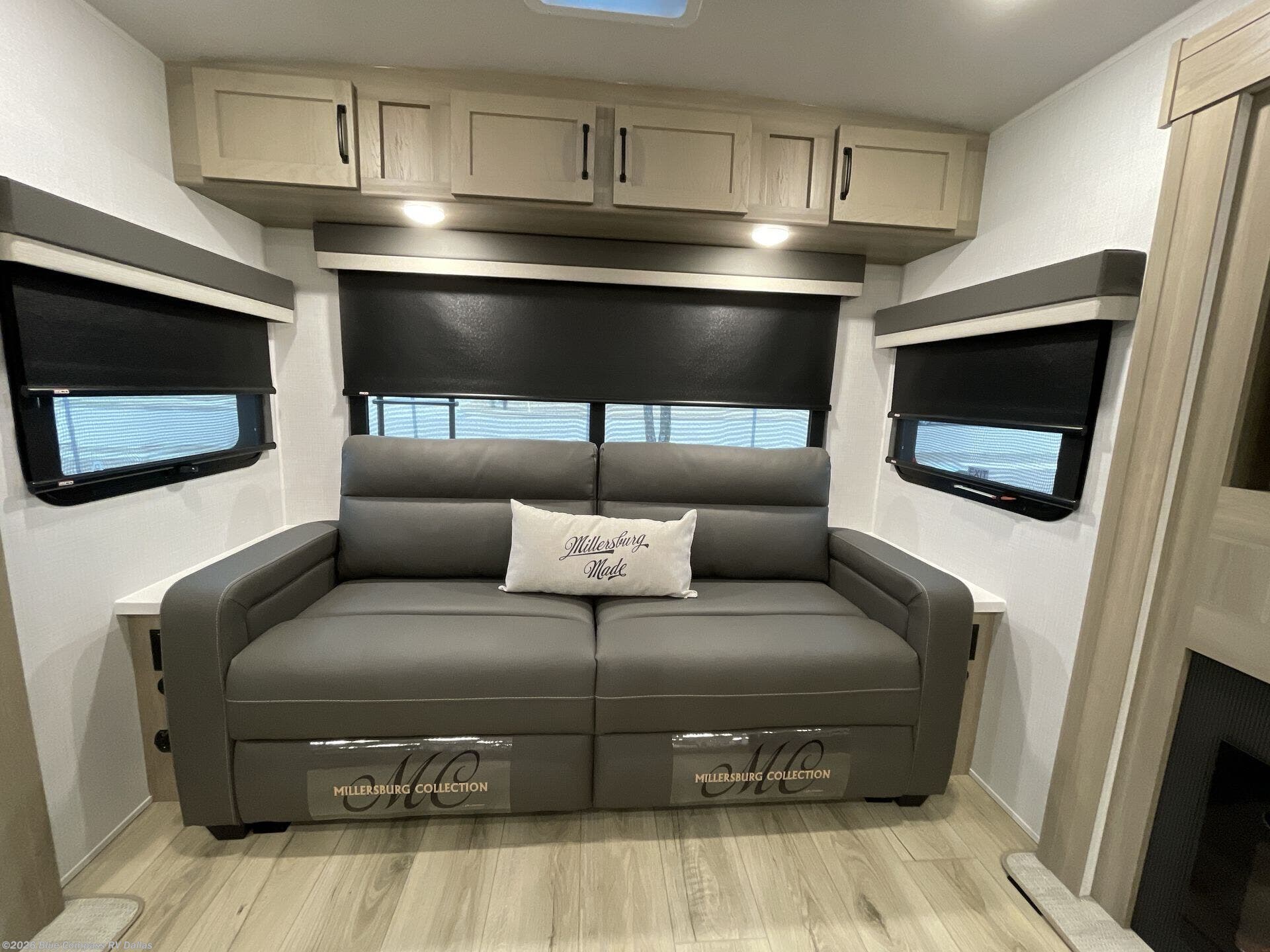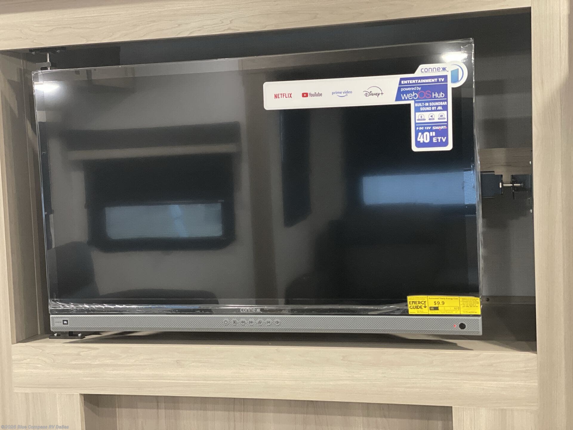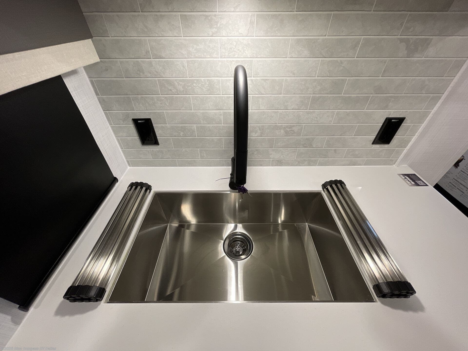 If you enjoy entertaining friends while camping, this trailer offers seating for nine in the combined living and kitchen area on the hide-a-bed sofa, the theater seats and the booth dinette. Everyone can visit, watch the Smart TV and enjoy the fireplace all while the cook is preparing snacks in the kitchen with full amenities. The full bathroom has two entries for convenience, and the front bedroom offers a queen bed slide with a king bed option, plus plenty of storage. And the two 11' awnings offer an outdoor living area after you add your camping chairs.