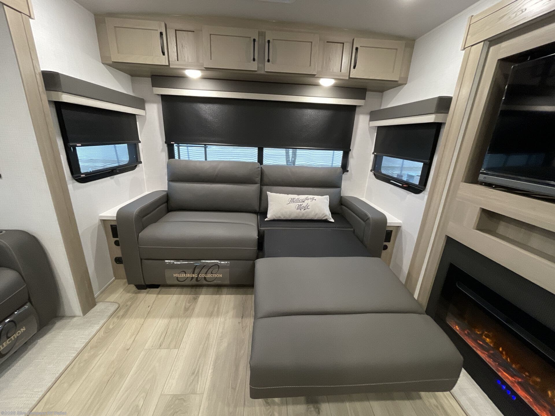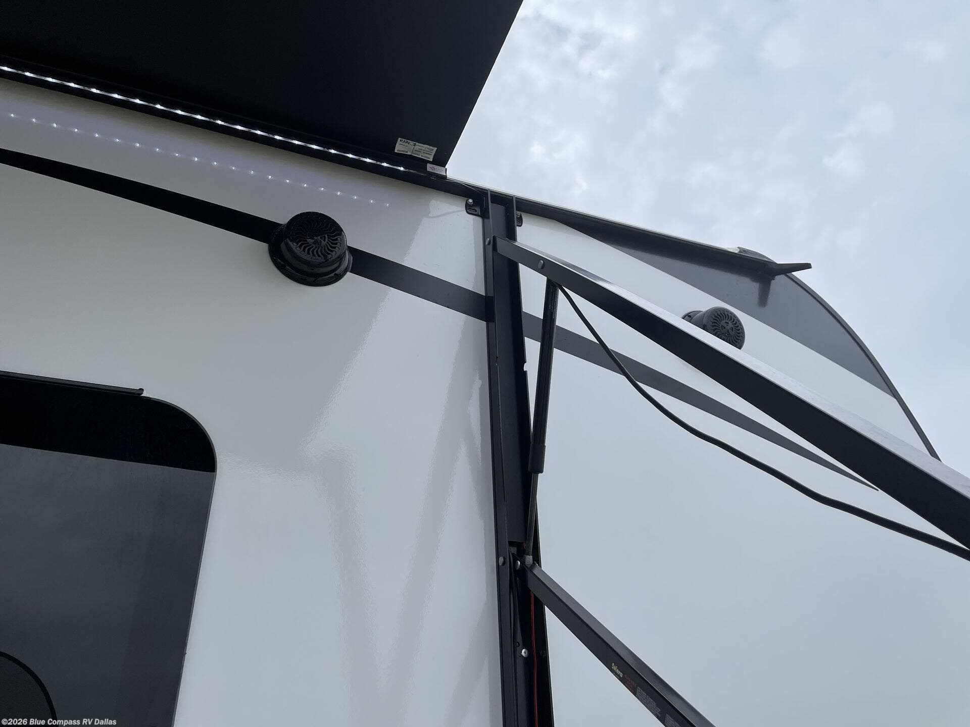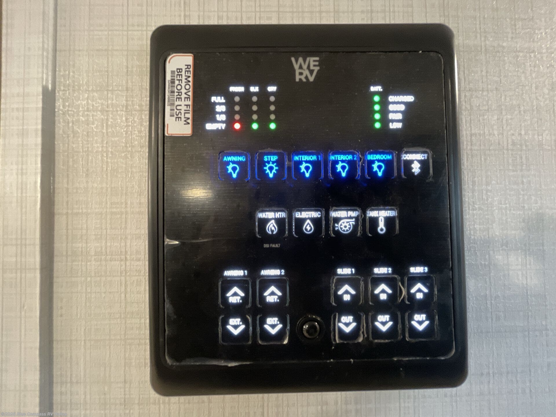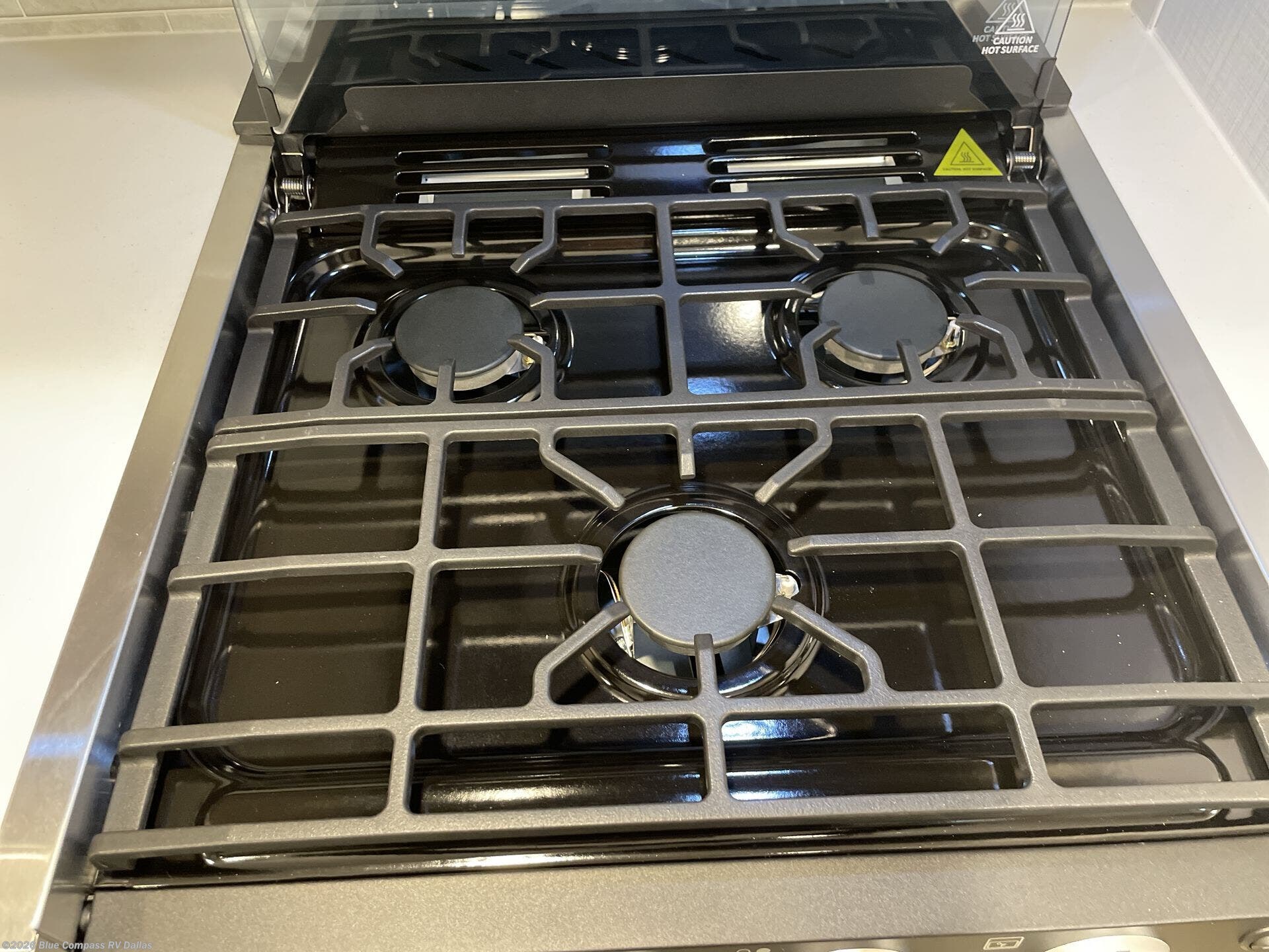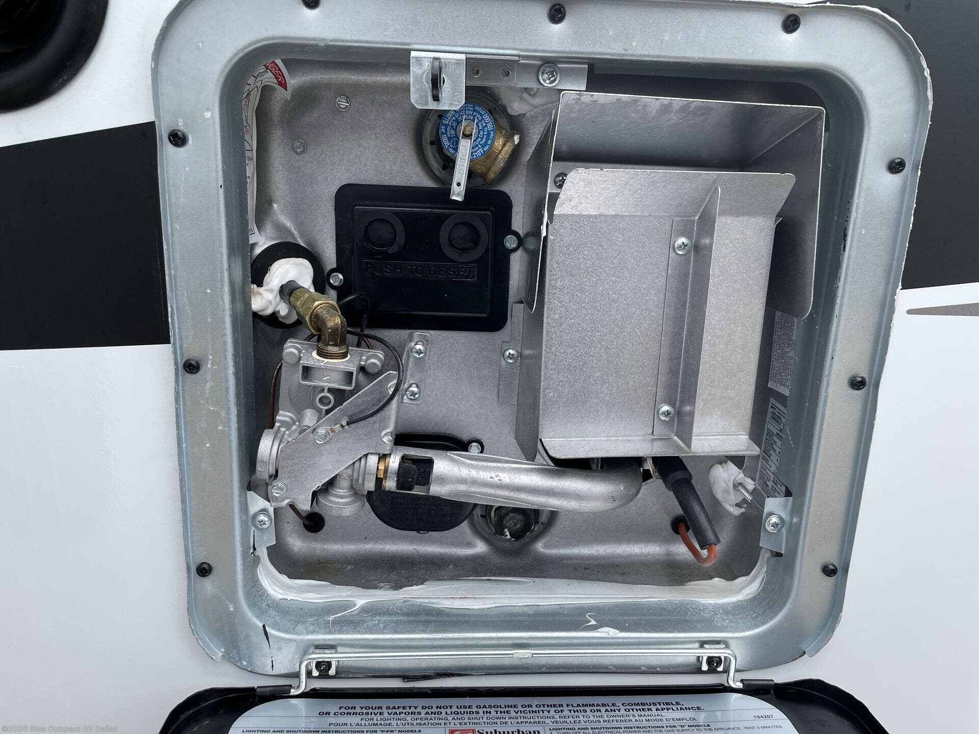 If you enjoy entertaining friends while camping, this trailer offers seating for nine in the combined living and kitchen area on the hide-a-bed sofa, the theater seats and the booth dinette. Everyone can visit, watch the Smart TV and enjoy the fireplace all while the cook is preparing snacks in the kitchen with full amenities. The full bathroom has two entries for convenience, and the front bedroom offers a queen bed slide with a king bed option, plus plenty of storage. And the two 11' awnings offer an outdoor living area after you add your camping chairs.