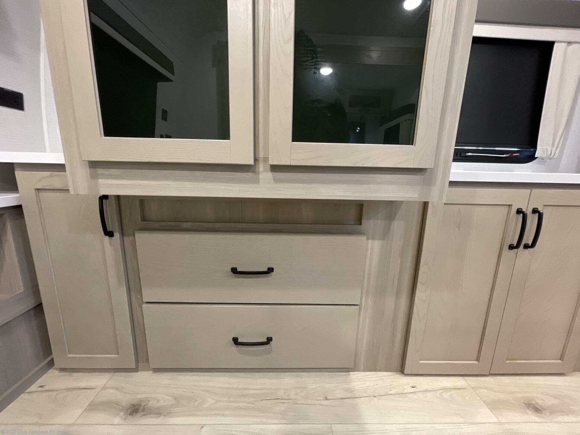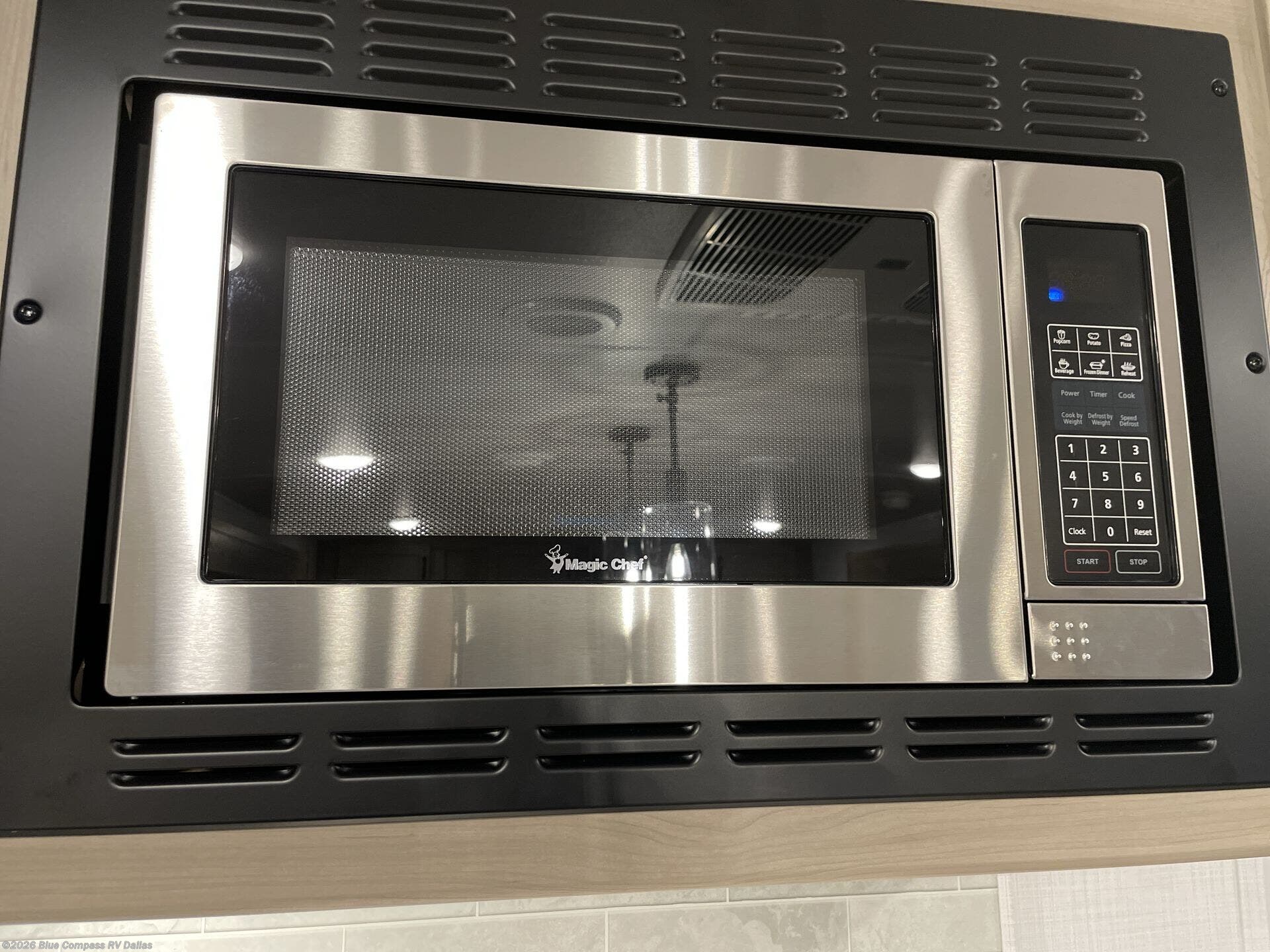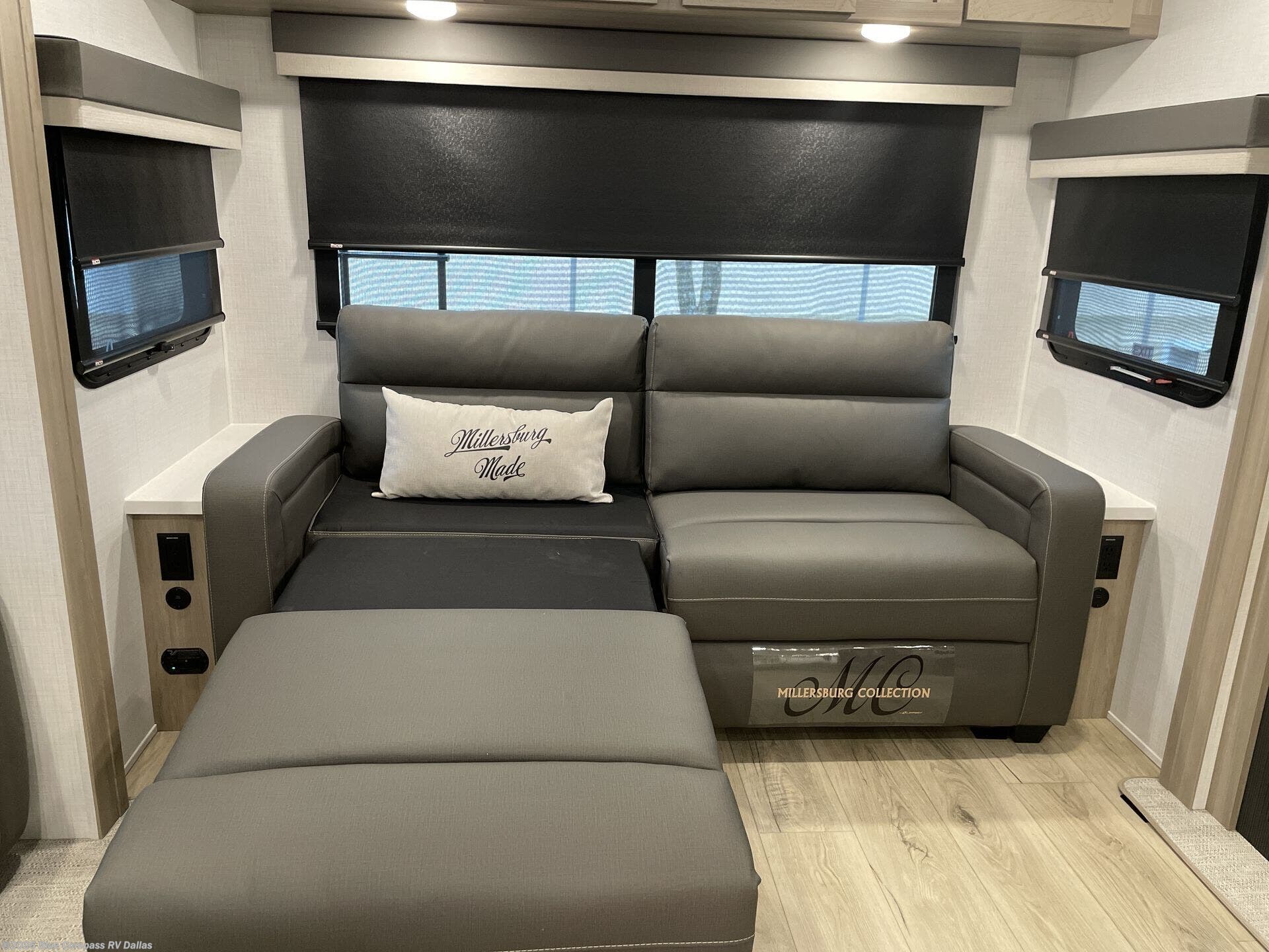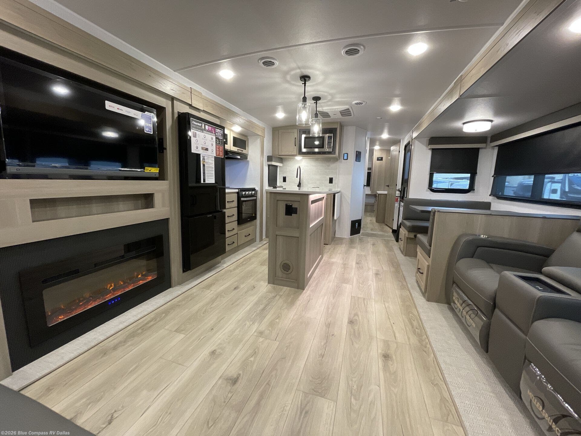 If you enjoy entertaining friends while camping, this trailer offers seating for nine in the combined living and kitchen area on the hide-a-bed sofa, the theater seats and the booth dinette. Everyone can visit, watch the Smart TV and enjoy the fireplace all while the cook is preparing snacks in the kitchen with full amenities. The full bathroom has two entries for convenience, and the front bedroom offers a queen bed slide with a king bed option, plus plenty of storage. And the two 11' awnings offer an outdoor living area after you add your camping chairs.