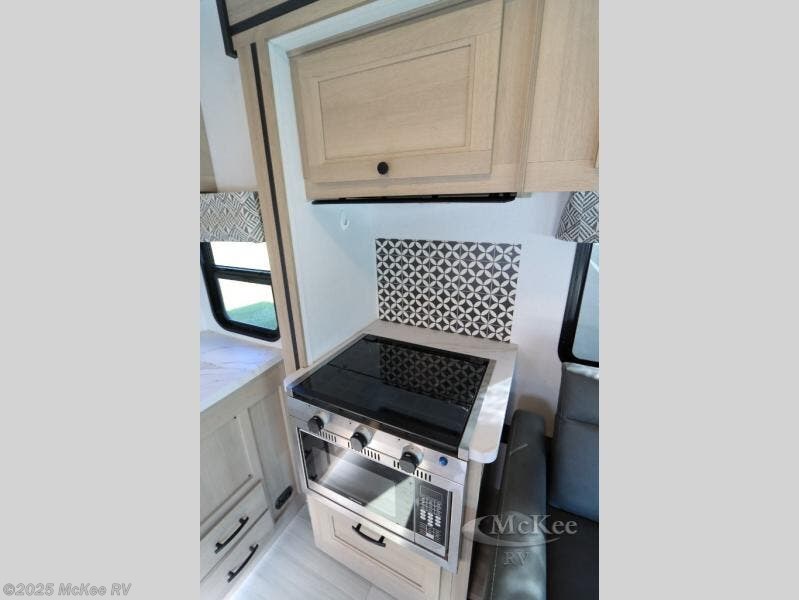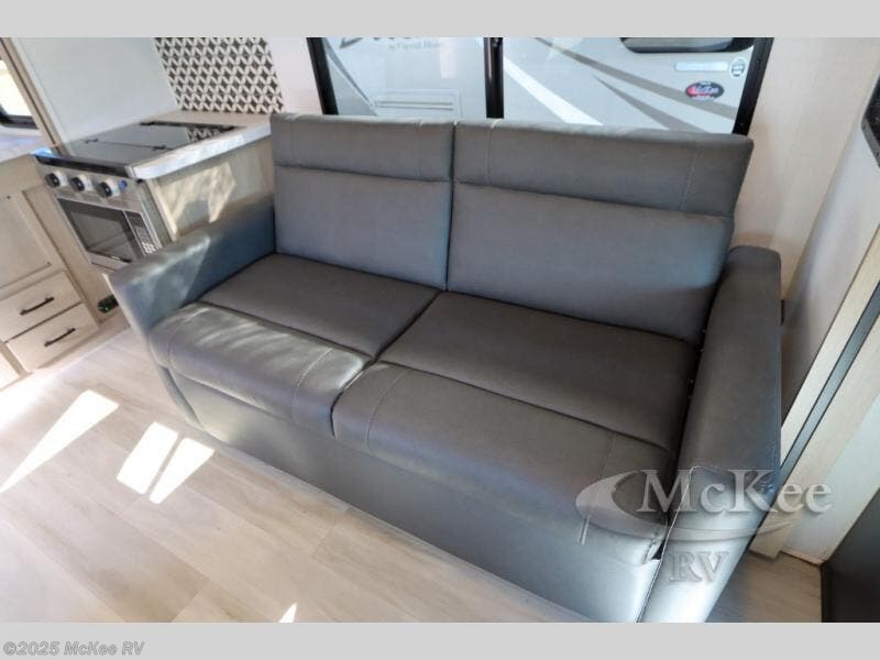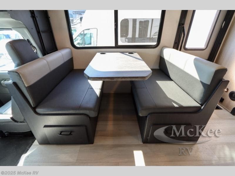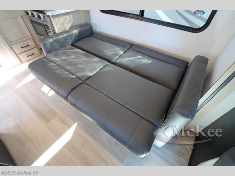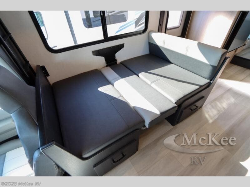The chef will love cooking with this motorhome! They can choose to cook either indoors with the three burner cooktop and flip-up countertop or head to the outside kitchen to breathe in some fresh air while they grill up some juicy burgers on the cooktop. The separated bathroom makes it easy for one to freshen up in the 24" x 36" shower while another uses the private toilet and sink with a medicine cabinet above it. The rear private bedroom has a 60" x 74" queen bed slide with nightstands to set your glass of water and wardrobes on either side of a linen closet with a 12V TV for your entertainment. The booth dinette and sofa also offer comfortable sleeping spaces once converted, as well as the 60" x 80" bunk over cab mat which can be switched out for an optional Trekker cap with a built-in entertainment center!