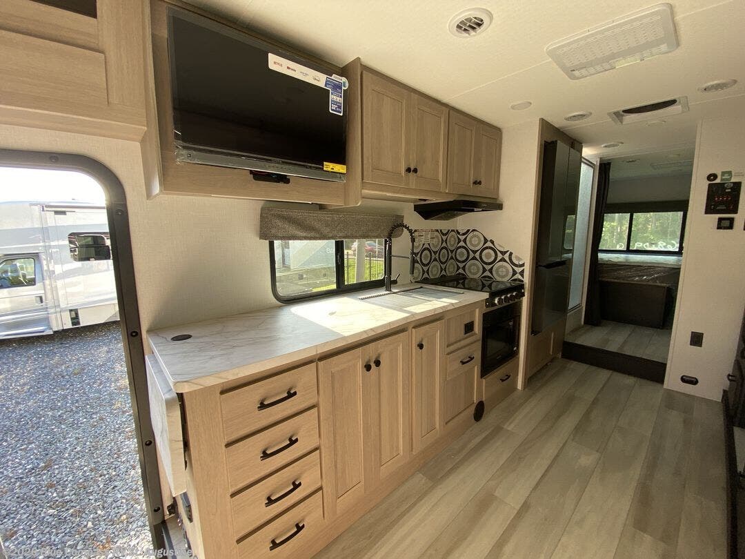 Escape the hustle and bustle of everyday life with this motorhome! It features a 60" x 80" bunk over cab mat which can be switched out for an optional Trekker cap with a built-in entertainment center. The sofa and U-shaped dinette slide offer comfortable places to enjoy meals, socialize, and even sleep once converted. Prepare your best meals with the 10.7 cu. ft. 12V refrigerator, the three burner cooktop, the flip-up countertop, and even the 1.3 cu. ft. undermount convection microwave. The separated bathroom has a 24" x 36" shower across from a toilet with a sink and countertop space, plus it leads directly into the rear private bedroom which has a 60" x 74" queen bed slide across from a linen/12V TV area with wardrobes on either side. You can even add an optional outside 12V TV and stay protected by the 15' 6" power awning!