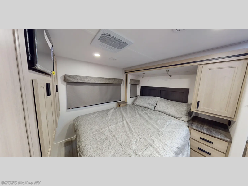 Start traveling in true luxury with this motorhome! The rear private bedroom has a queen bed to lay your head at night, a closet, and wardrobes on either side of the 12V TV. It also leads into the separated bathroom which has a 24" x 36" shower and toilet across from a sink with a medicine cabinet above it. The undermount 1.3 cu. ft. convection microwave will come in handy on those nights when you don't feel like cooking and the flip-up countertop will make your meal prepping easier. You can enjoy your meals at the booth dinette and lay down on the sofa to catch up on your book. The 60" x 80" bunk over cab mat offers a comfortable sleeping space but can be switched out for the optional Trekker cap with a built-in entertainment center!
