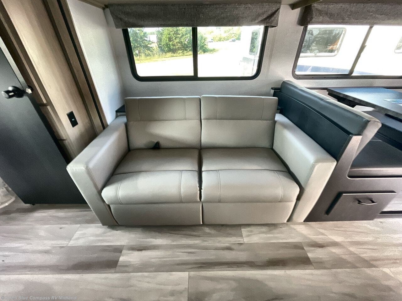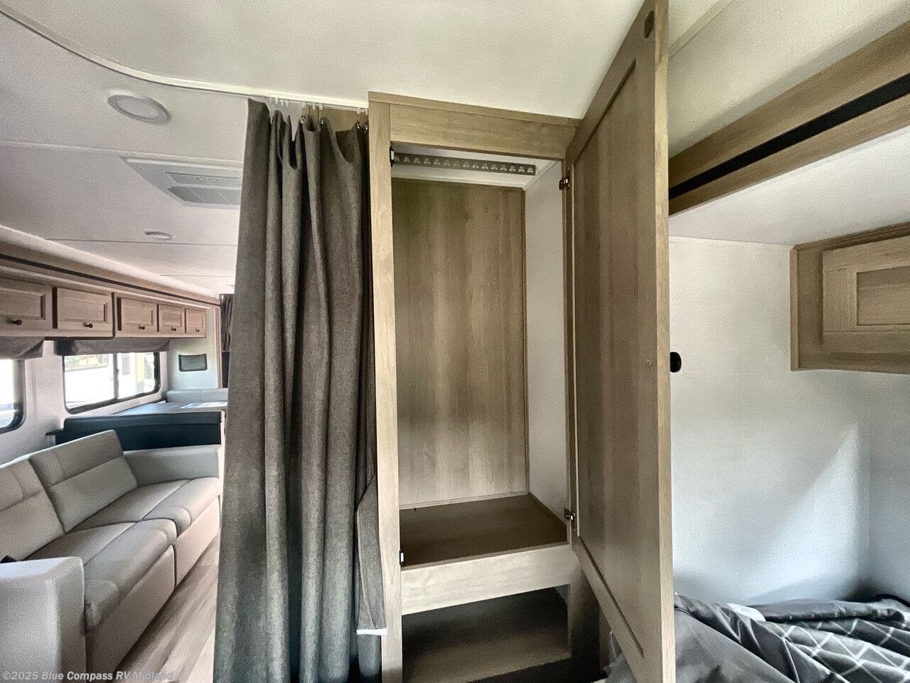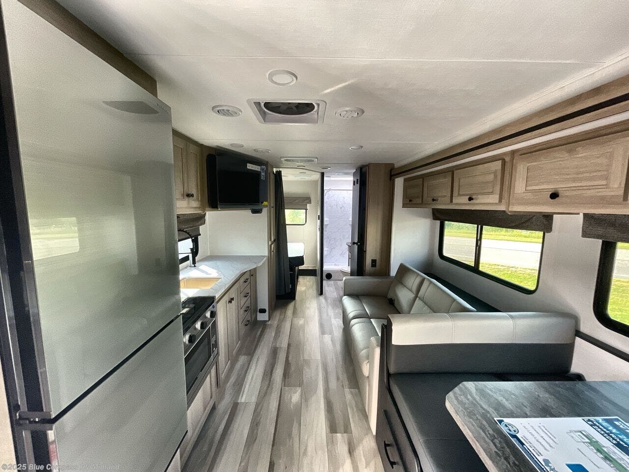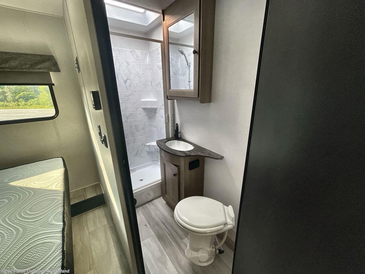 Enjoy trips near and far in this single slide out coach. The kitchen provides a 10.7 cu. ft. 12V refrigerator to store the cold items, a convection microwave and a recessed three-burner range to whip up meals. The private toilet and shower give you a place to get cleaned up, and the bathroom sink is just outside the door. This model includes a queen bed slide out with a wedge mattress, and there is a cab-over bunk for your guests. You can spend your evenings playing cards at the booth dinette, or head outdoors to relax under the 14' power awning with LED lights!